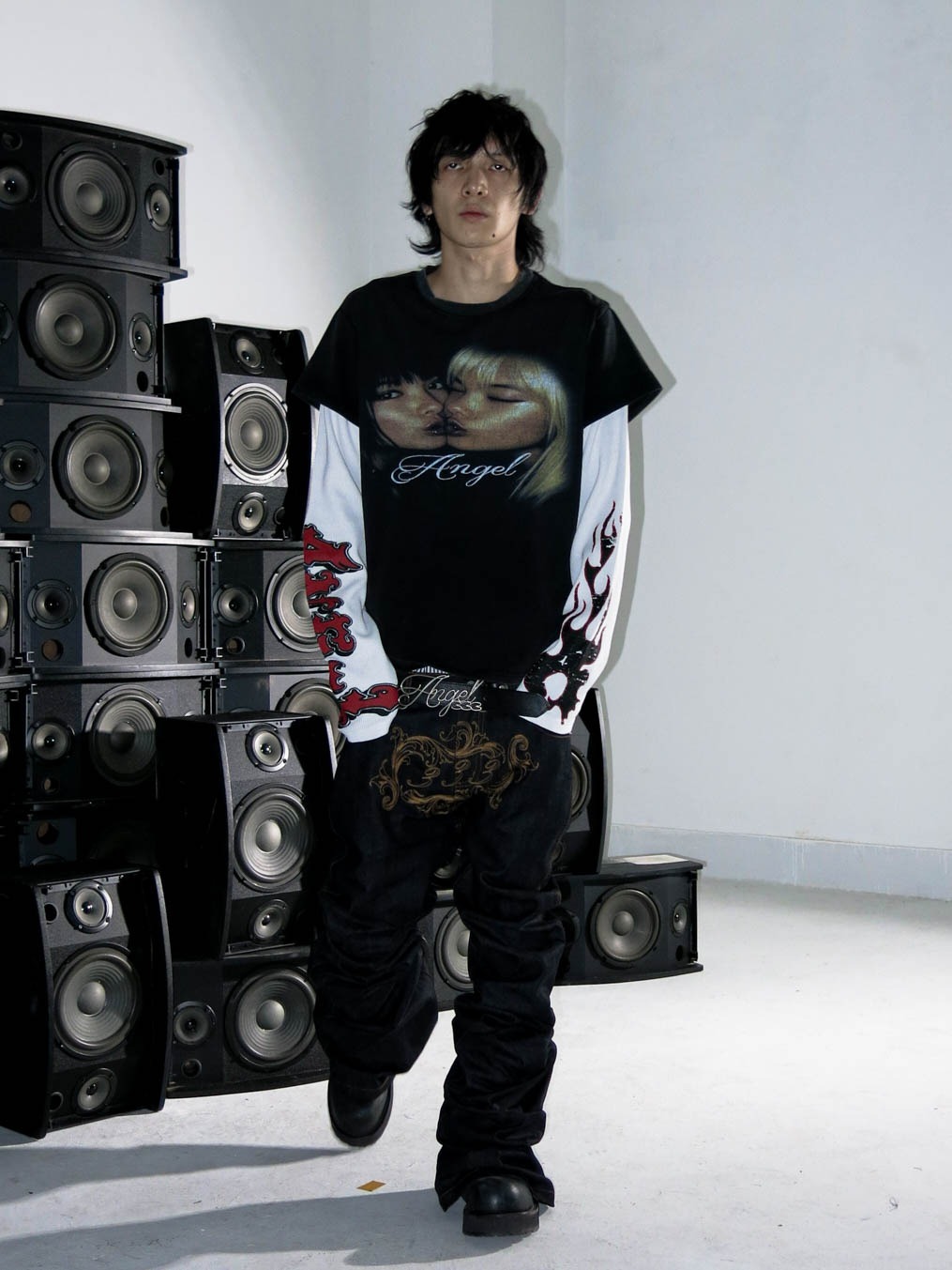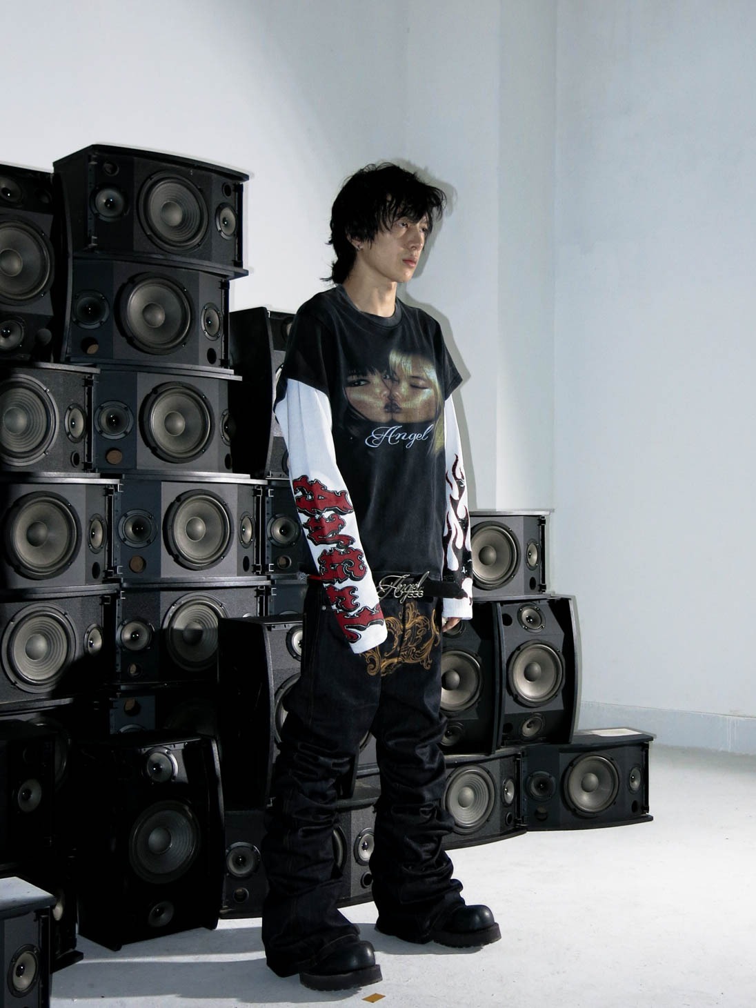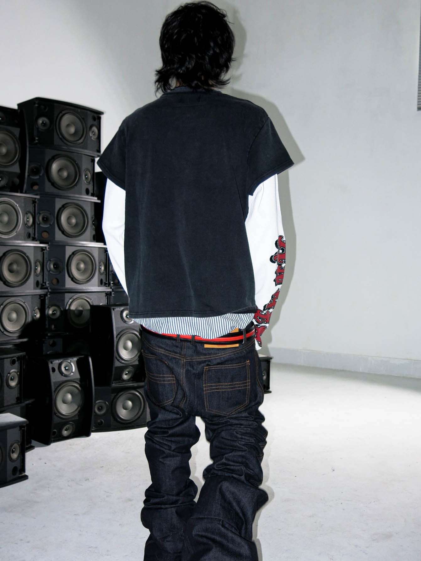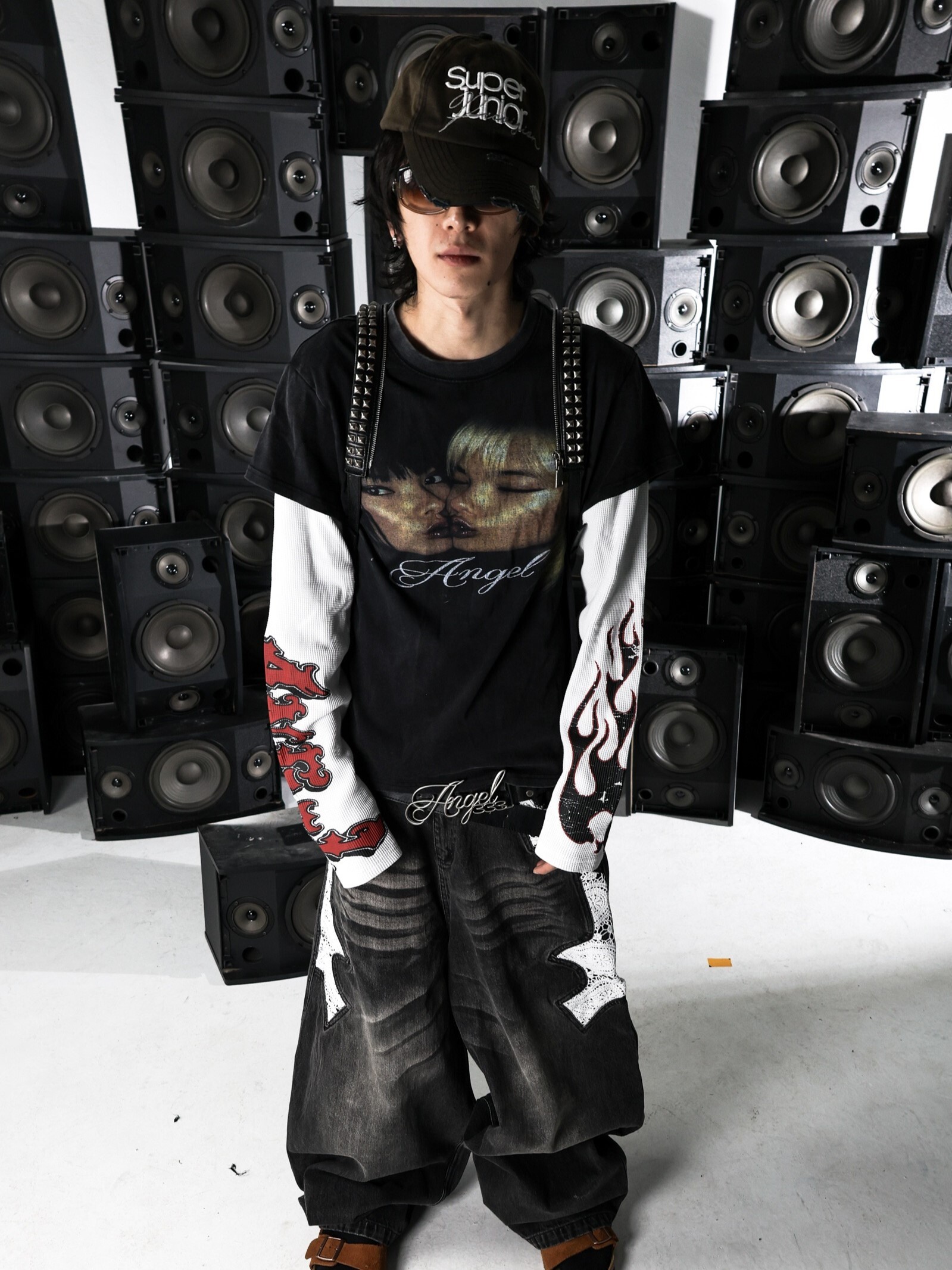 3MAN0N Angel fake two-piece waffle patchwork print washed distressed short-sleeved T-shirt