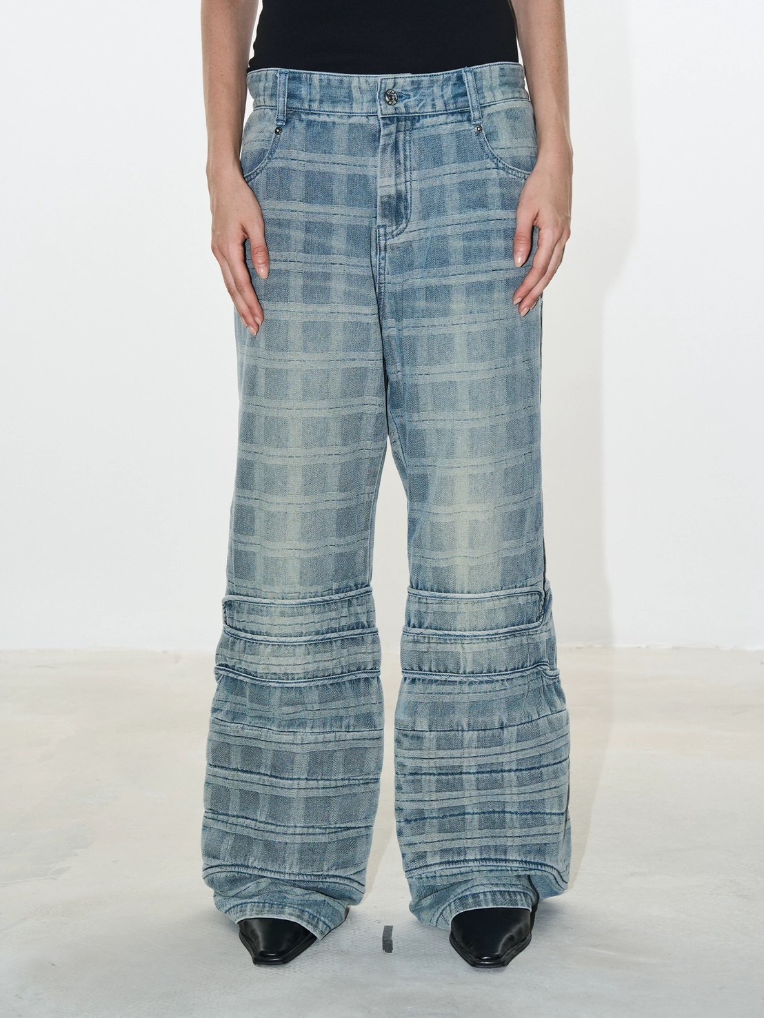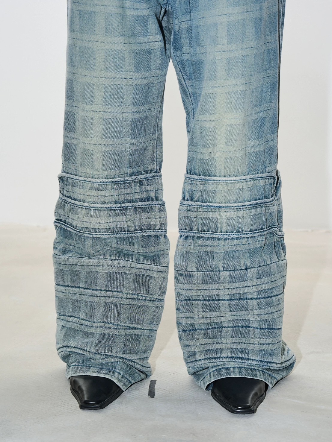 BLINDNOPLAN Checked crinkled patchwork bootcut jeans