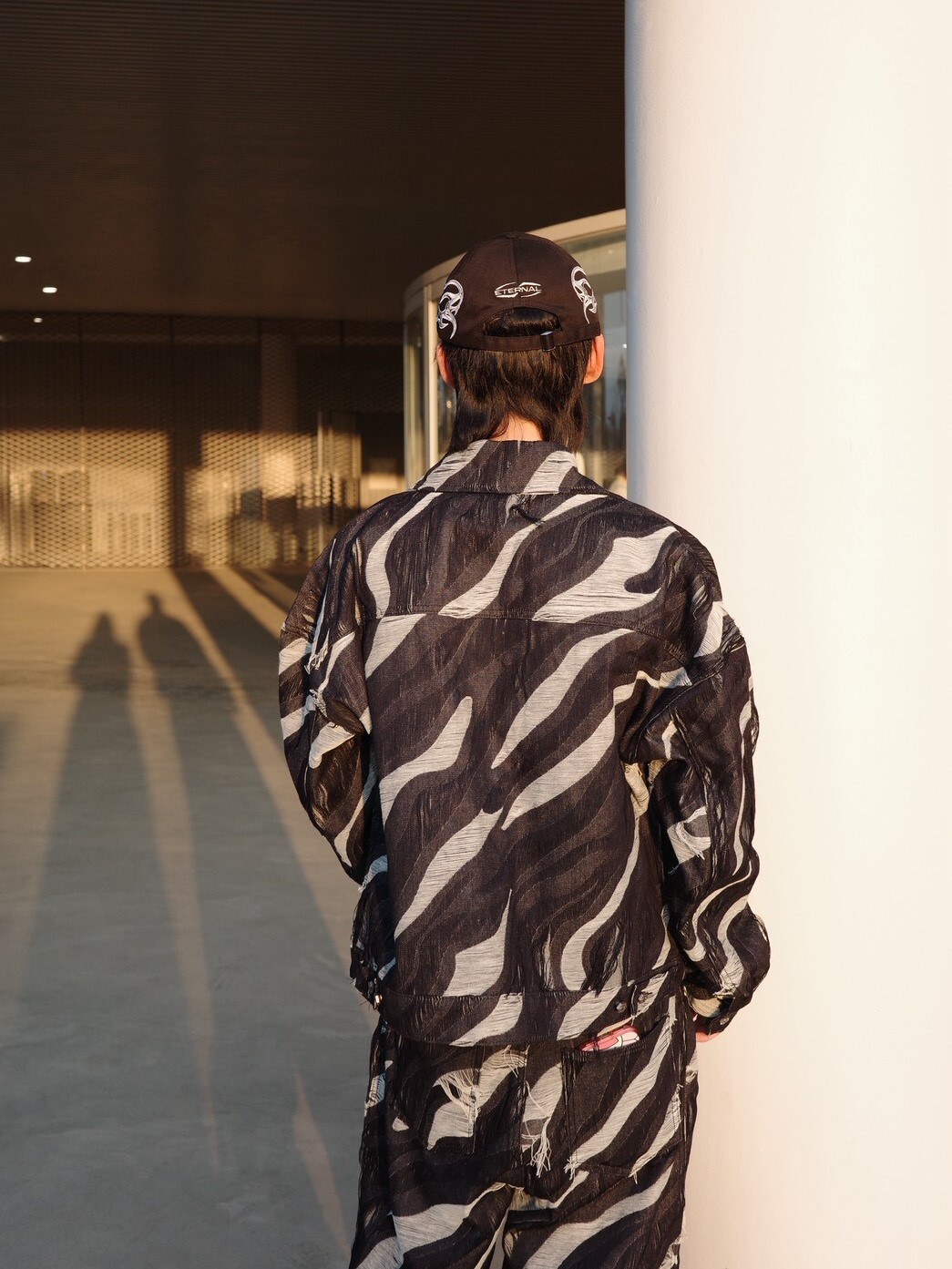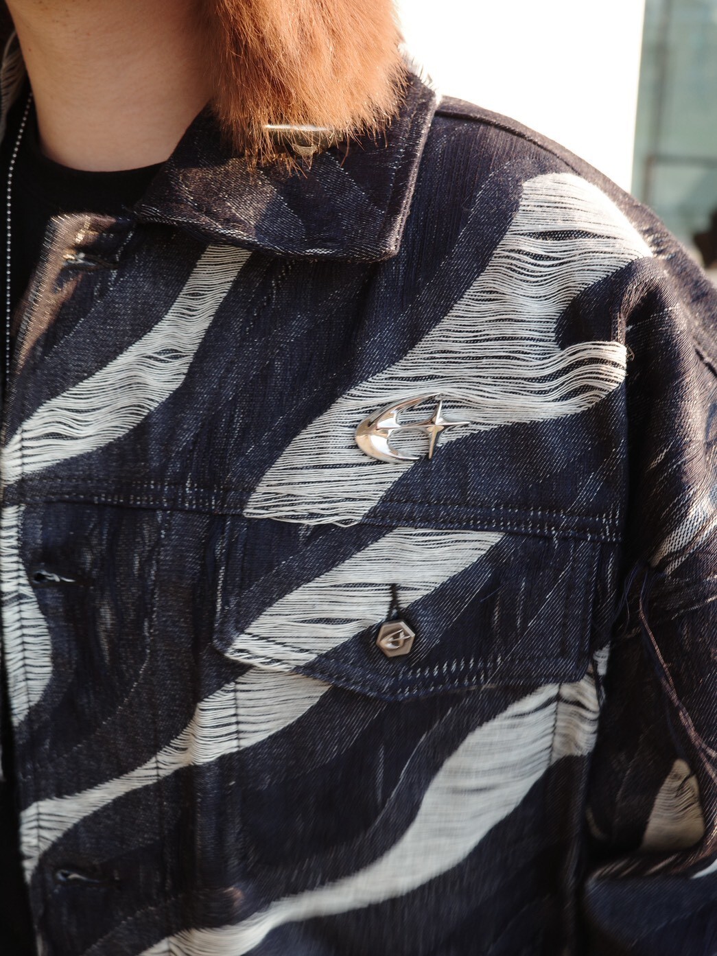 ETERNAL Metal Logo Black All-over Tiger Stripe Distressed Short Denim Jacket