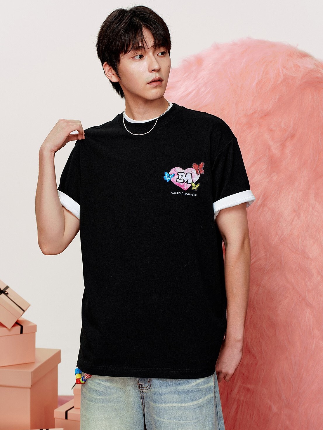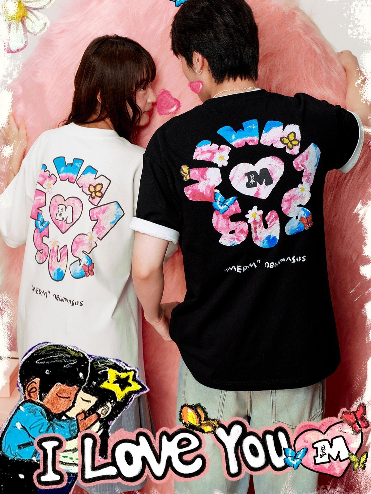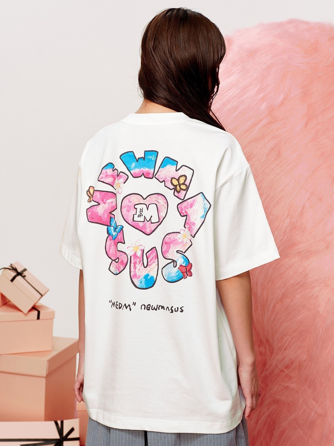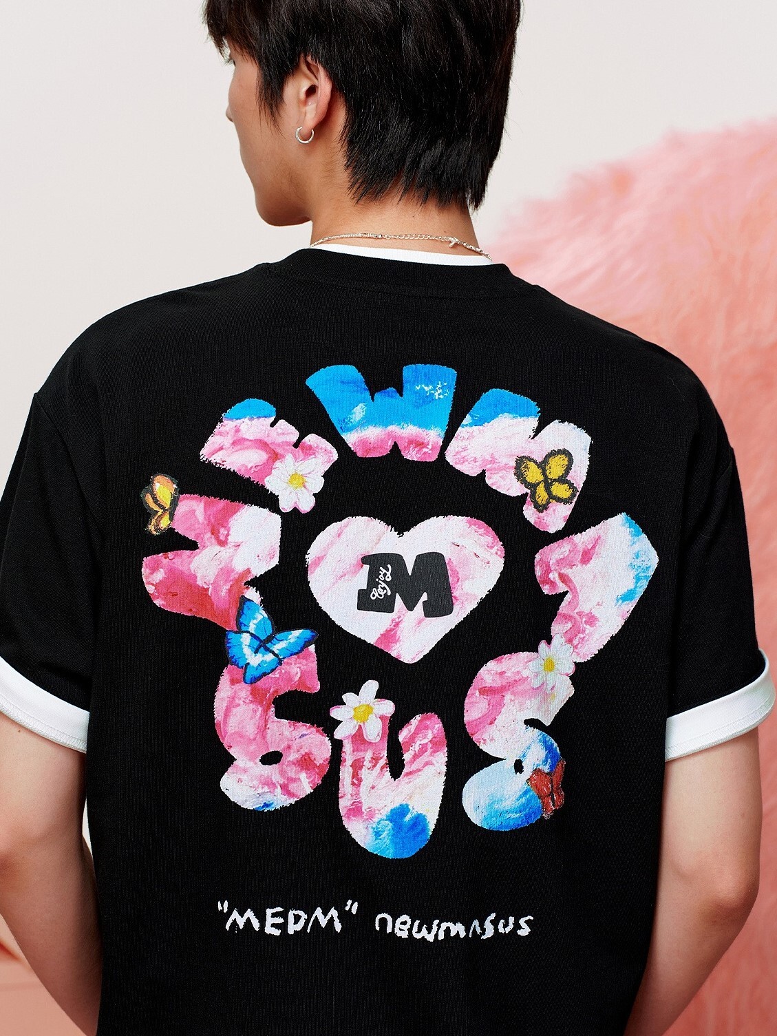 MEDM x NEWMASUS heart, butterfly, and flower-surrounded short-sleeved T-shirt