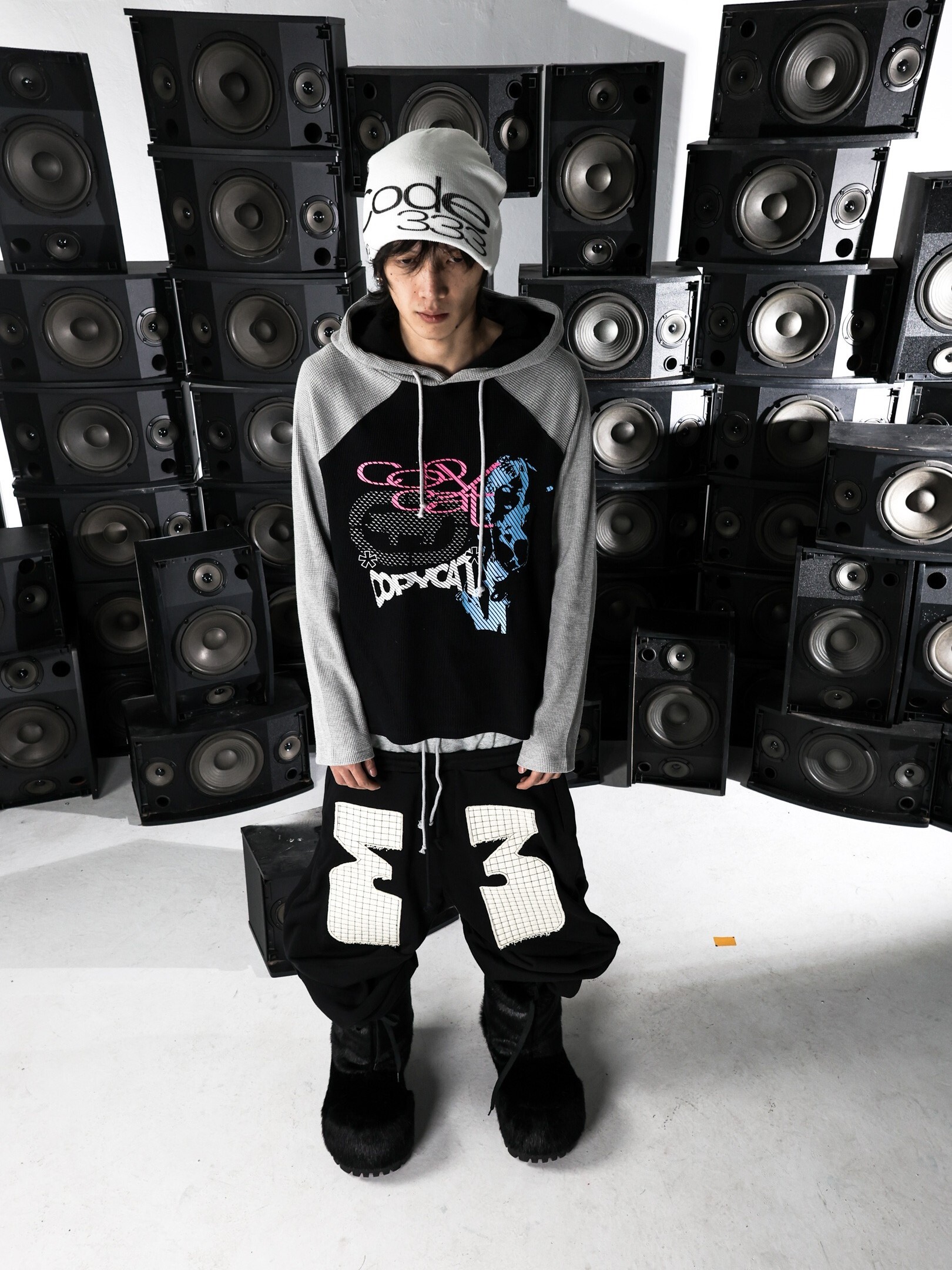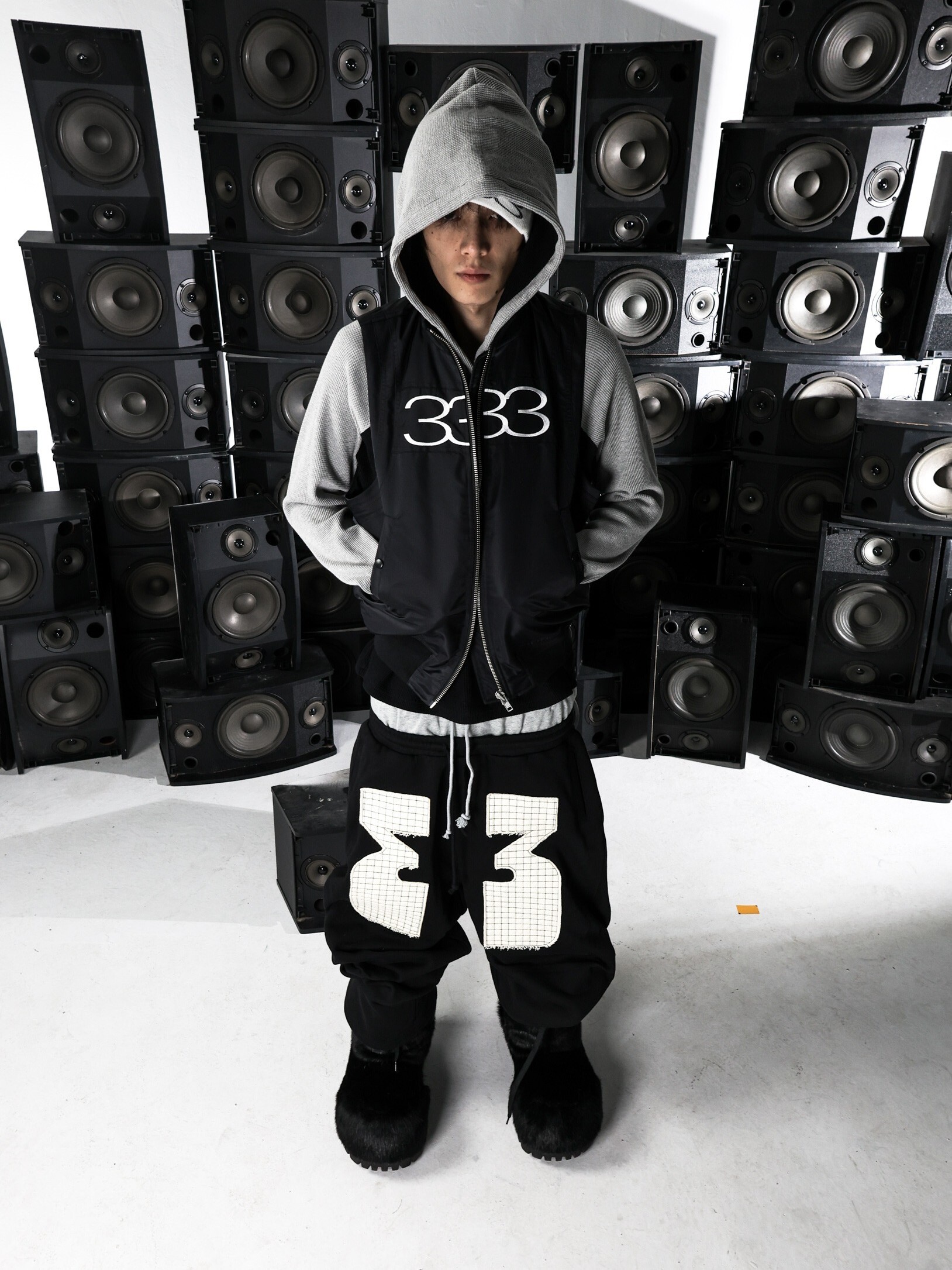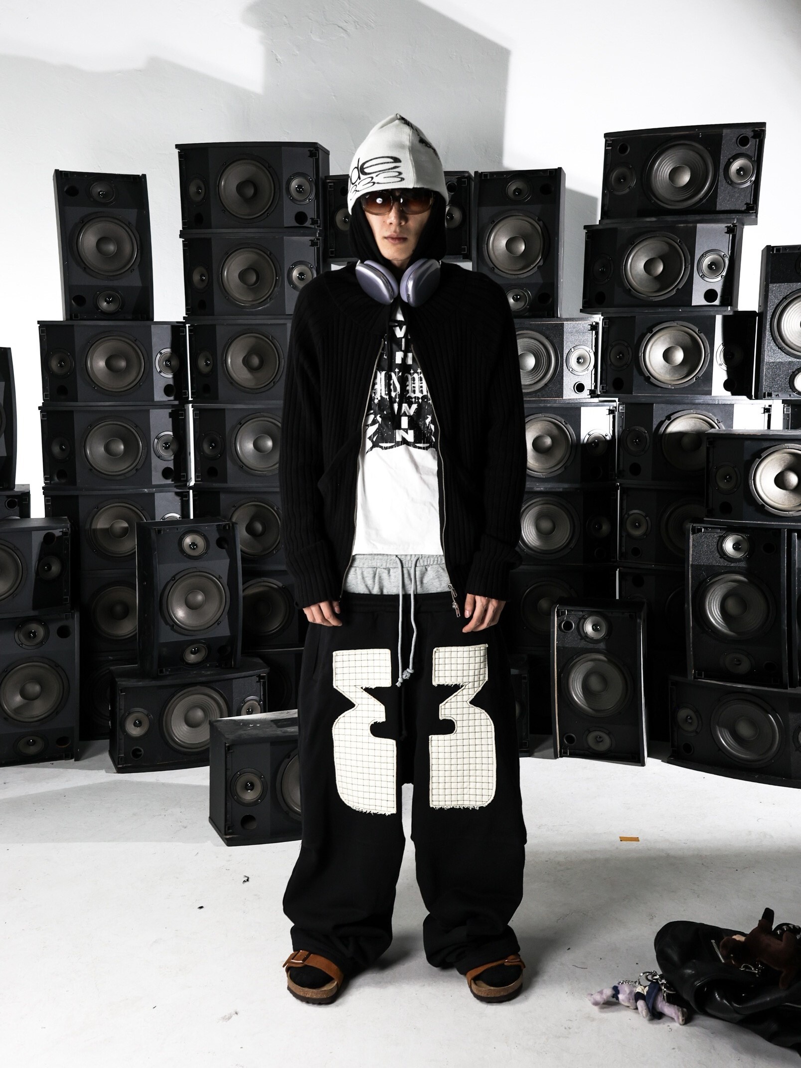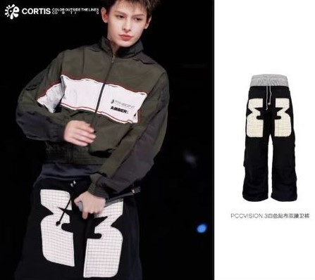 PCCVISION 3MAN0N, as worn by Zhao Yufan, features a white number 3 patch, double waist pleats, and a loose fit. These are loose-fitting cotton trousers.