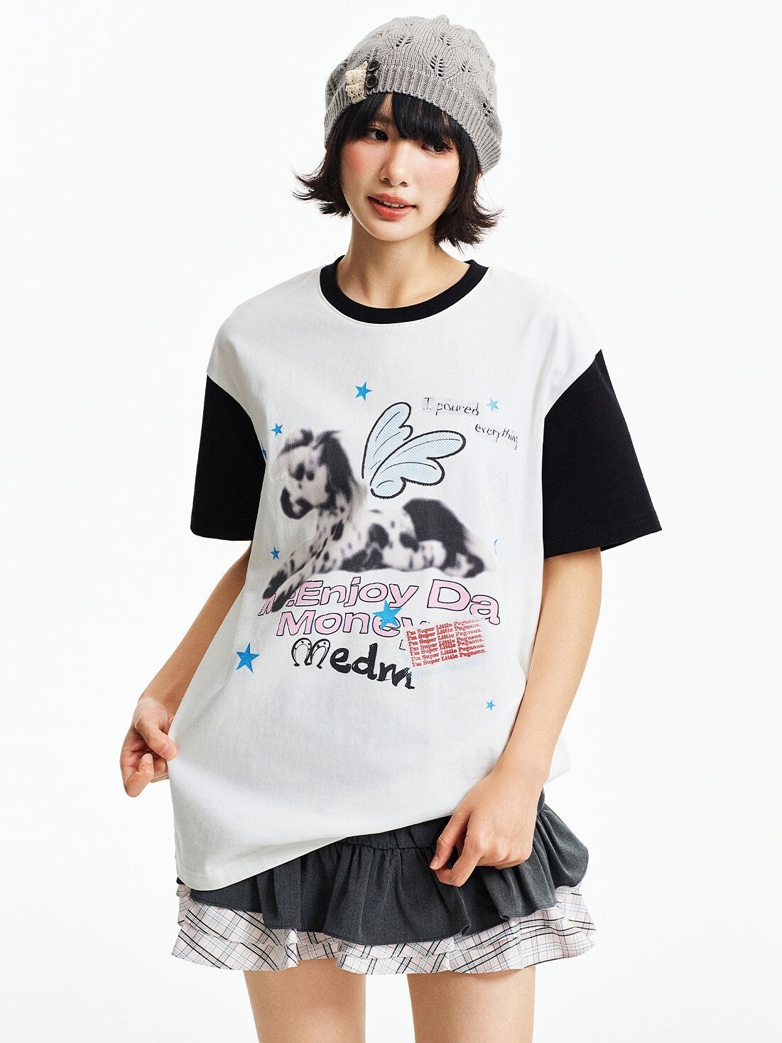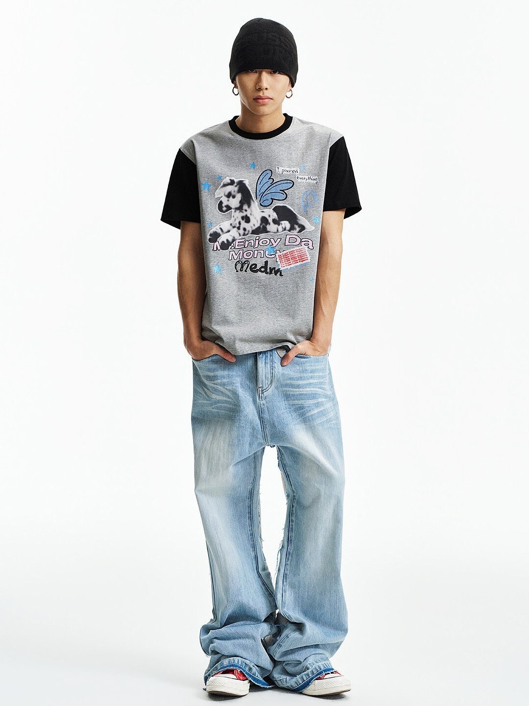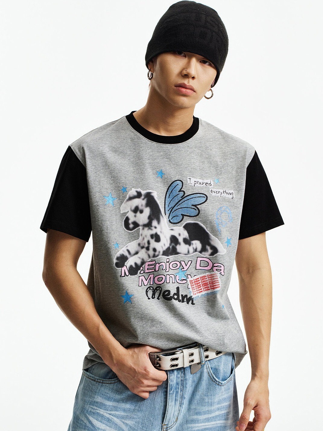 MEDM 模糊小馬印花 星星閃粉 拼接袖子 短袖T
