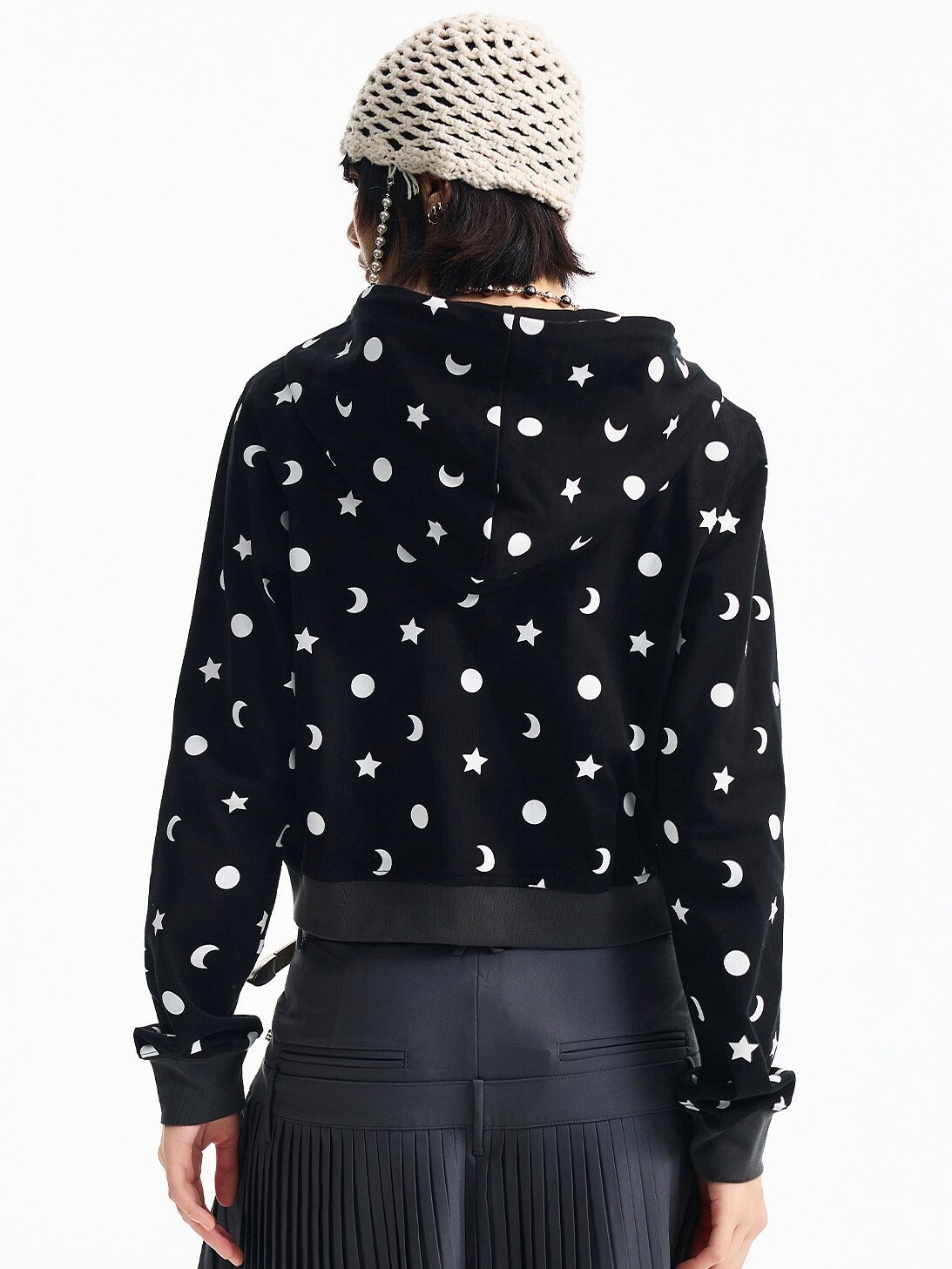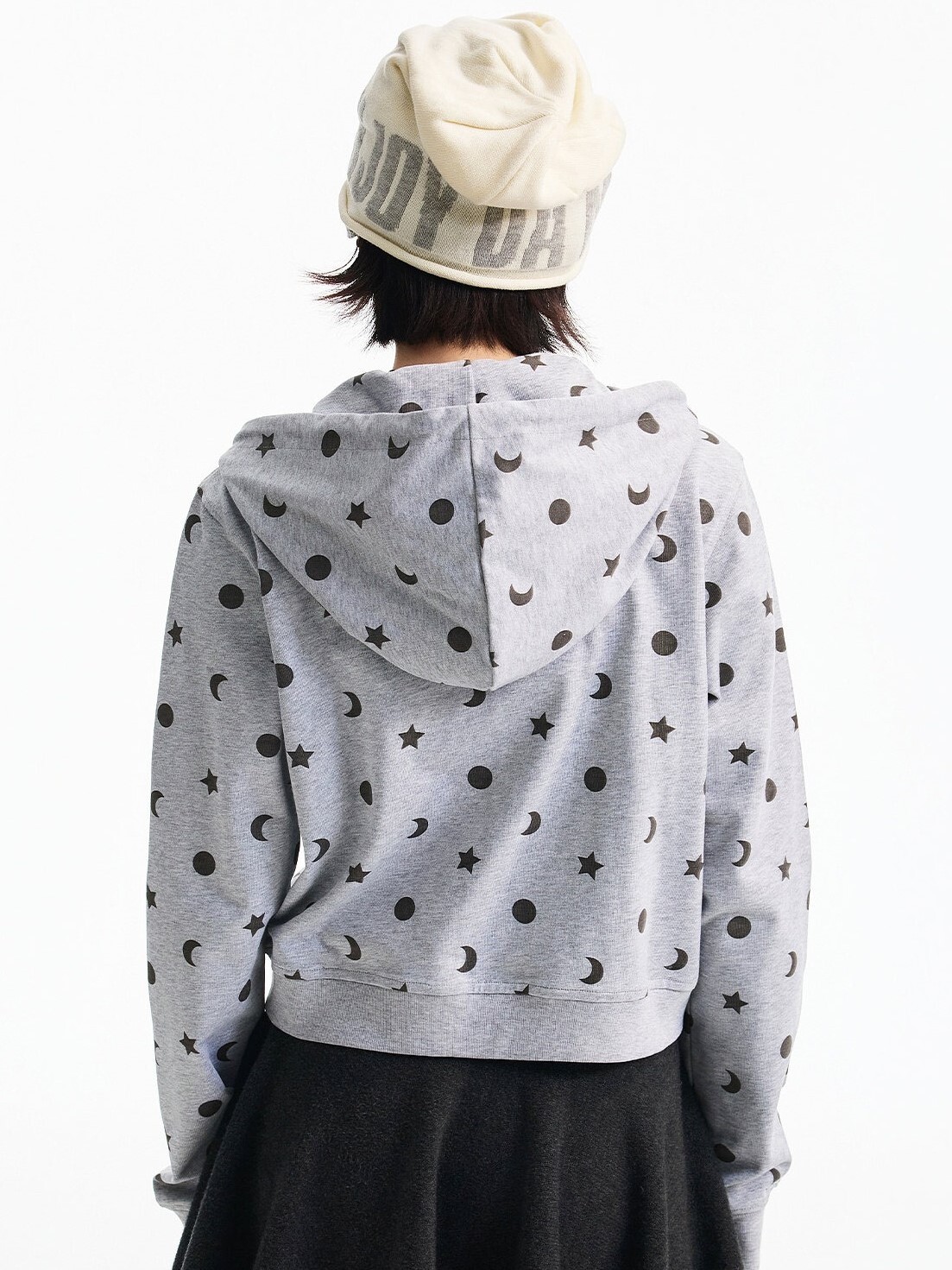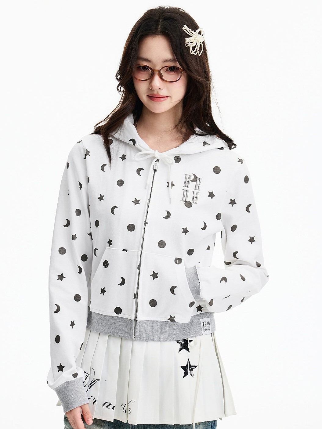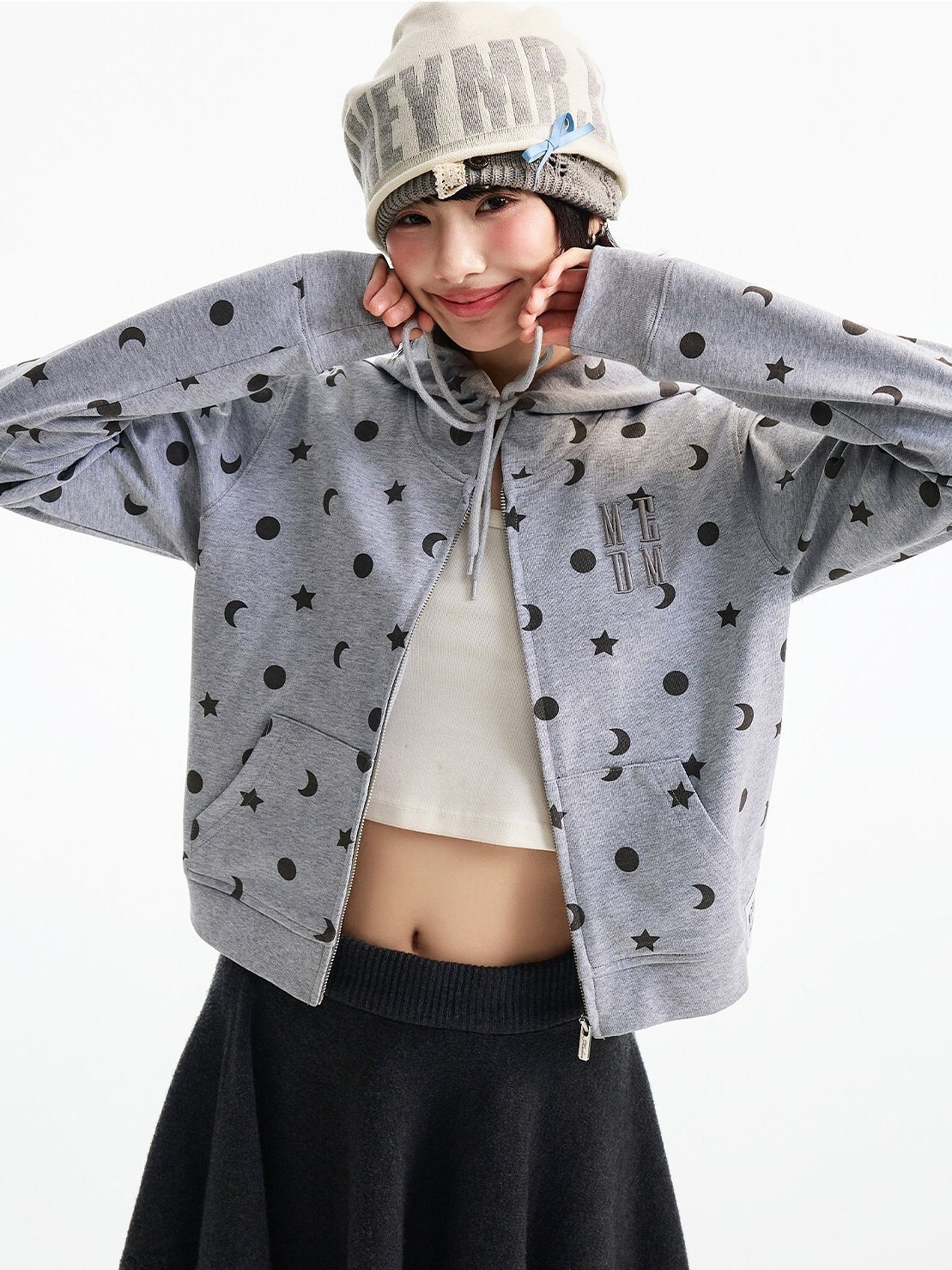 MEDM 胸前刺繡Logo 正肩短版 滿印日月星 休閒 抽繩連帽 外套