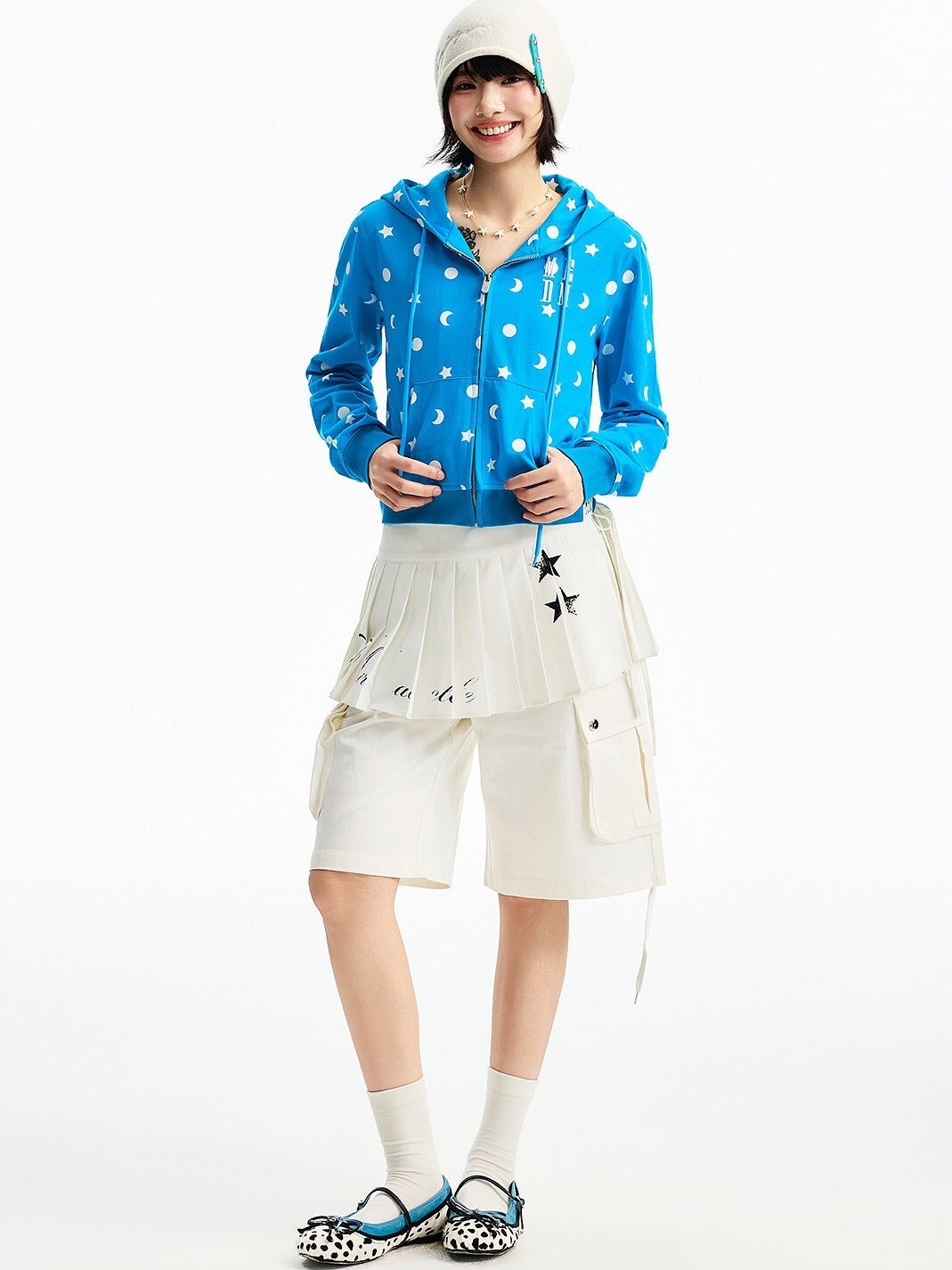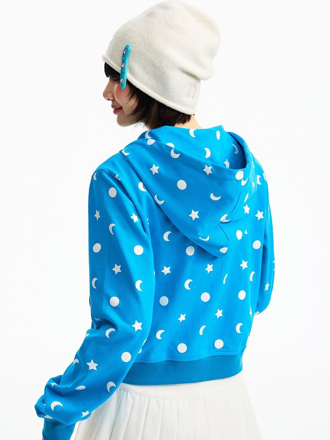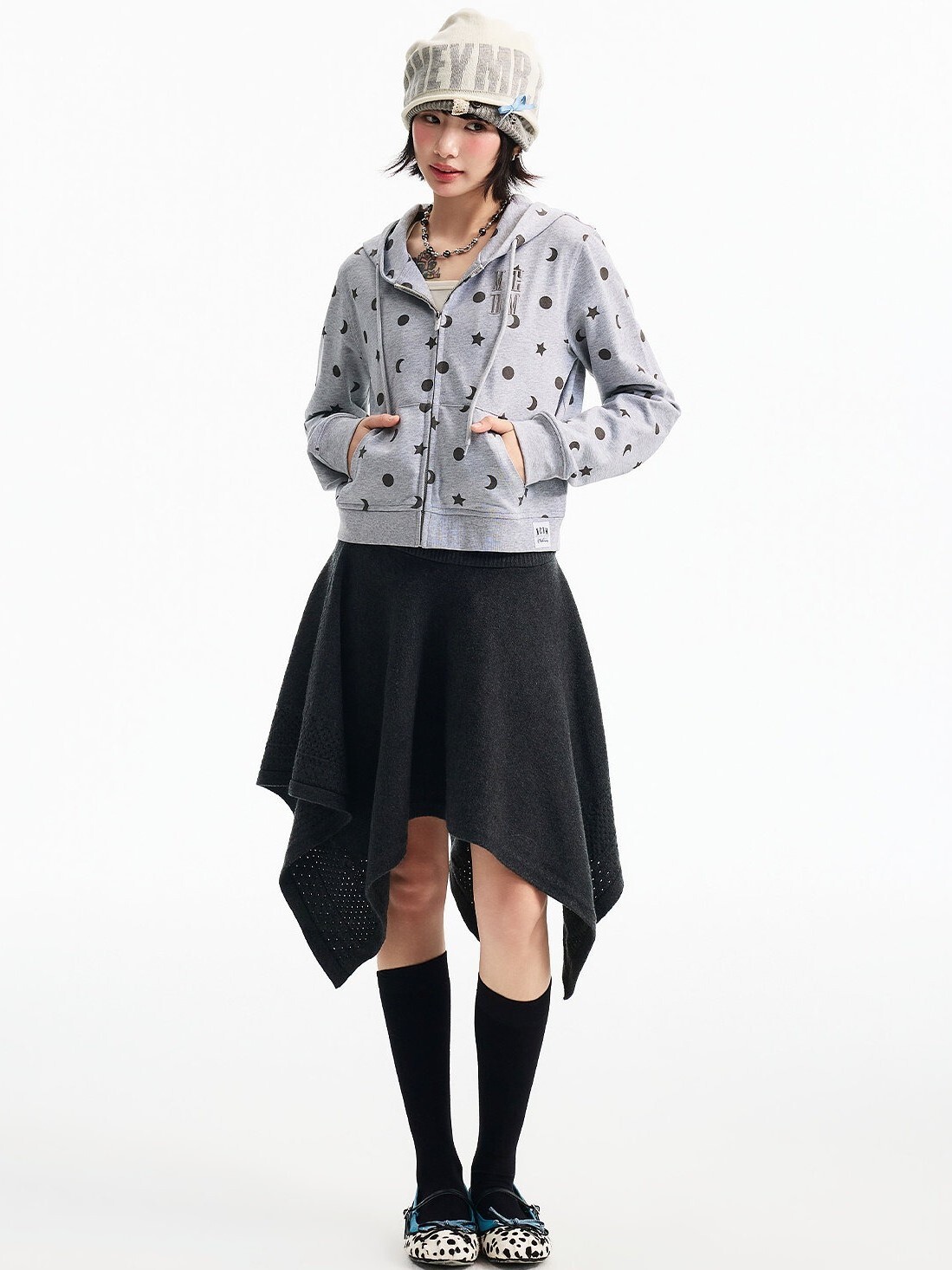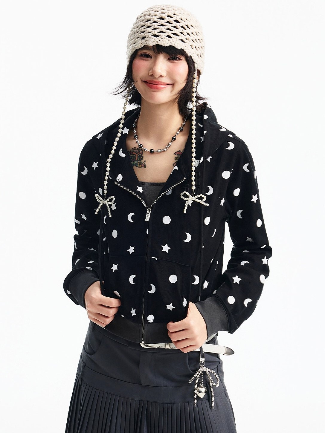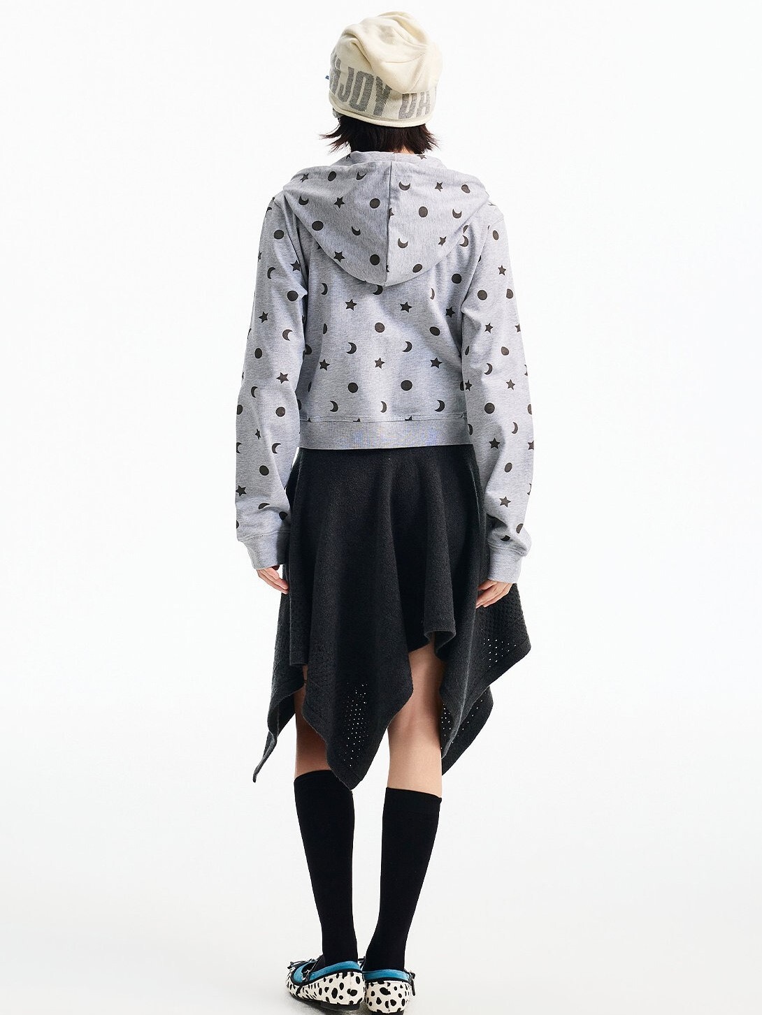 MEDM 胸前刺繡Logo 正肩短版 滿印日月星 休閒 抽繩連帽 外套