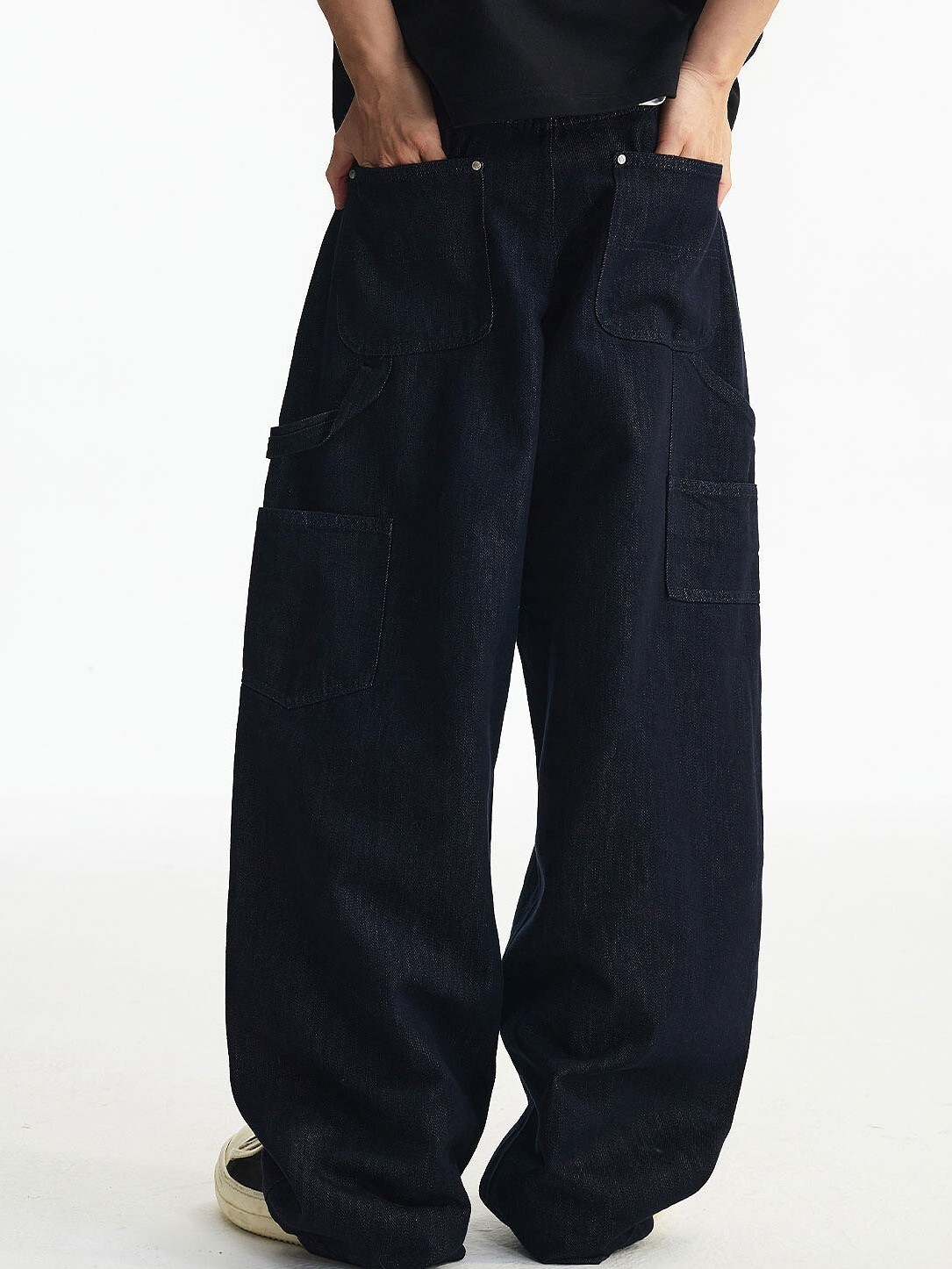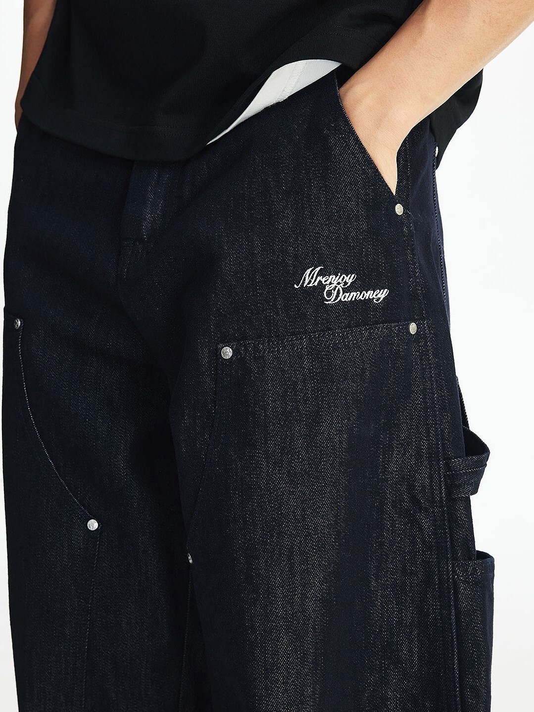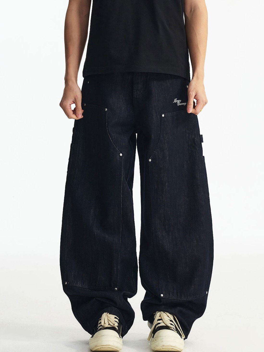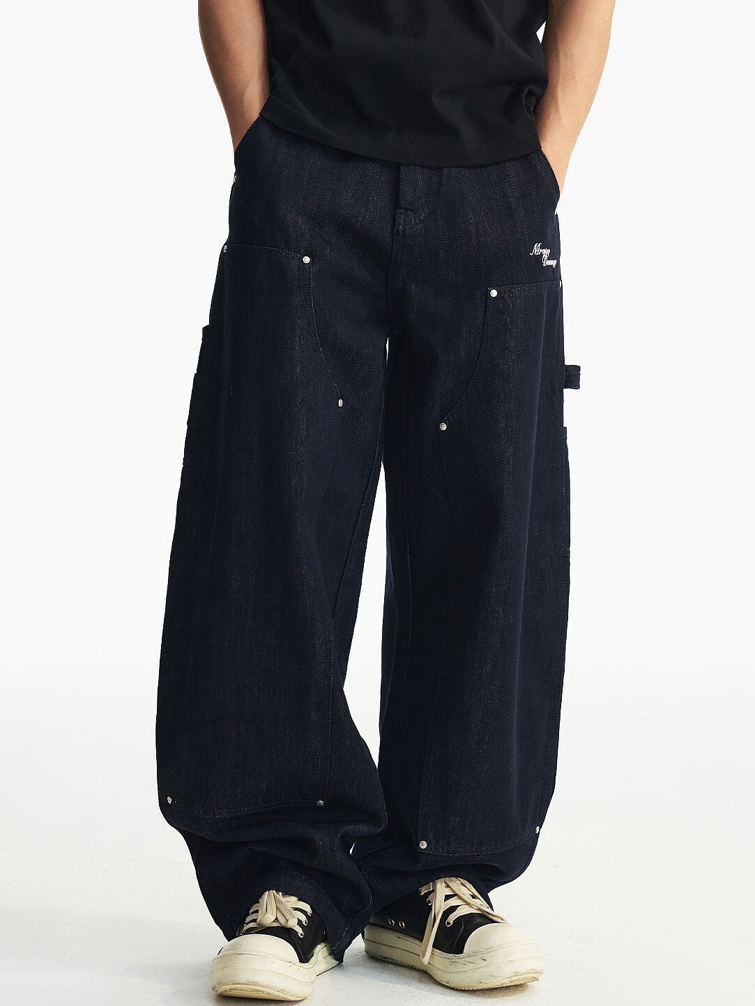 MEDM 重磅牛仔布 皺褶廓型 休閒復古 鉚釘 直筒牛仔褲 長褲