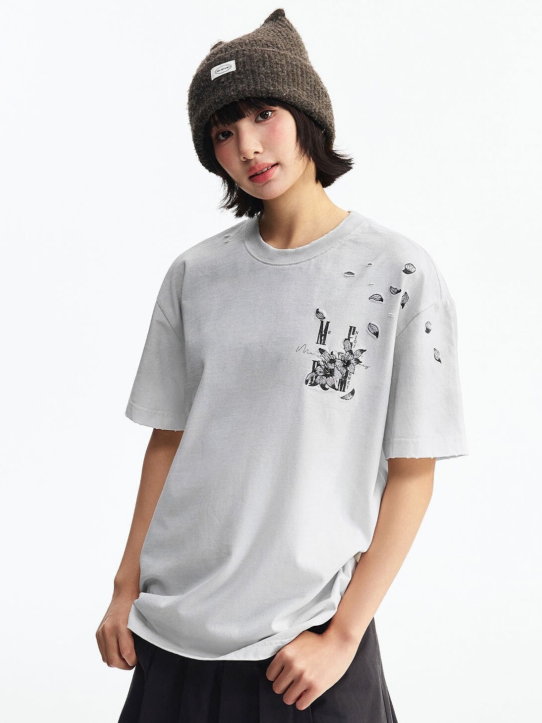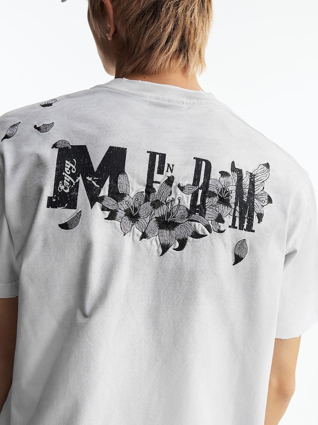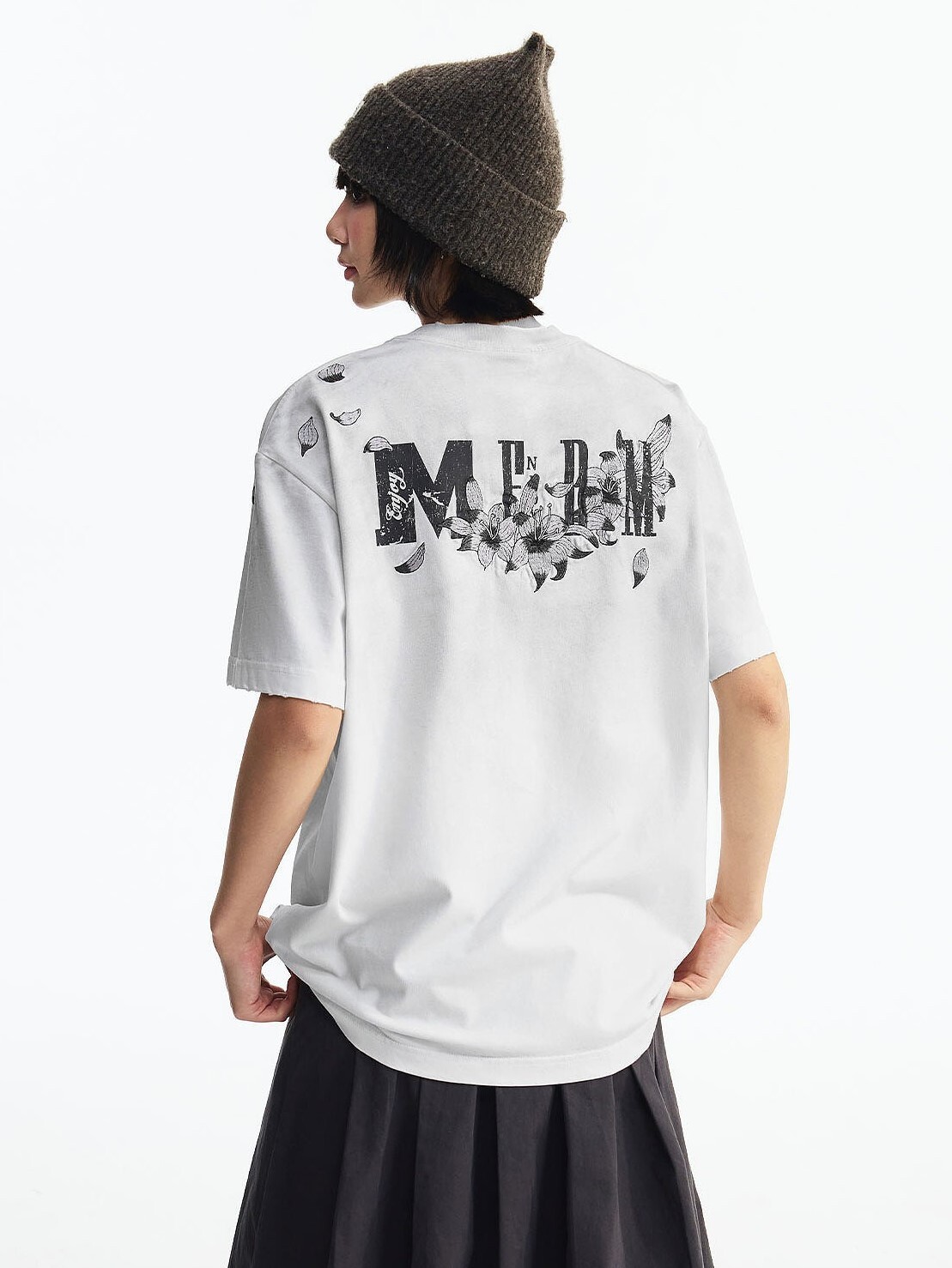 MEDM 水洗復古做舊 百合印花 立體刺繡花卉 休閒圓領 短袖T