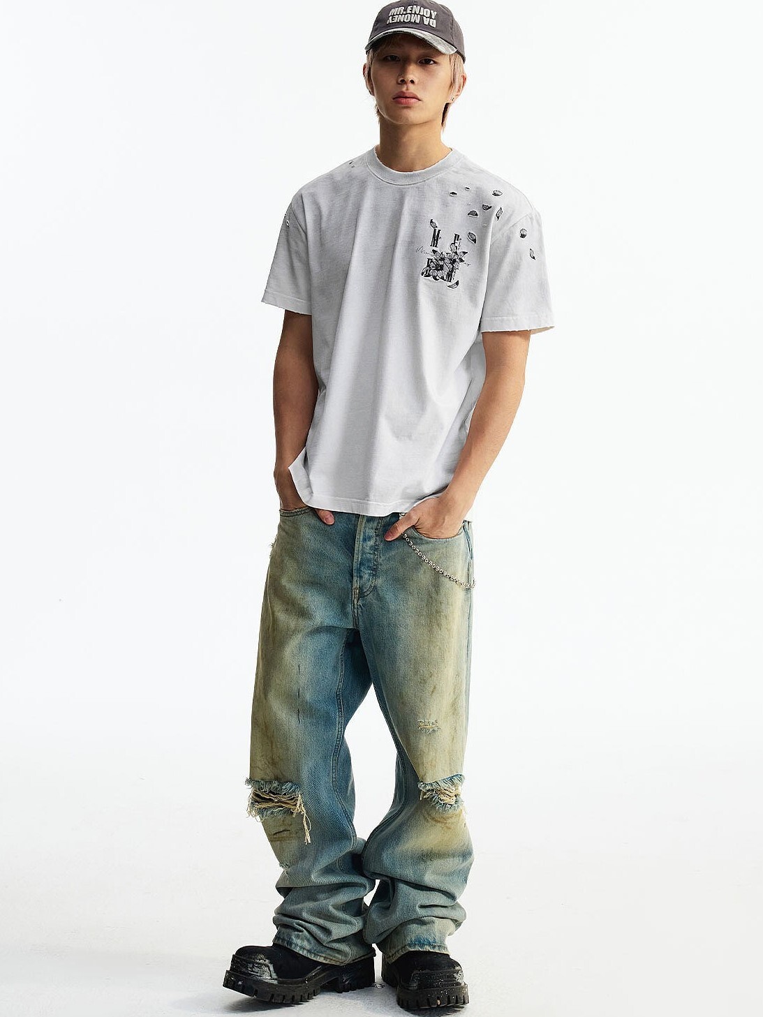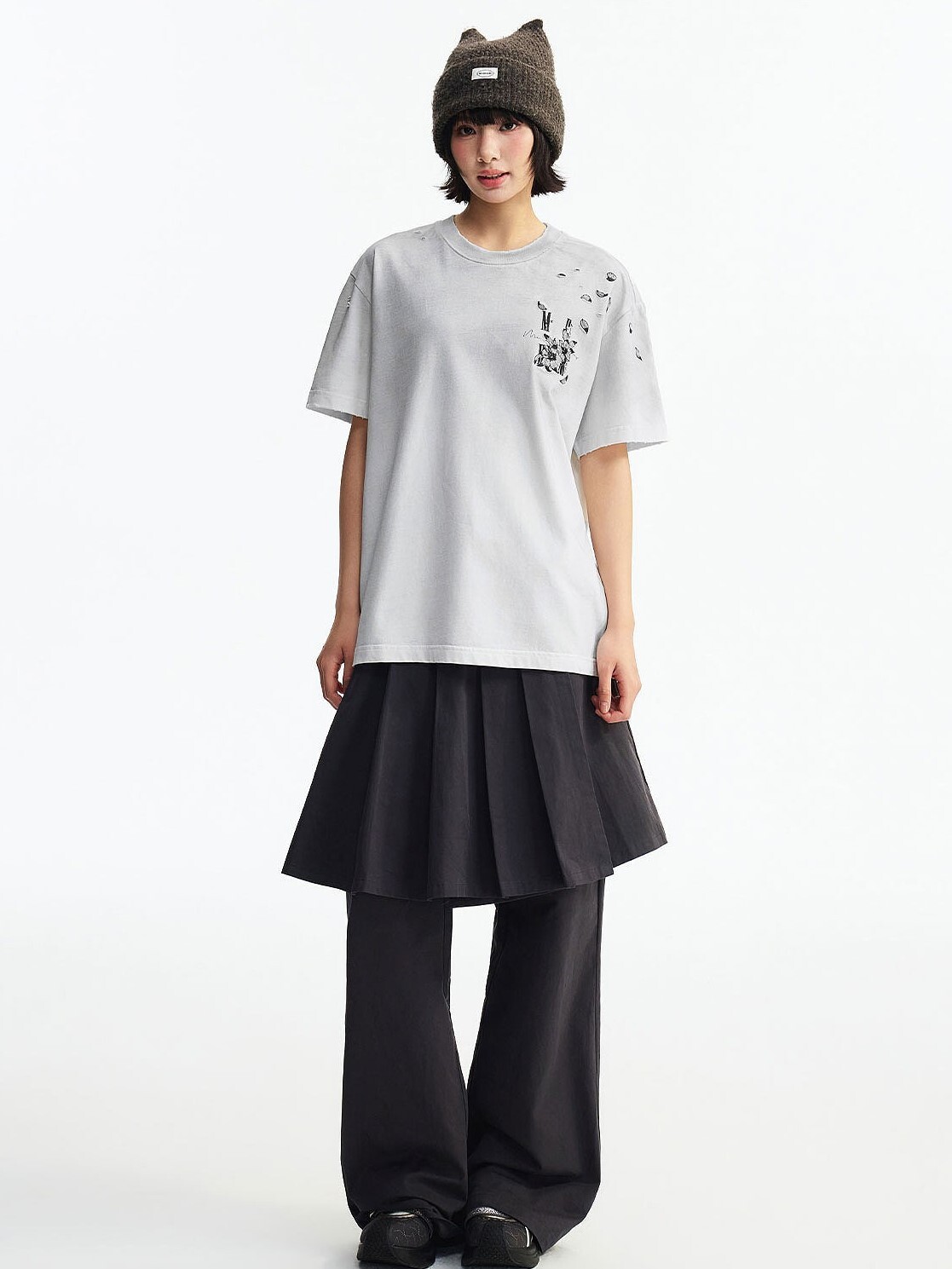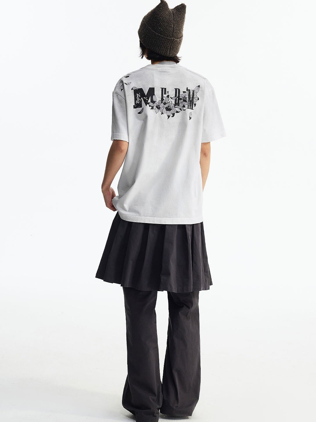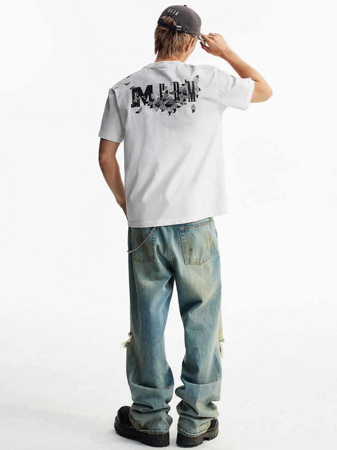MEDM 水洗復古做舊 百合印花 立體刺繡花卉 休閒圓領 短袖T