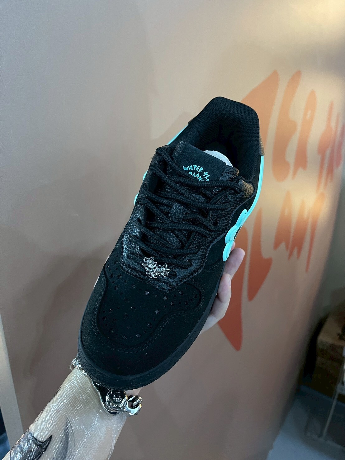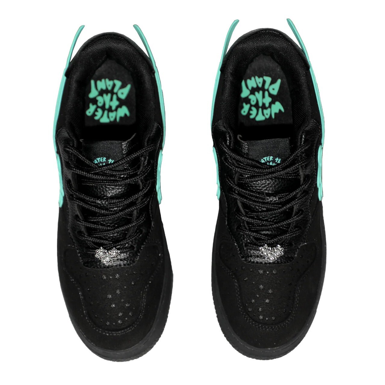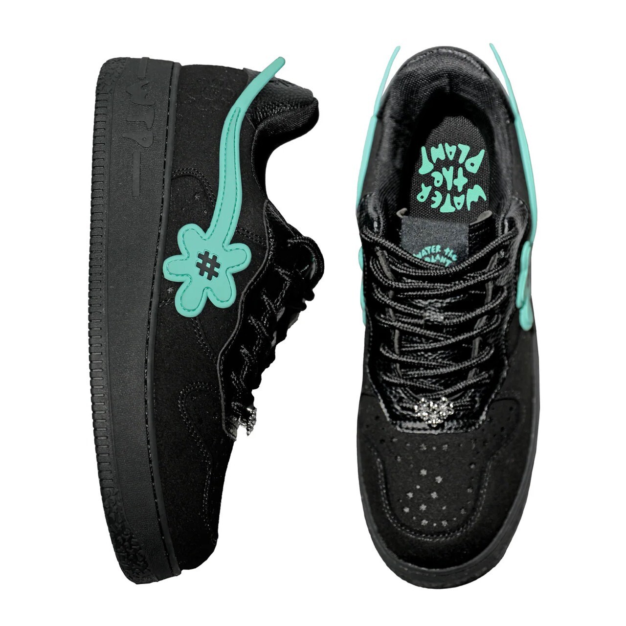 WATER THE PLANT high-quality black suede shoes with Tiffany green logo and small flower shoes WTP "ICED" Goat Kicks | Tiffany Blue