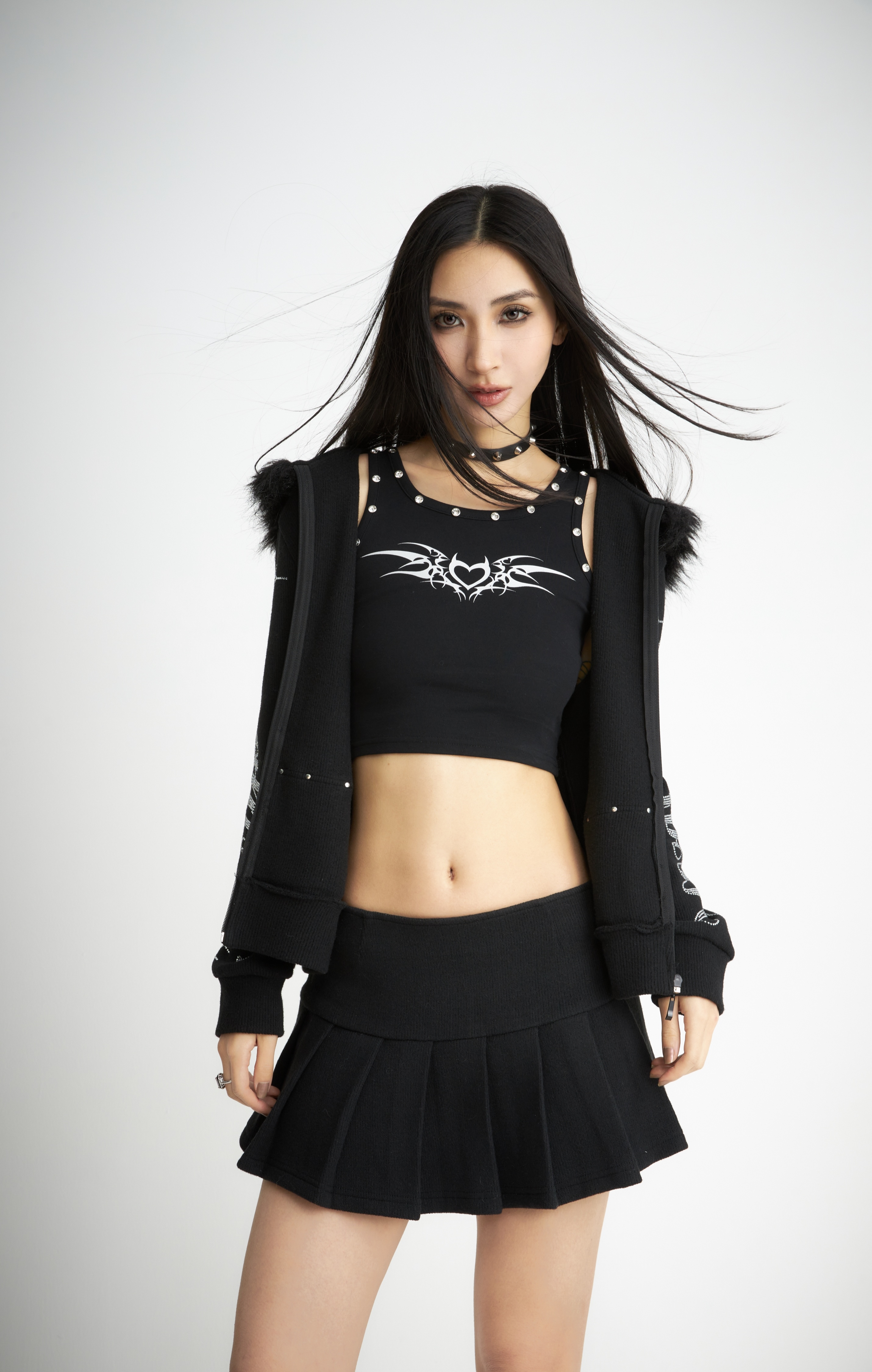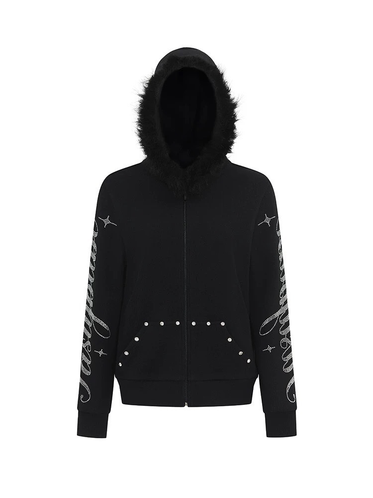 ArtByTastybabe 文字黏鑽 鉚釘 毛領連帽外套 黑色