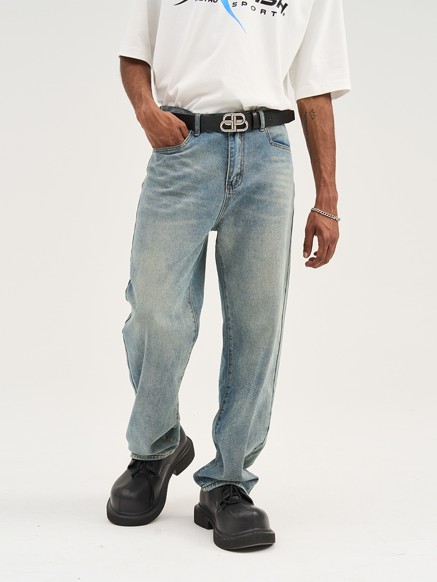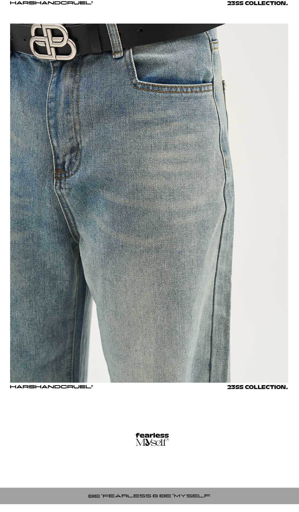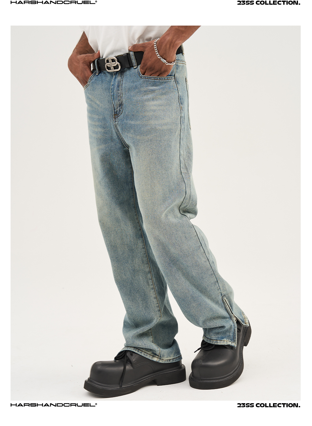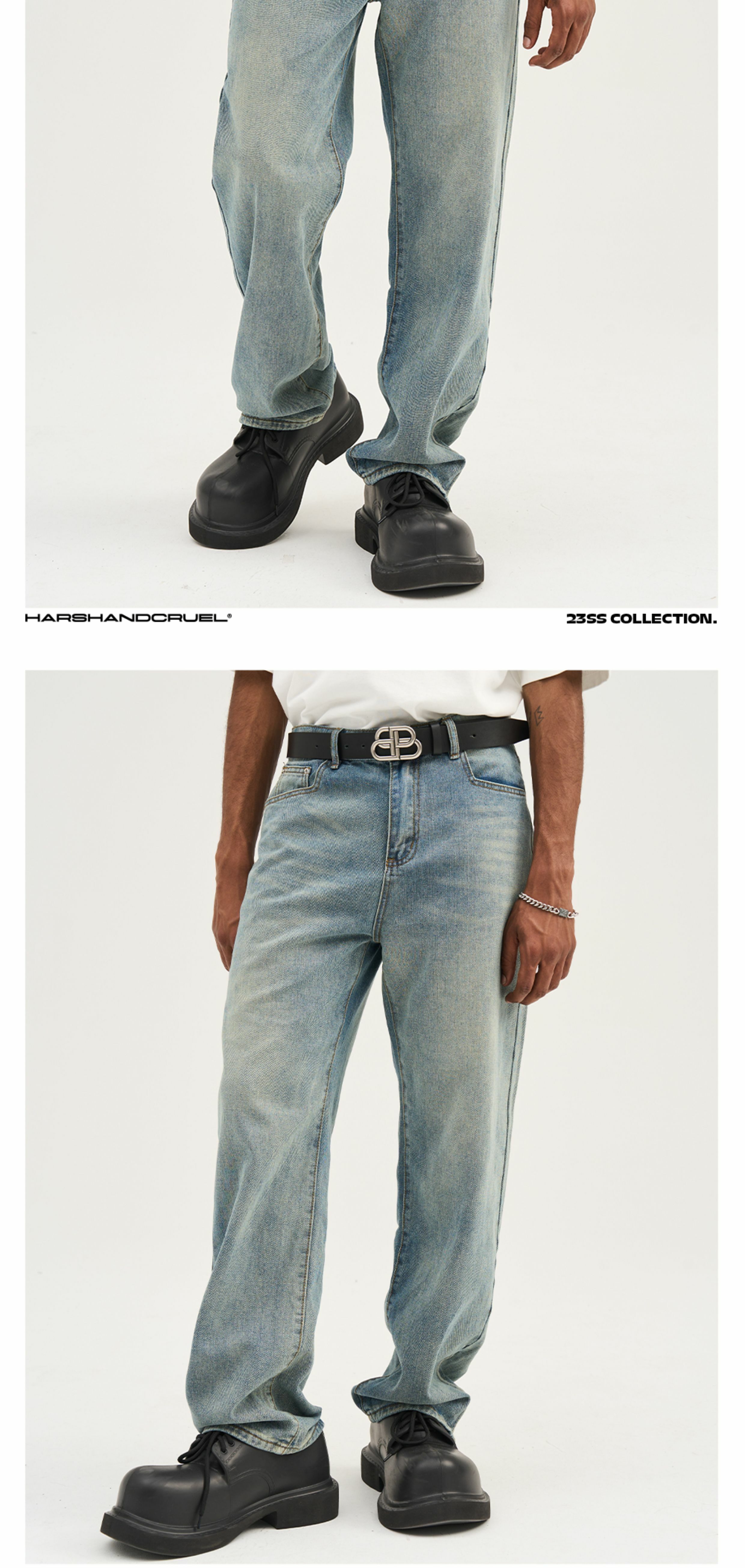 HARSH AND CRUEL 23SS 美式水洗做舊泛黃腳口拉鍊直筒牛仔褲 HN232140230