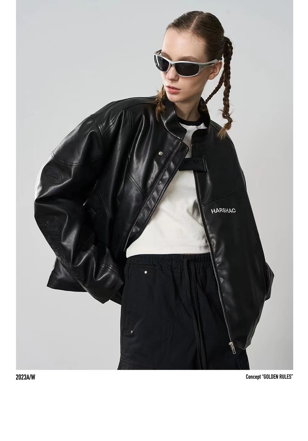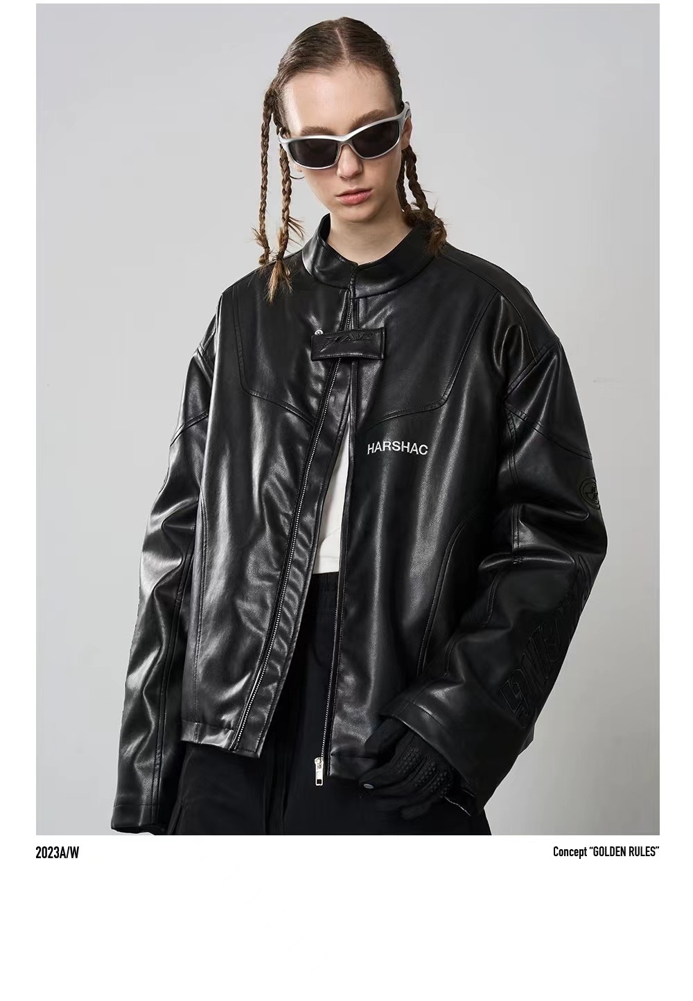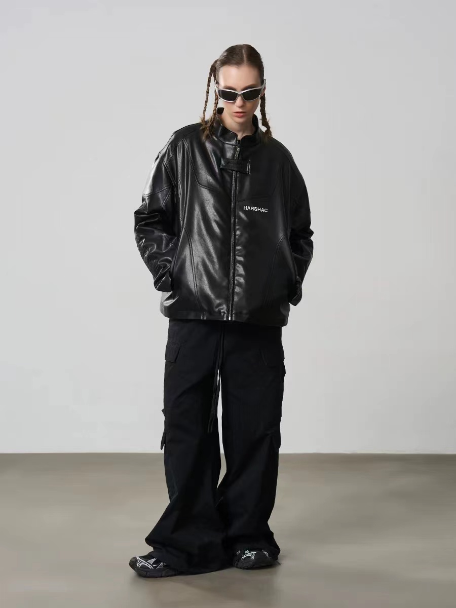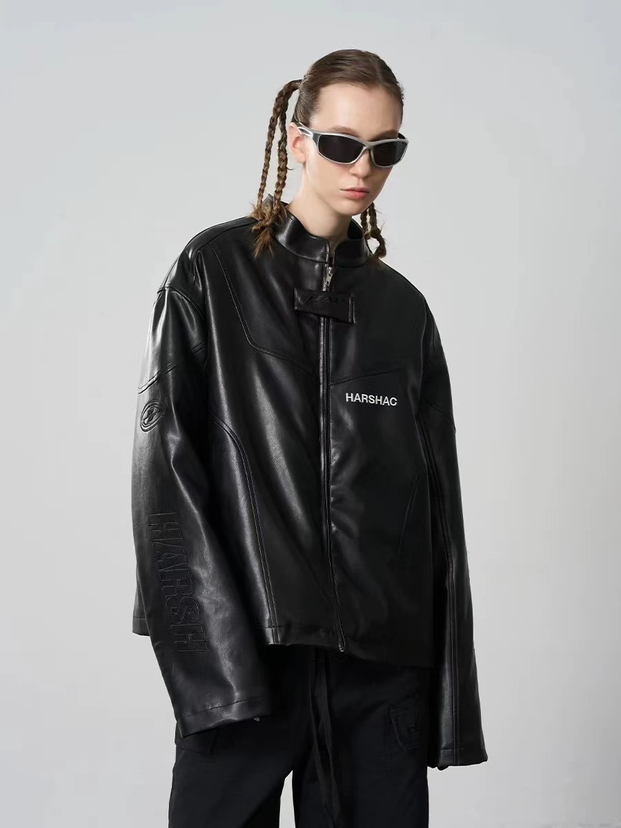 HARSH AND CRUEL 美式復古刺繡賽車運動立領 皮鋪棉外套 HZ233040517