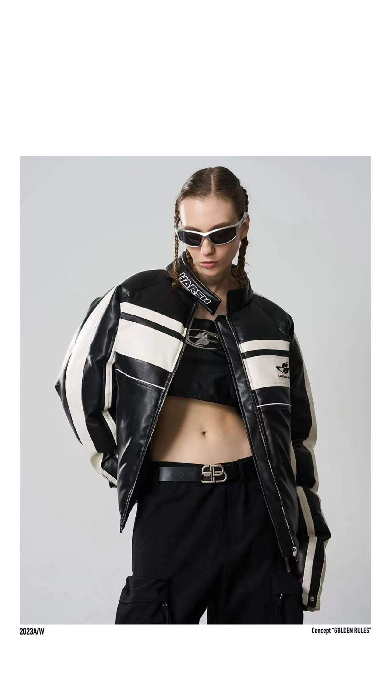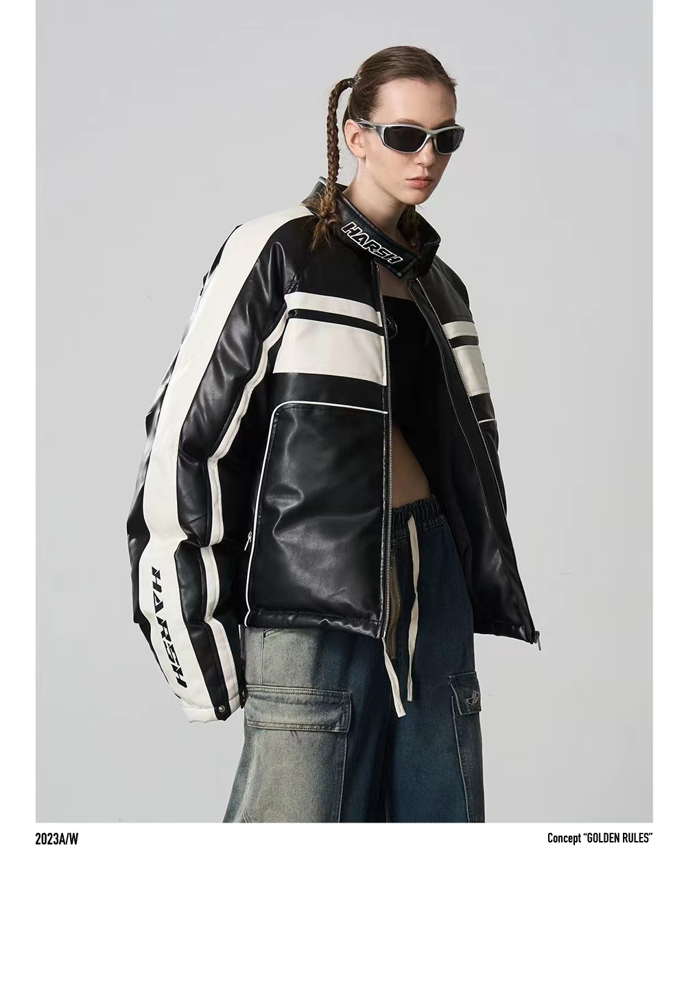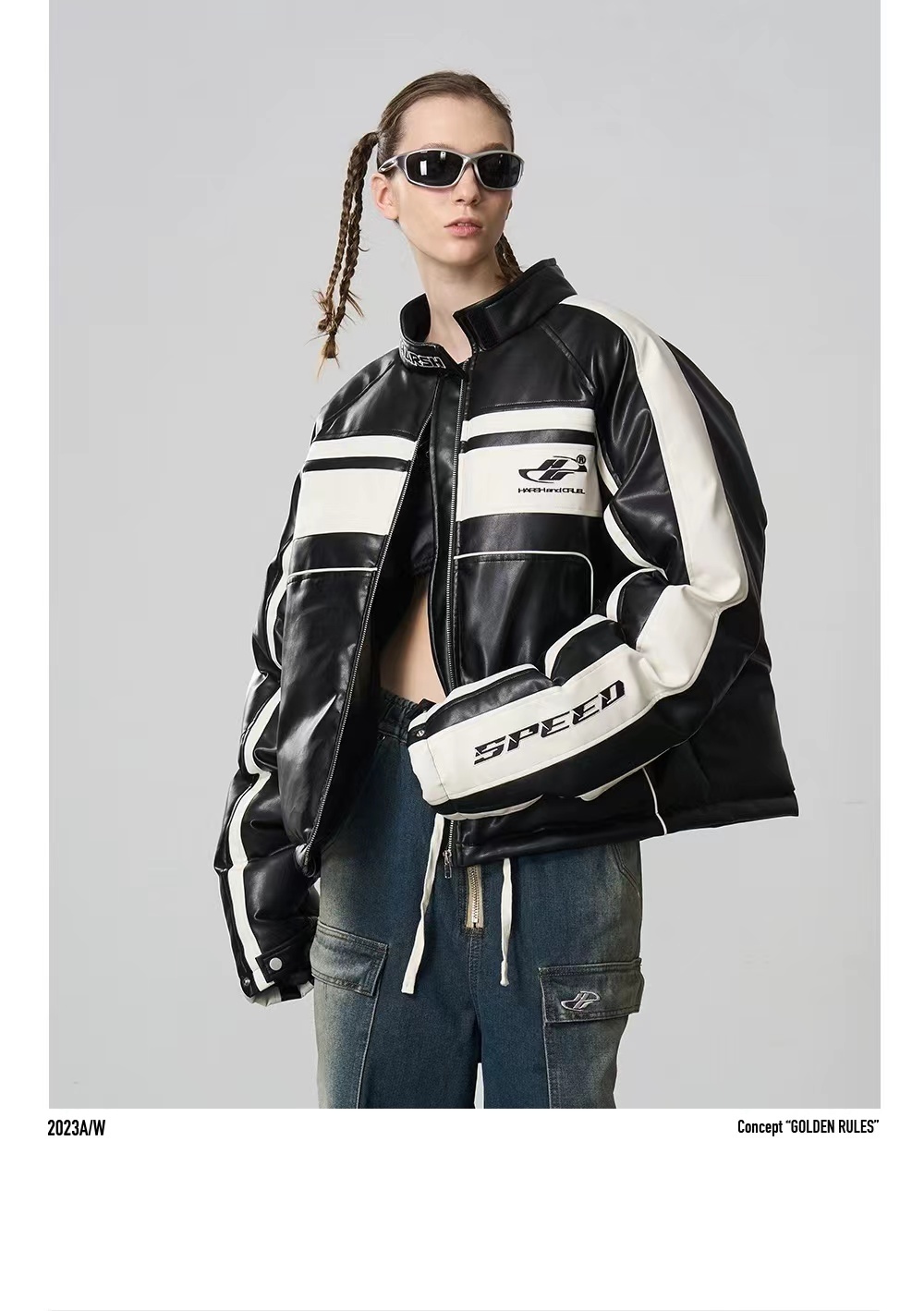 HARSH AND CRUEL 解構拼接撞色刺繡賽車運動立領pu皮鋪棉外套 HZ233040516