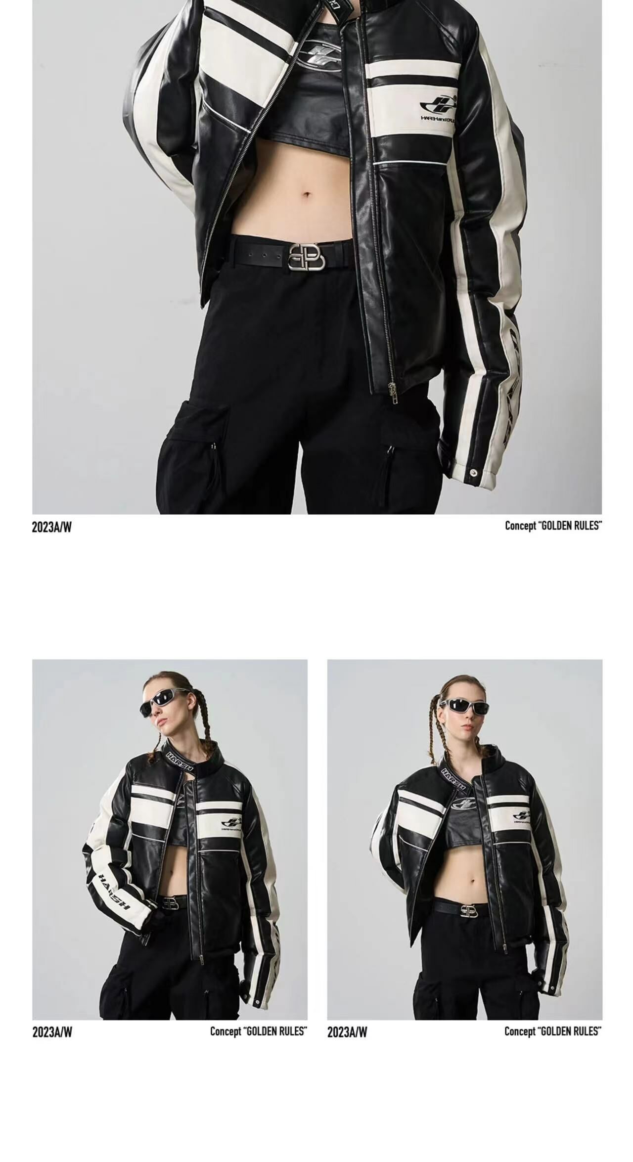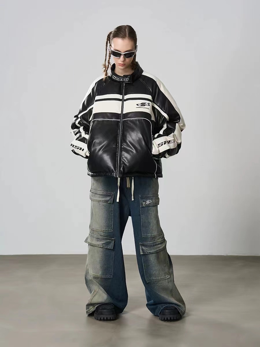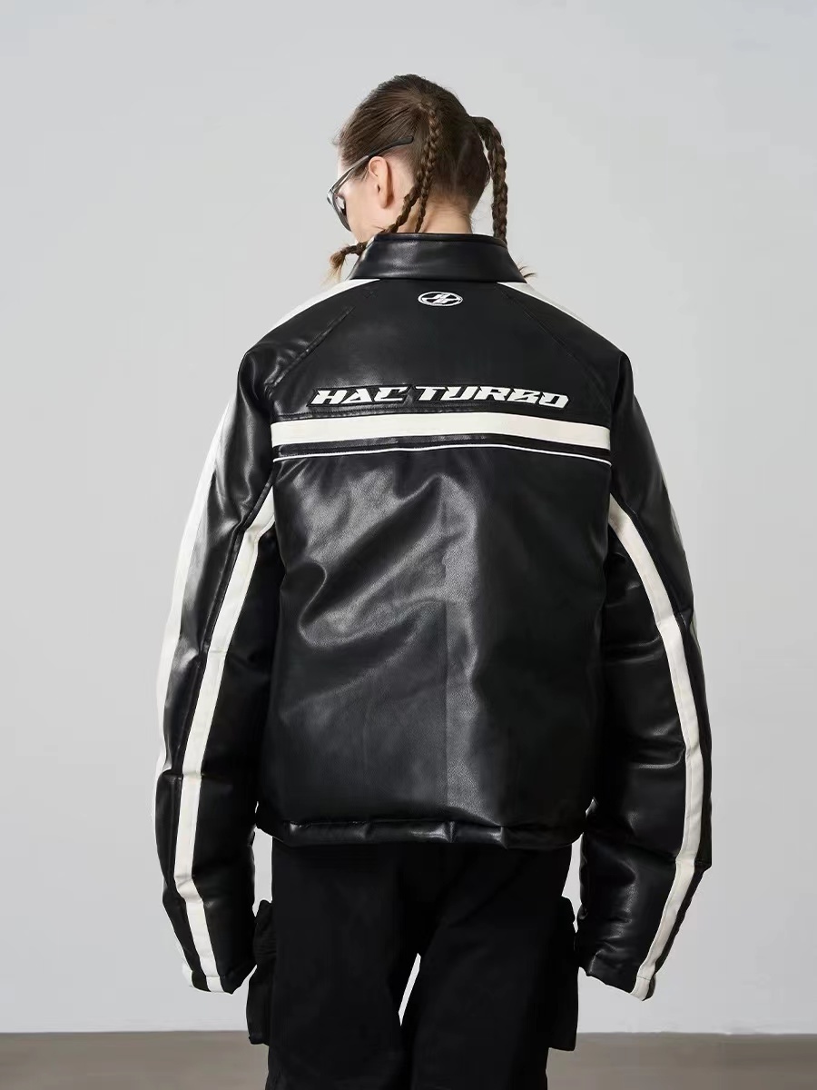 HARSH AND CRUEL 解構拼接撞色刺繡賽車運動立領pu皮鋪棉外套 HZ233040516