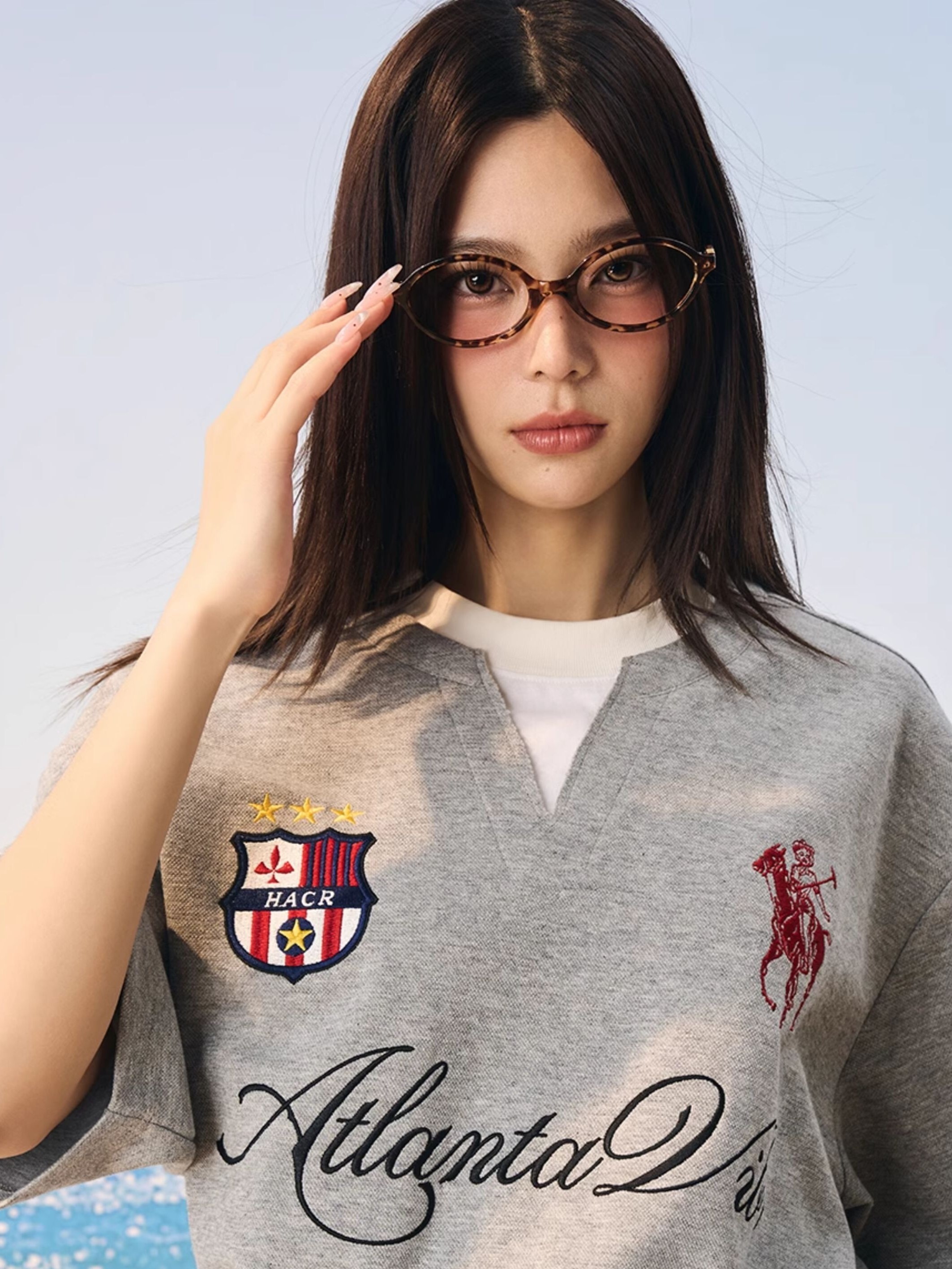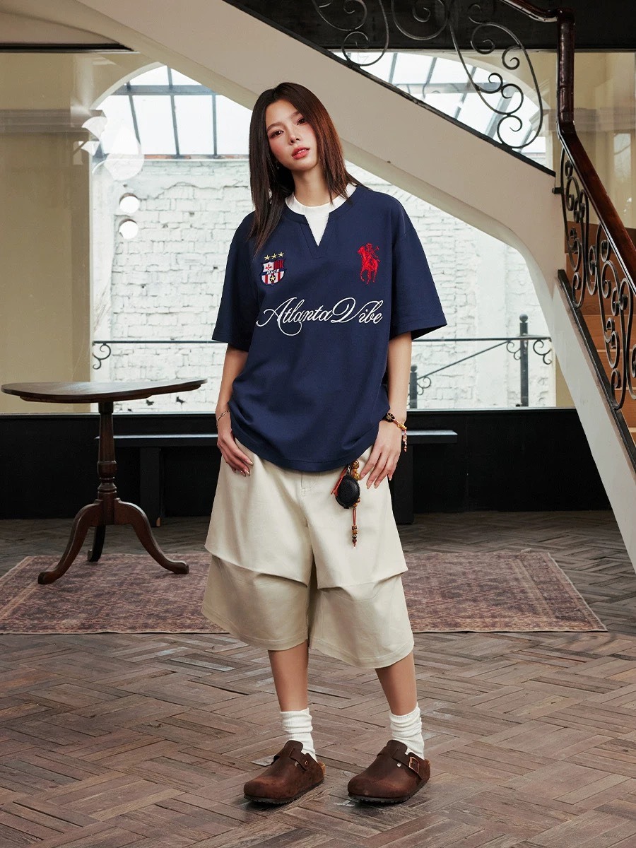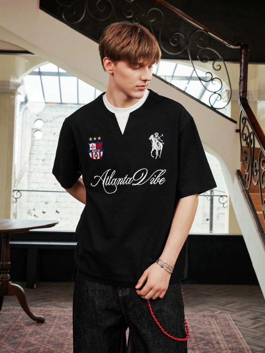 Harsh and Cruel 學院風刺繡 假兩件亨利領 短袖 T恤 HL251020084