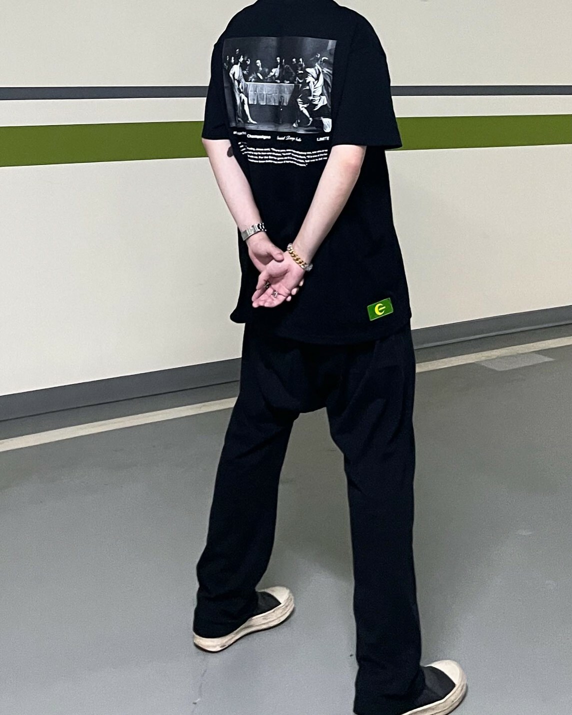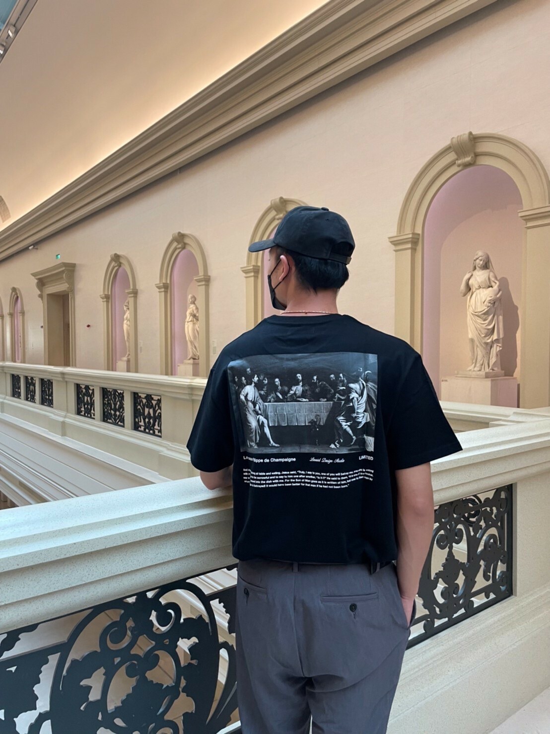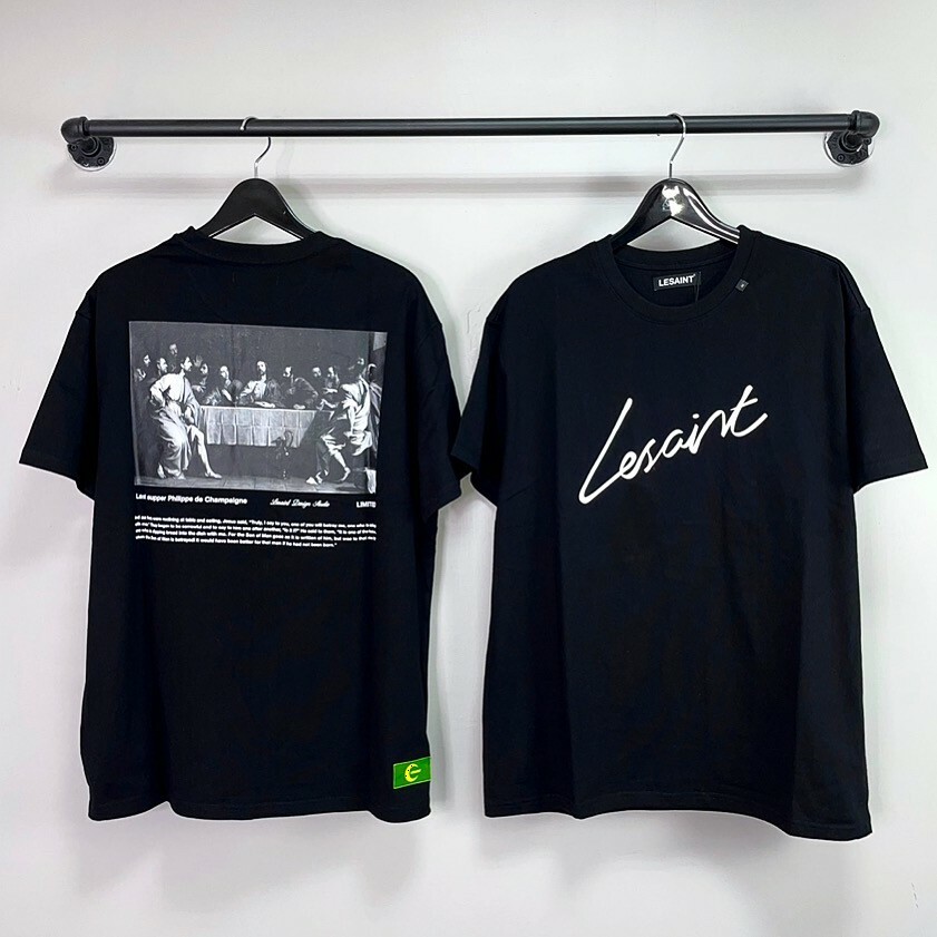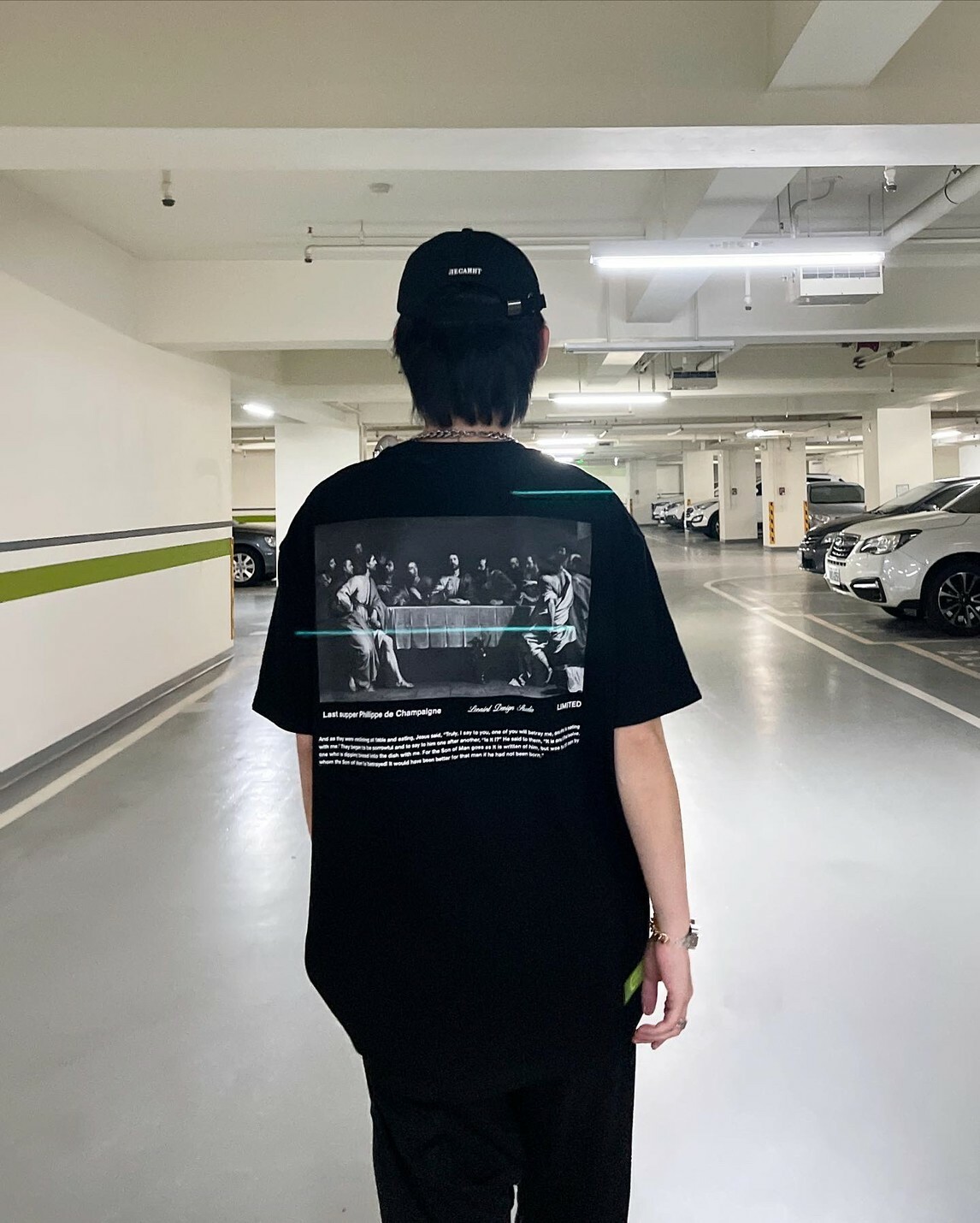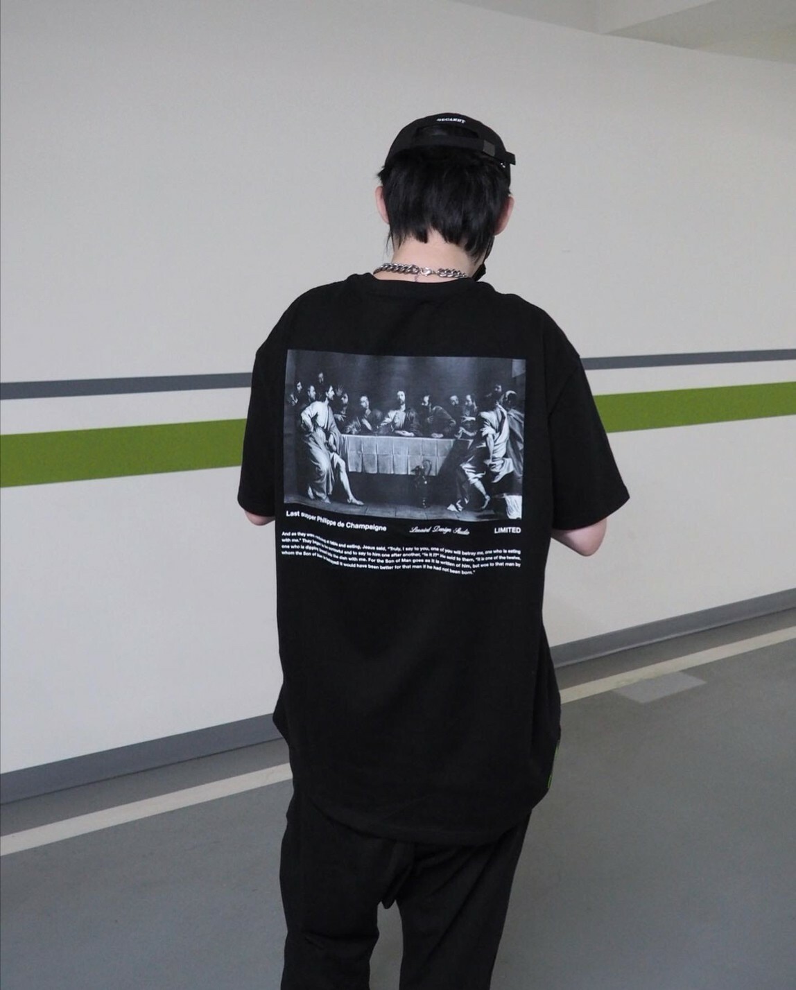 Korean brand LESAINT new last supper religious oil painting negative black and gray loose slogan short sleeve T