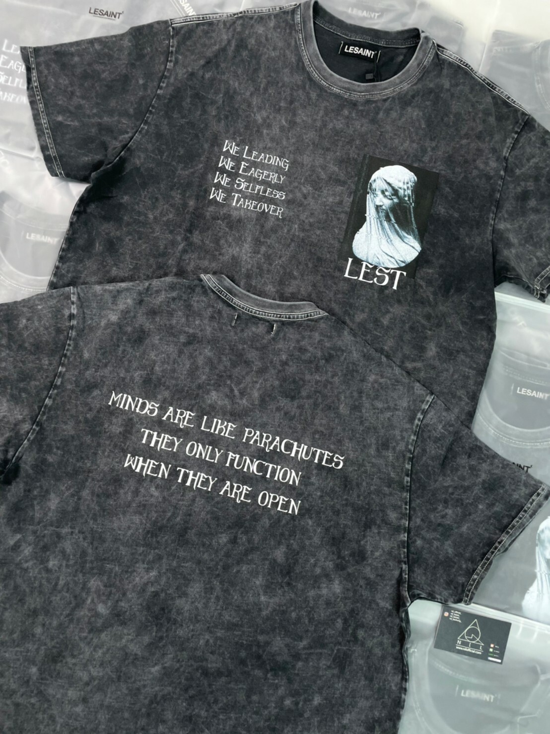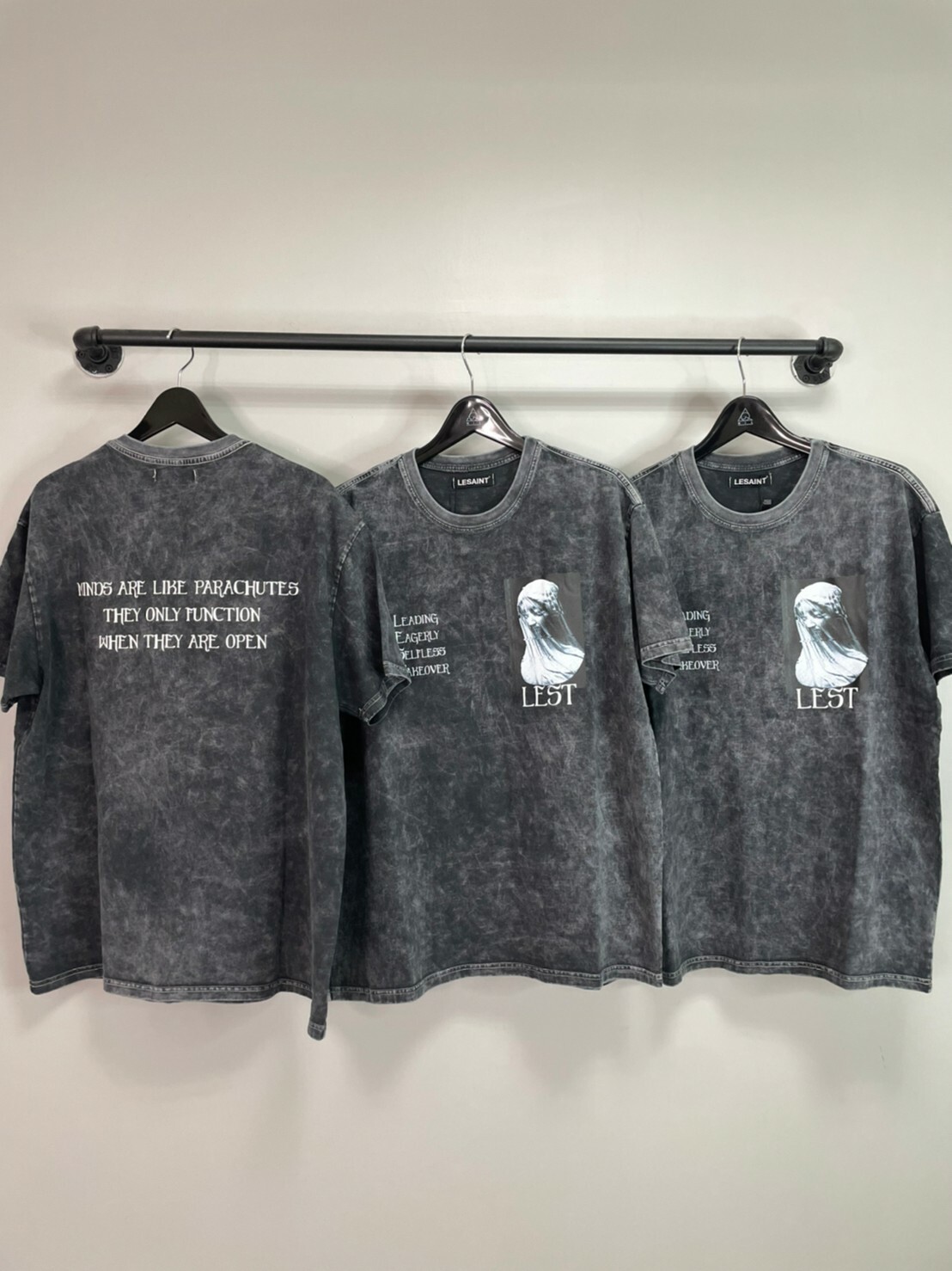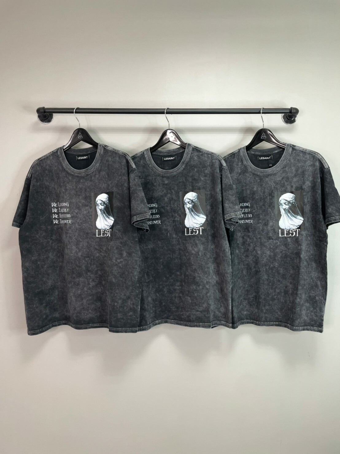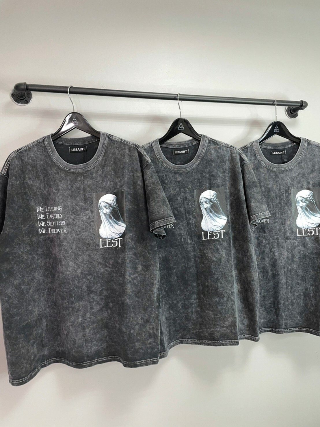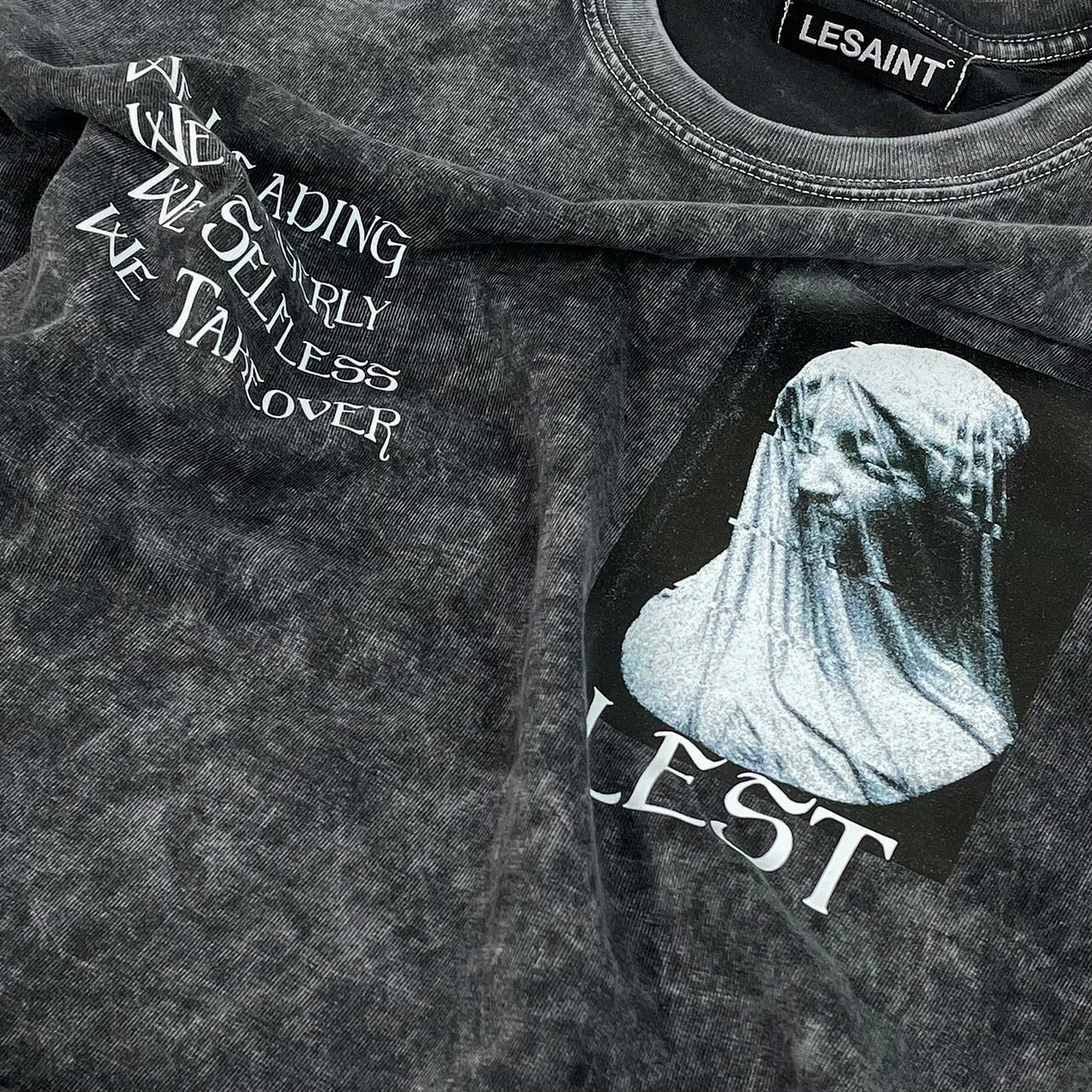 Korean brand LESAINT washed black ash Virgin Statue LEST slogan short sleeve T old limited edition