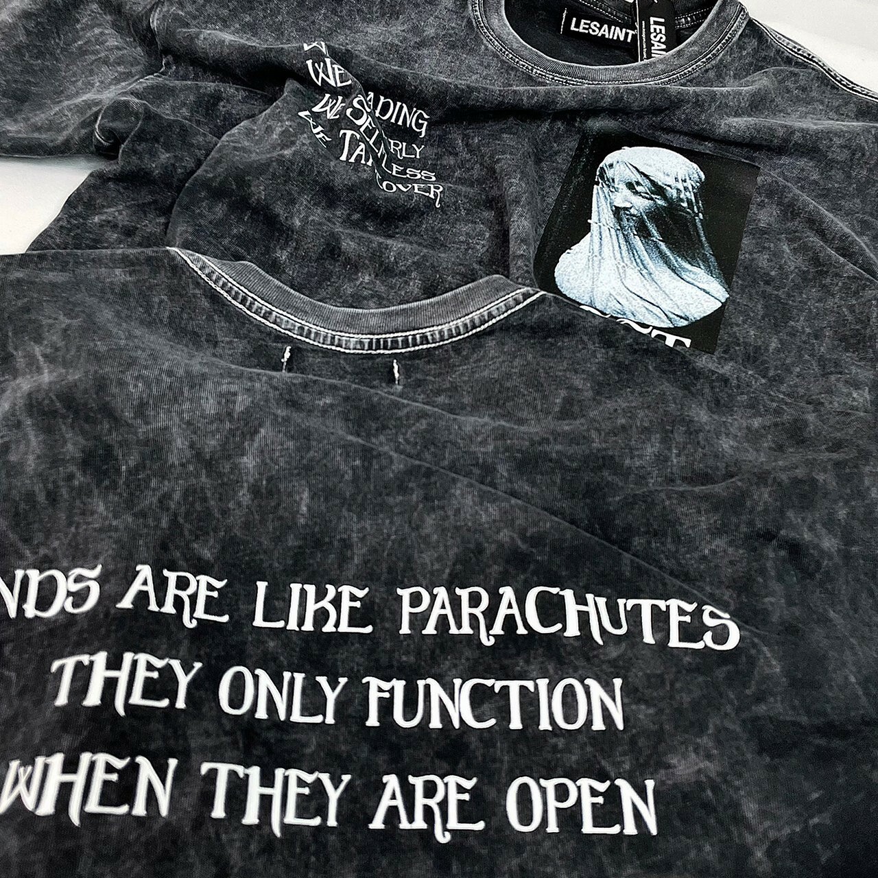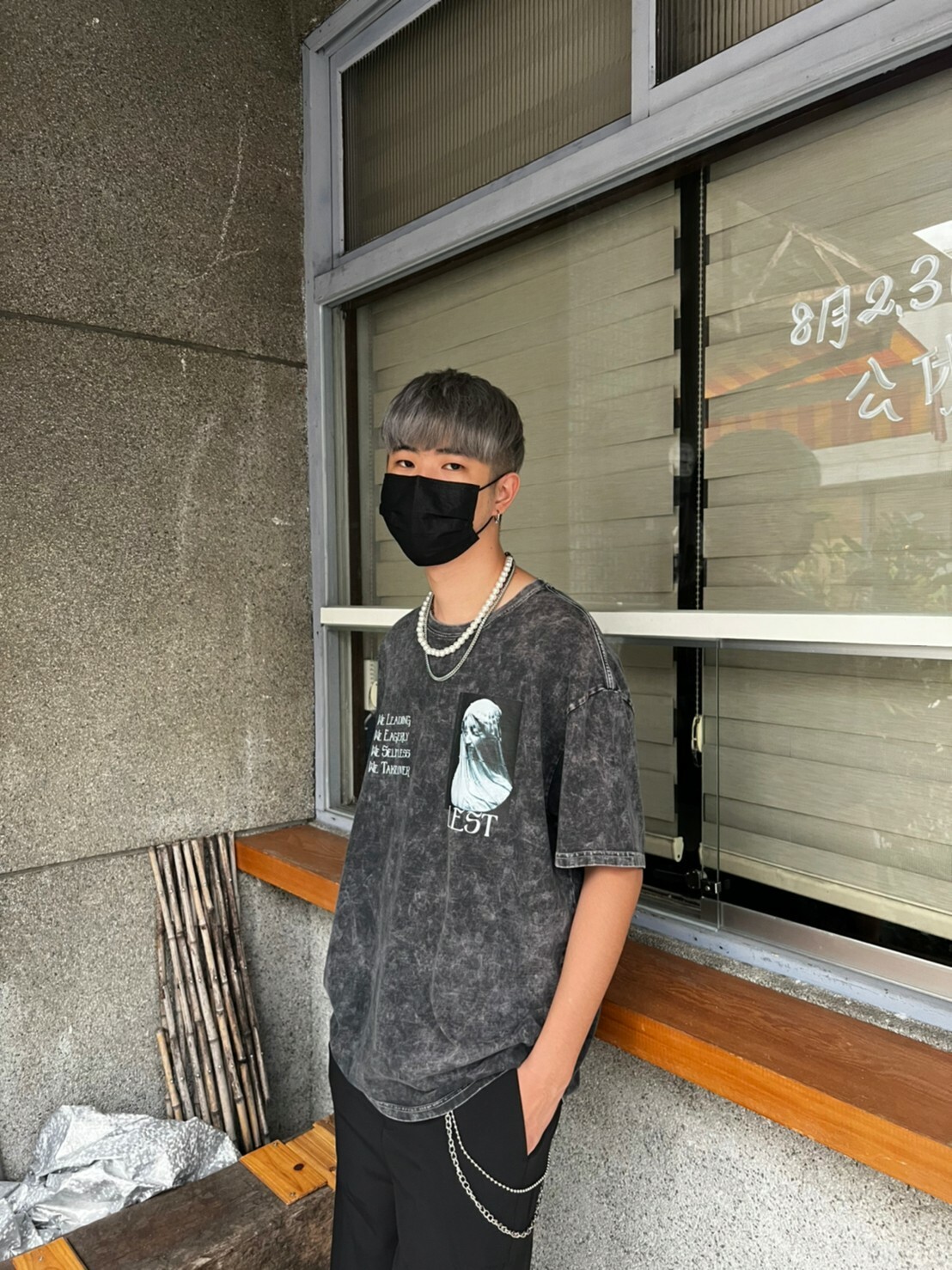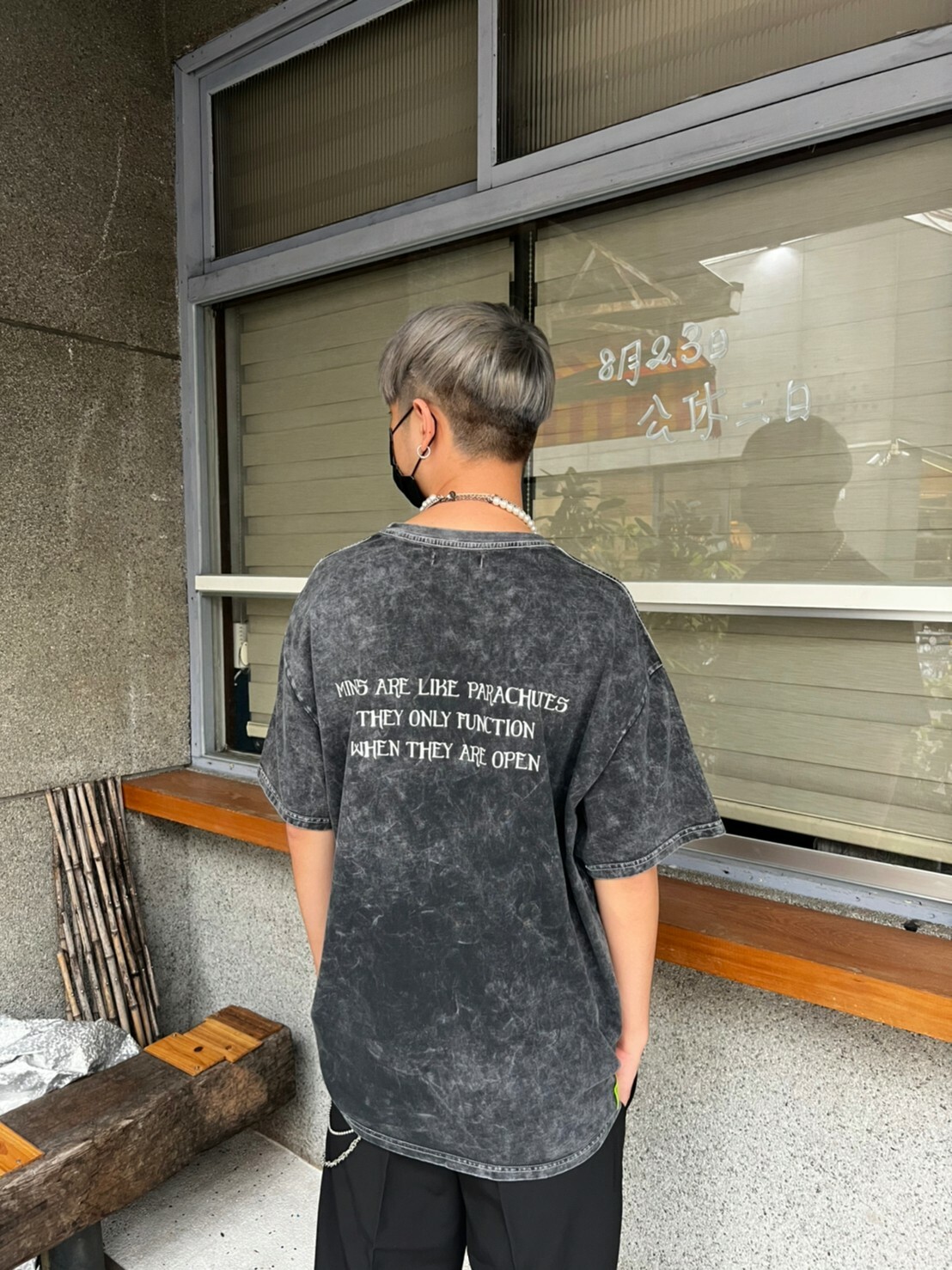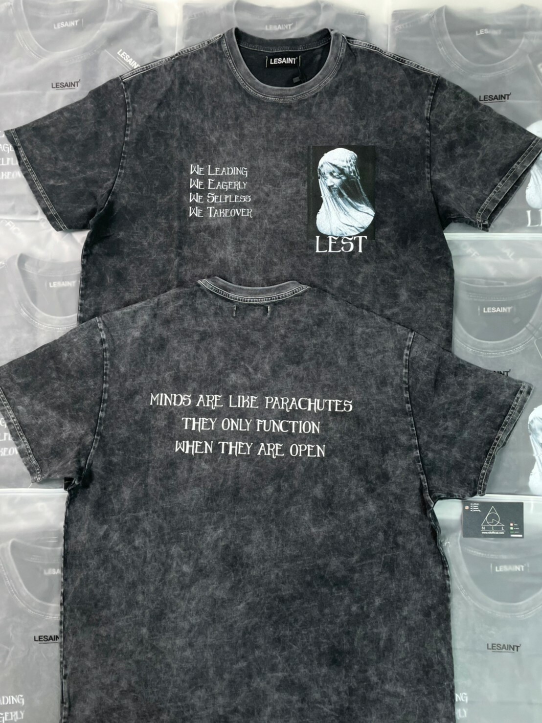 Korean brand LESAINT washed black ash Virgin Statue LEST slogan short sleeve T old limited edition