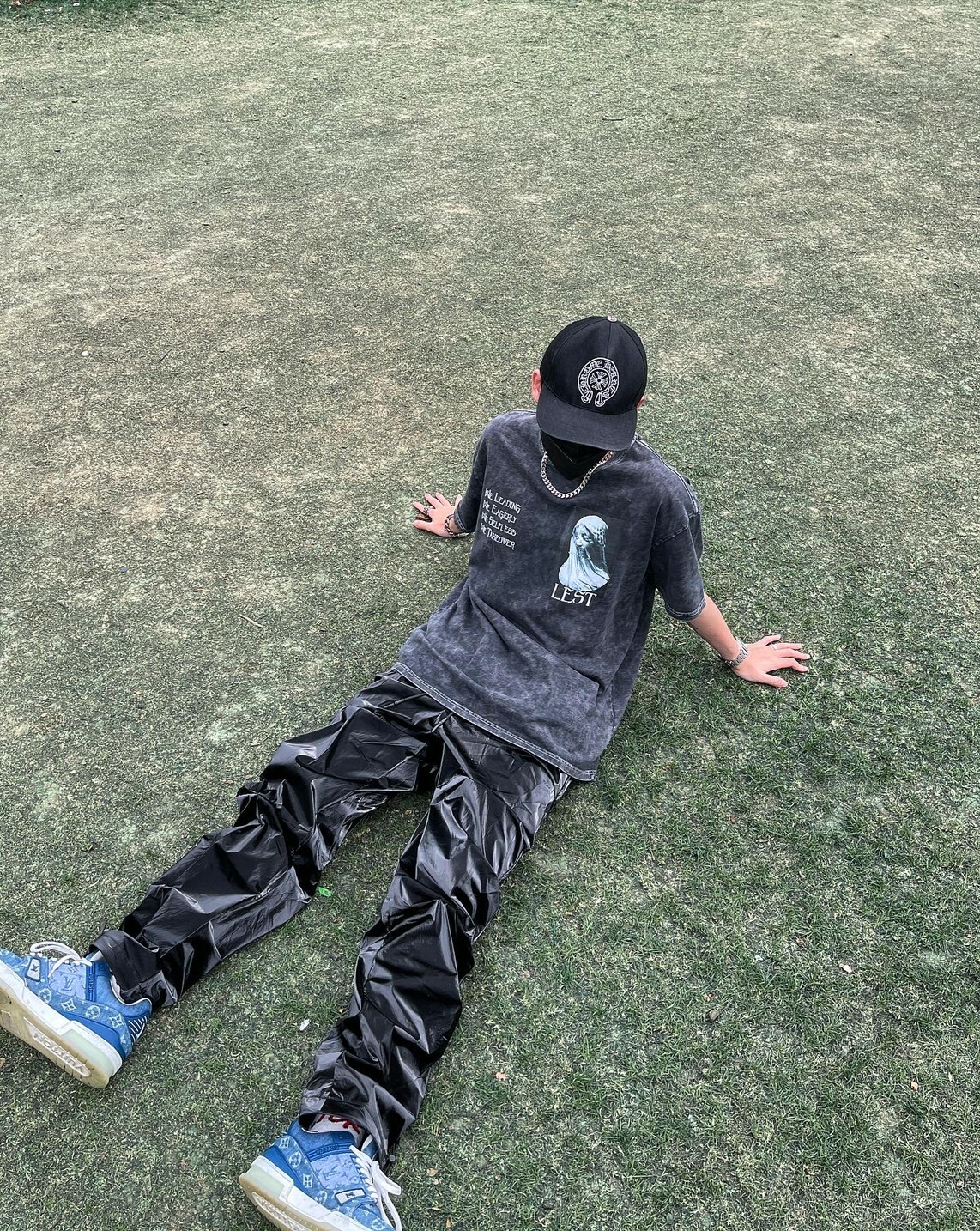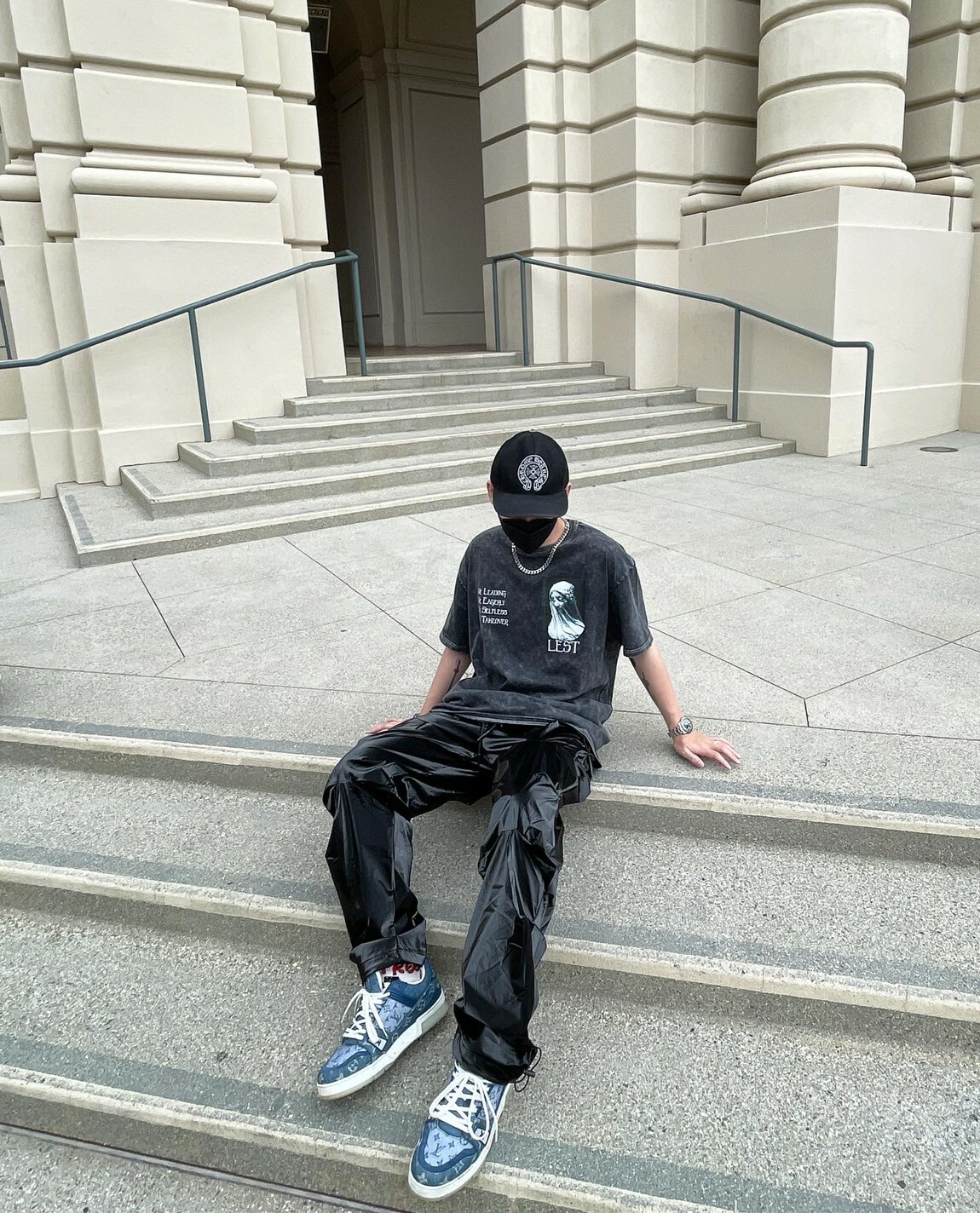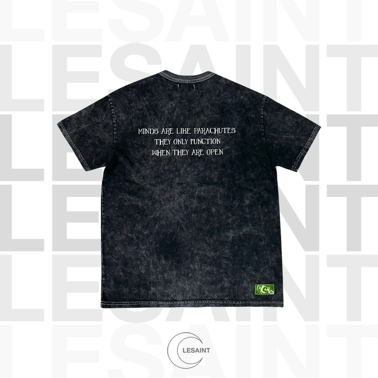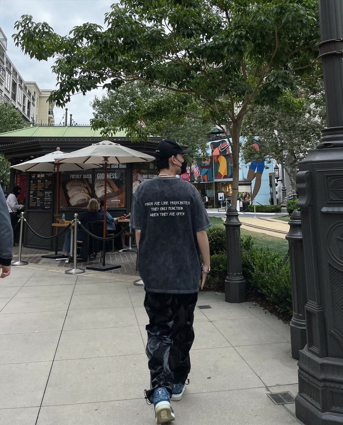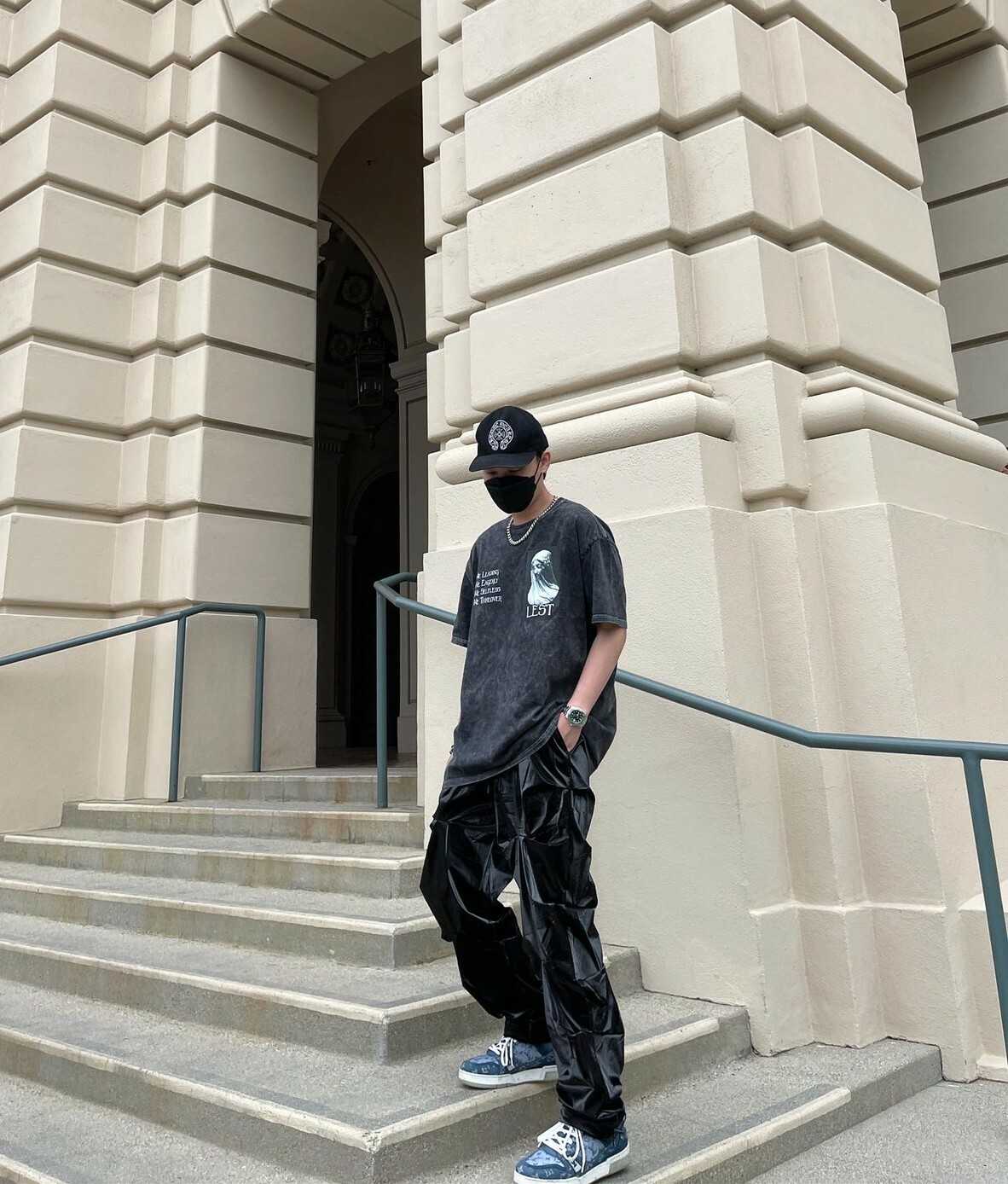 Korean brand LESAINT washed black ash Virgin Statue LEST slogan short sleeve T old limited edition