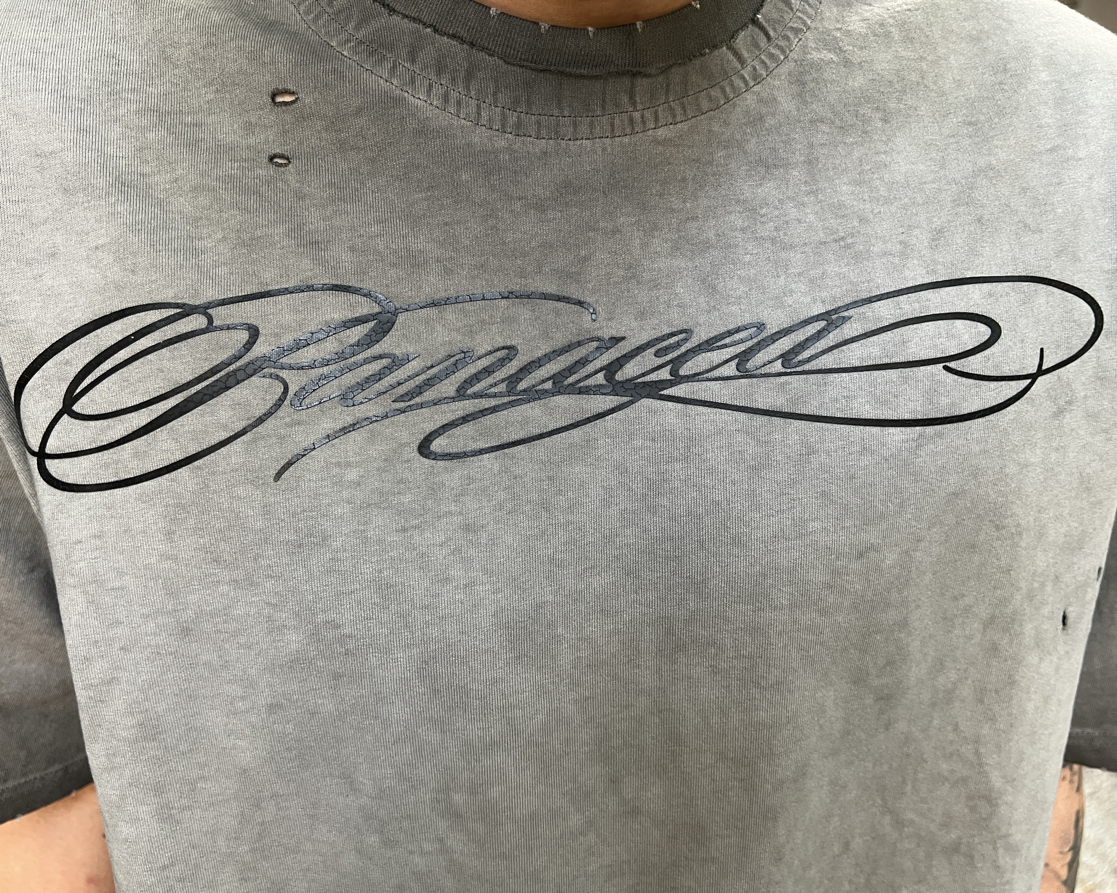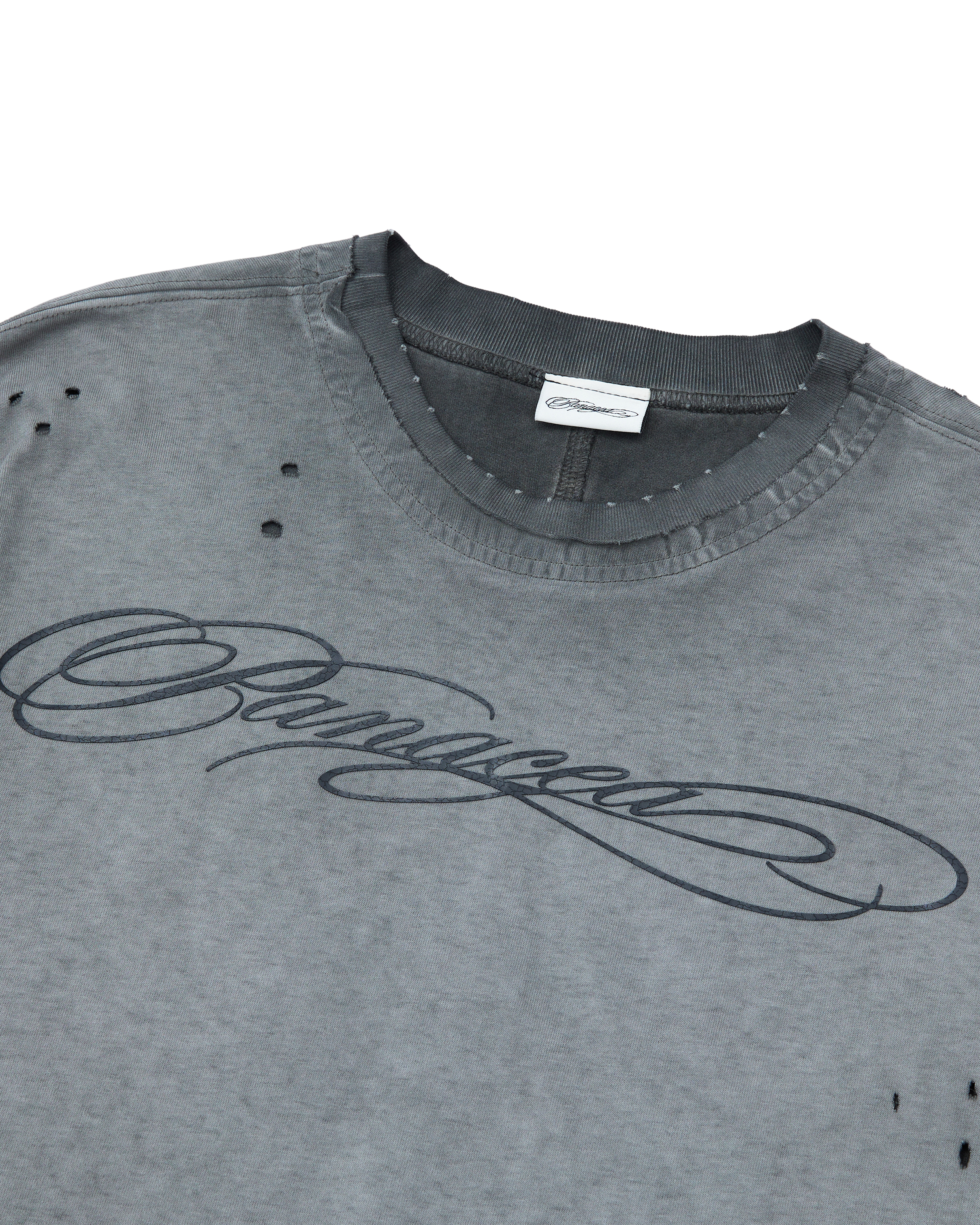 PANACEA 經典草寫字樣為主體,採用特殊龜裂印刷工藝處理,營造出墨跡乾裂剝落的視覺層次,展現時間與風格的痕跡感。