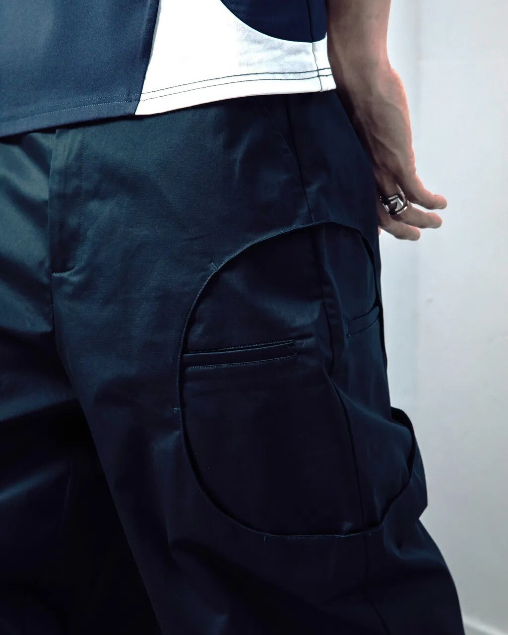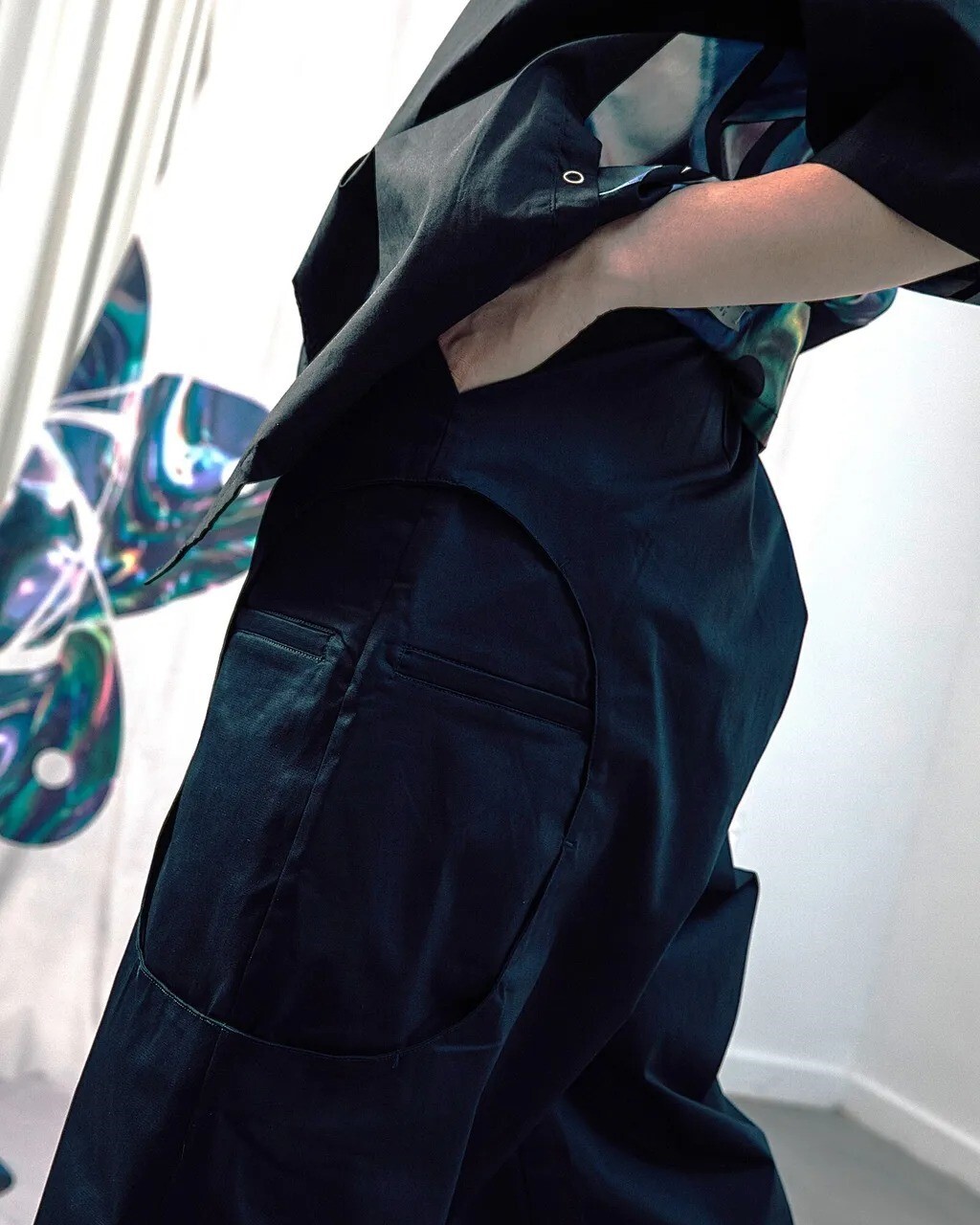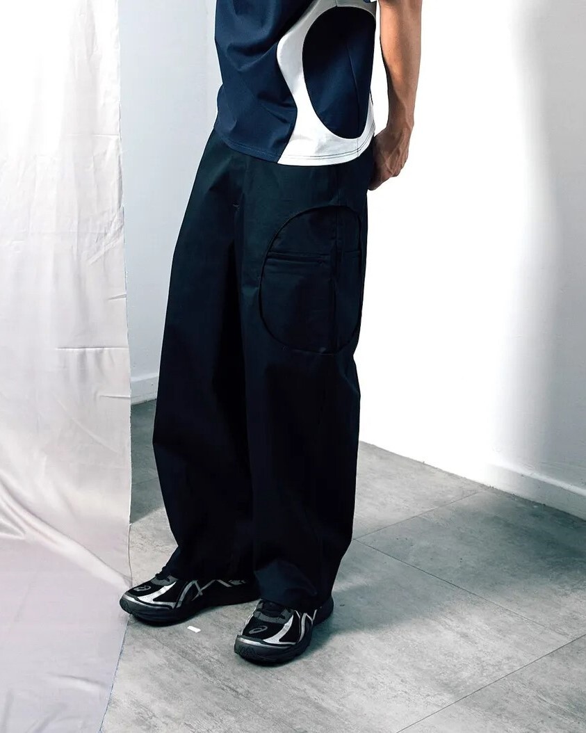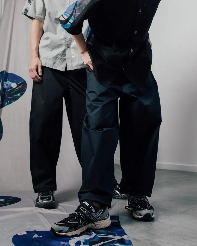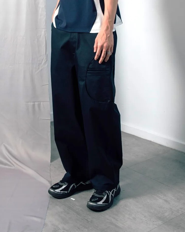 顛覆一般工裝褲的設計,運用幾何解構手法,改以圓形外框與隱形拉鍊設計,重塑實用機能與設計語彙間的平衡。中腰設定更適合不分性別的身型穿搭,以俐落錐形延續「金萍梅 Jinpinmay」 關於兩種設計語言並肩而行的故事。