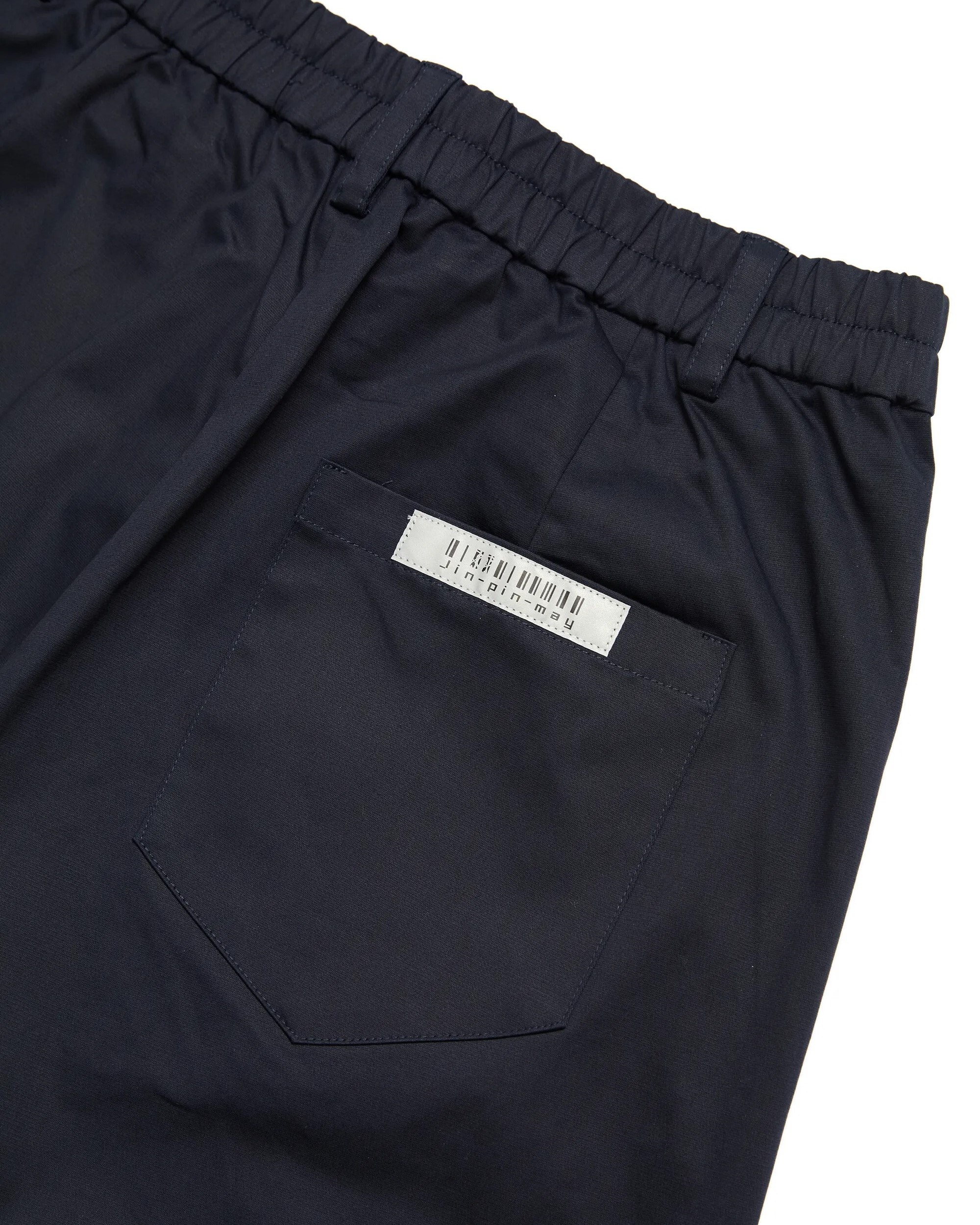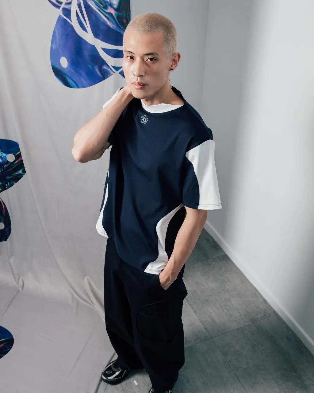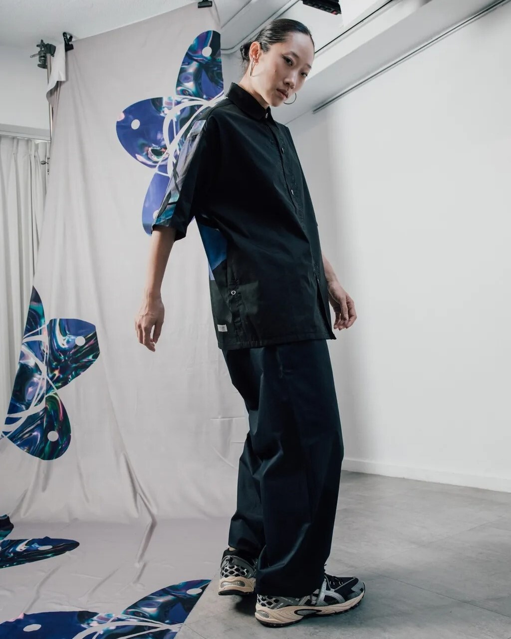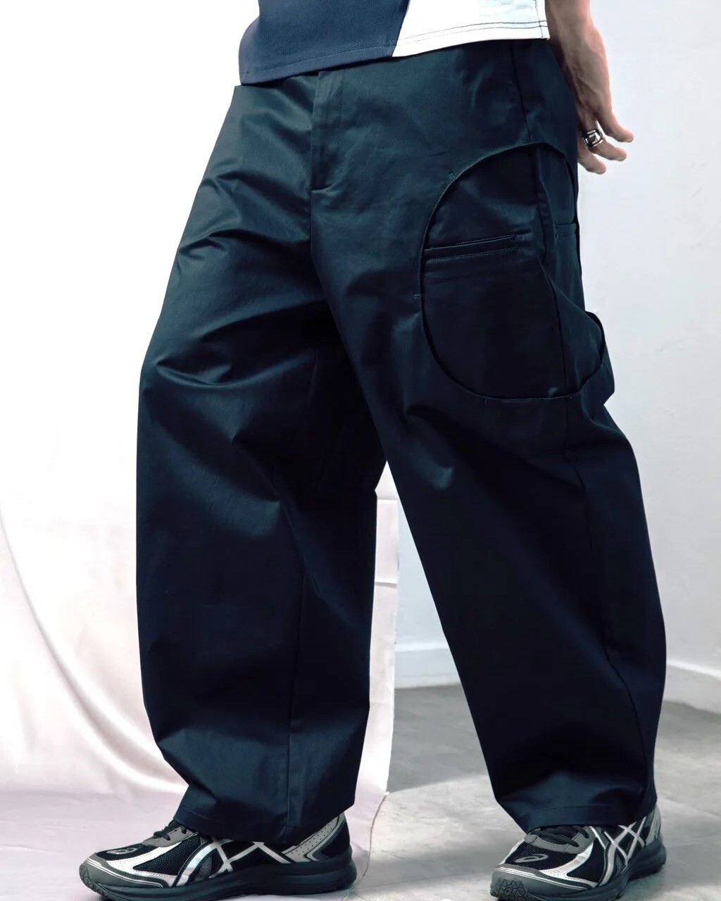 顛覆一般工裝褲的設計,運用幾何解構手法,改以圓形外框與隱形拉鍊設計,重塑實用機能與設計語彙間的平衡。中腰設定更適合不分性別的身型穿搭,以俐落錐形延續「金萍梅 Jinpinmay」 關於兩種設計語言並肩而行的故事。
