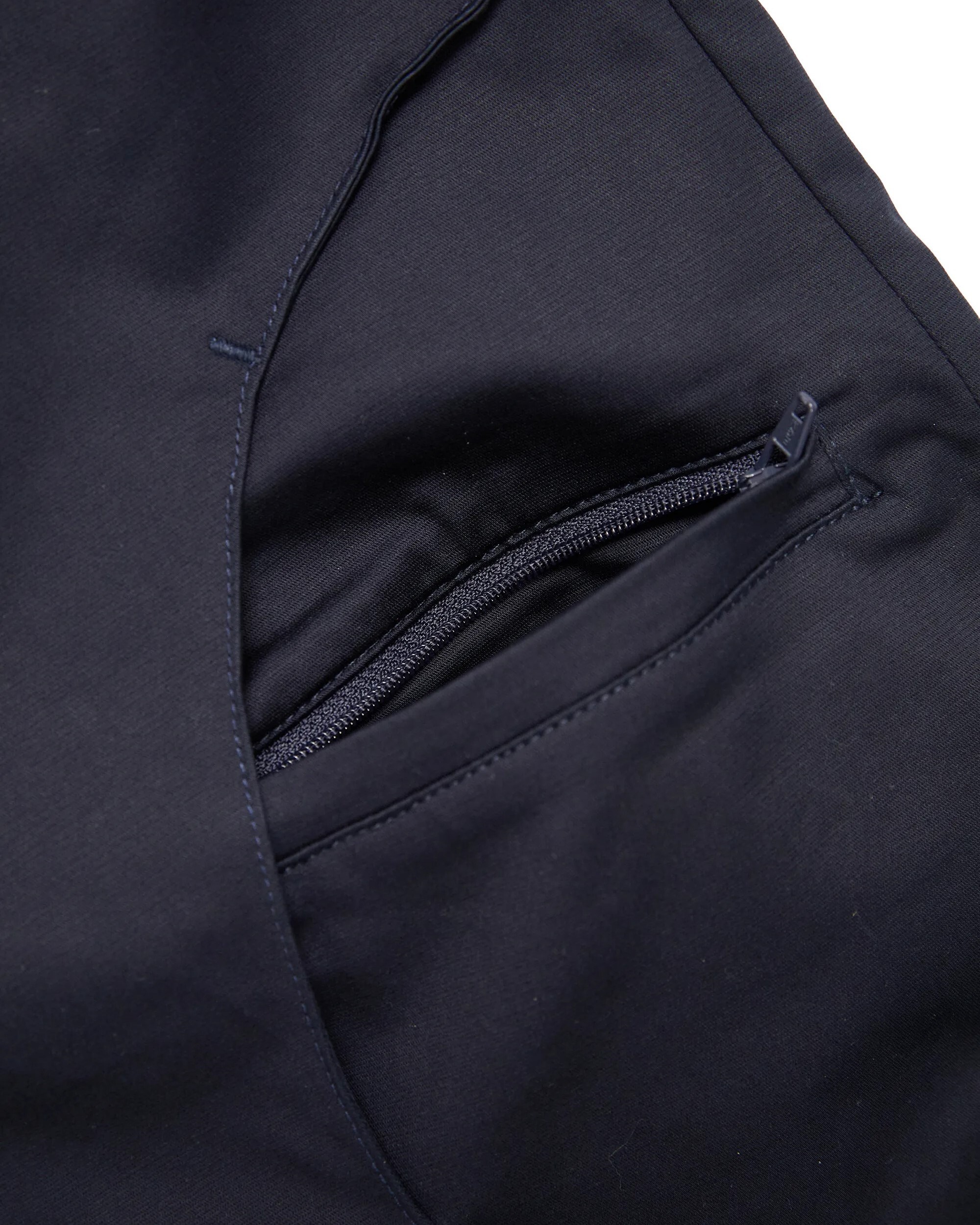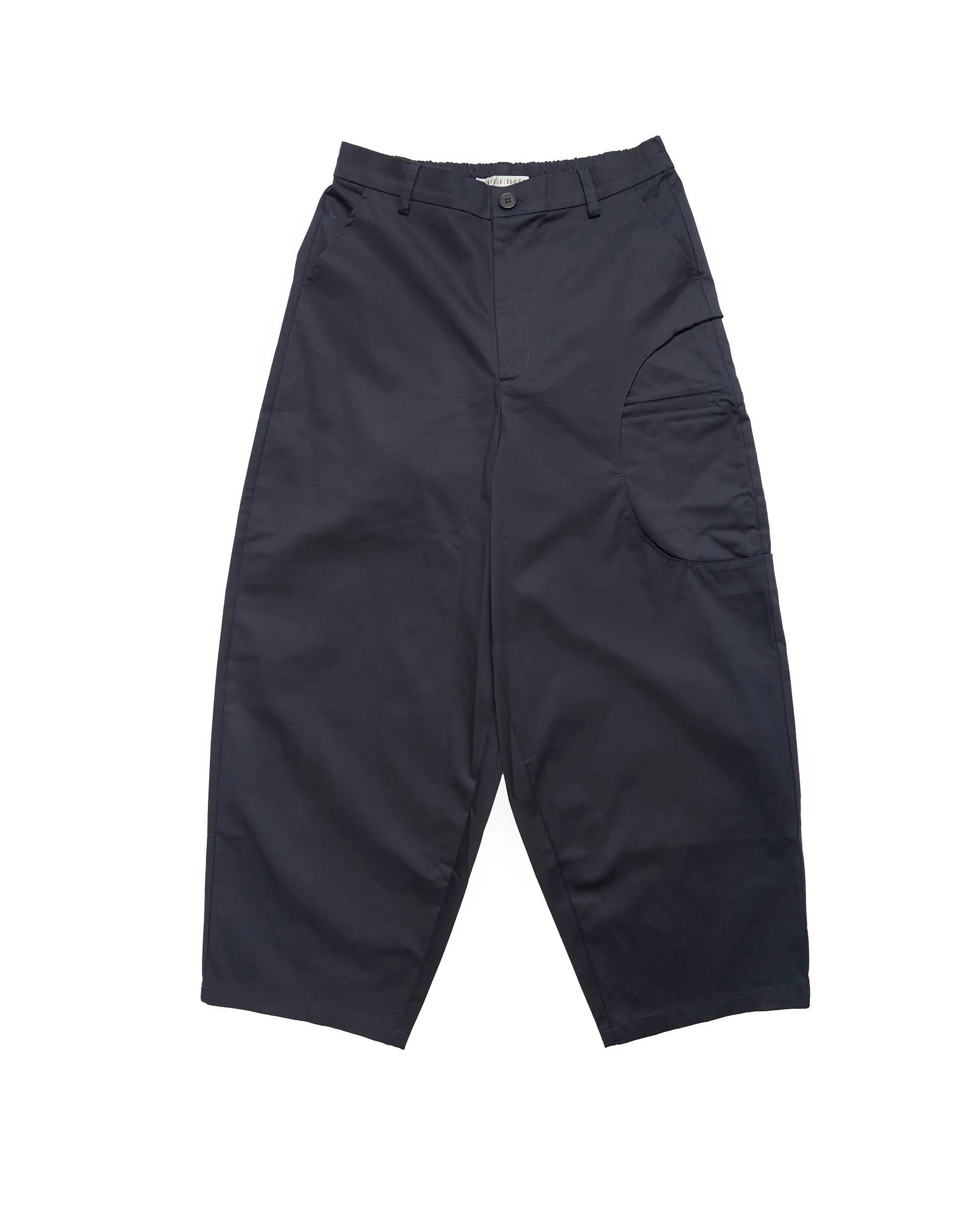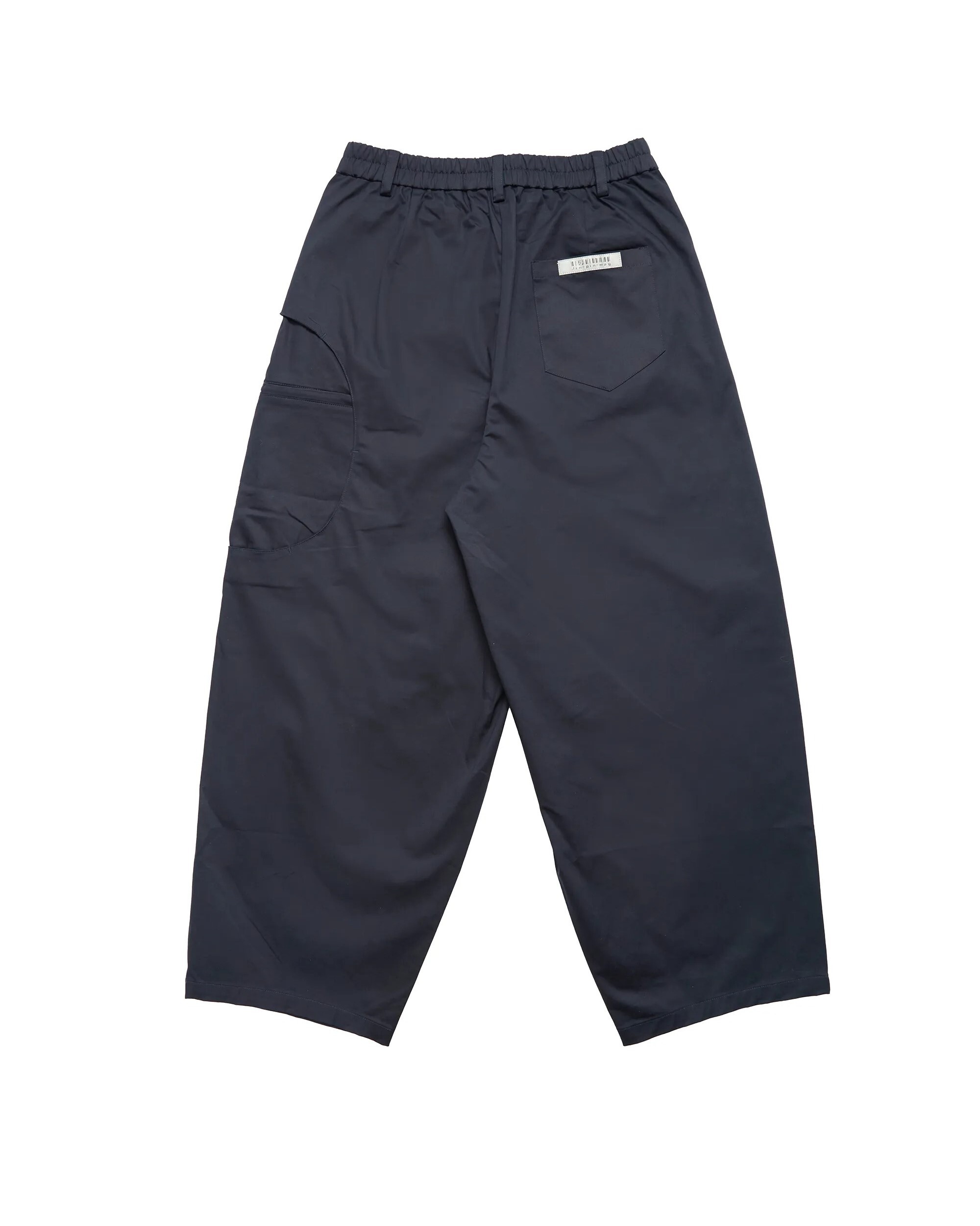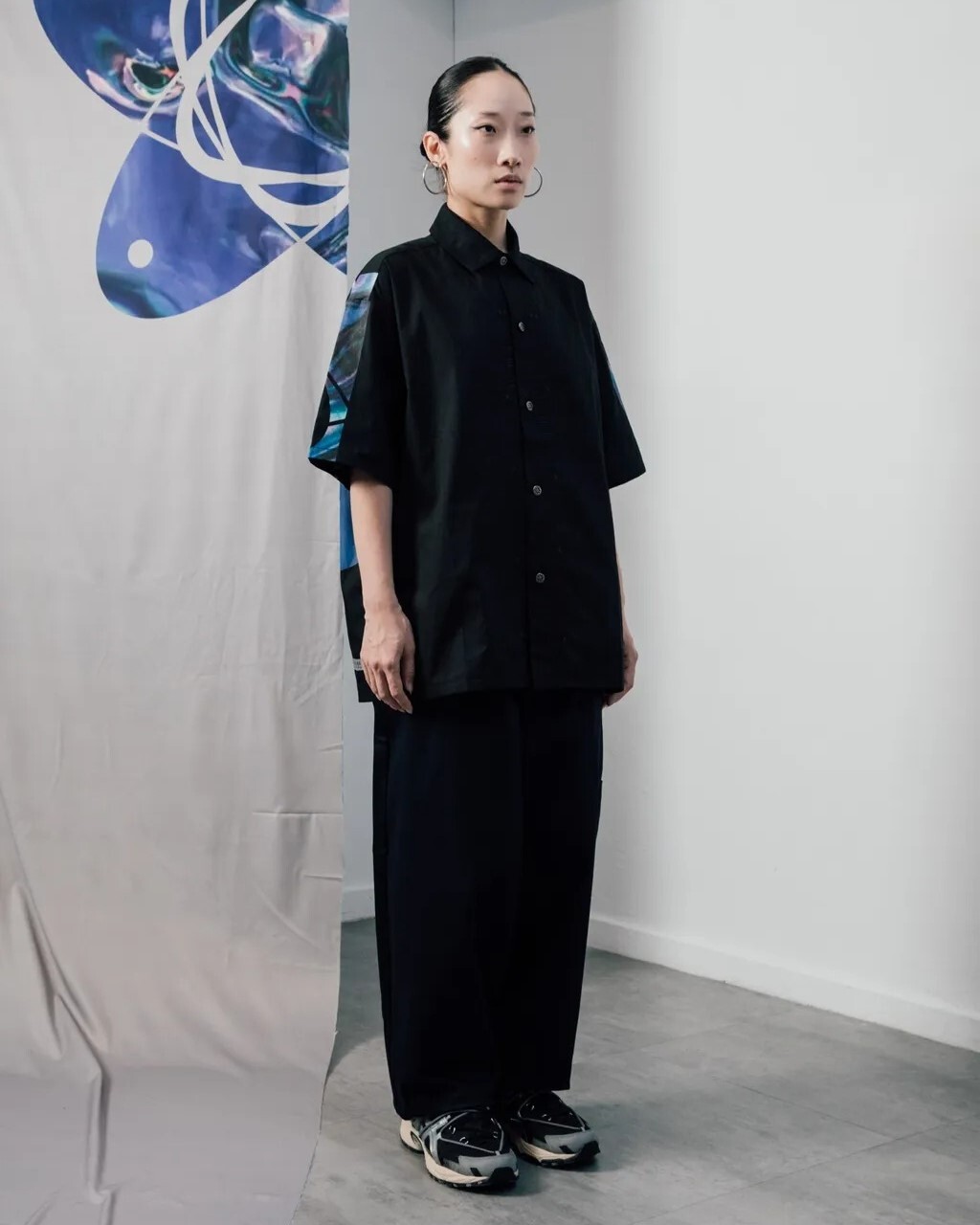 顛覆一般工裝褲的設計,運用幾何解構手法,改以圓形外框與隱形拉鍊設計,重塑實用機能與設計語彙間的平衡。中腰設定更適合不分性別的身型穿搭,以俐落錐形延續「金萍梅 Jinpinmay」 關於兩種設計語言並肩而行的故事。