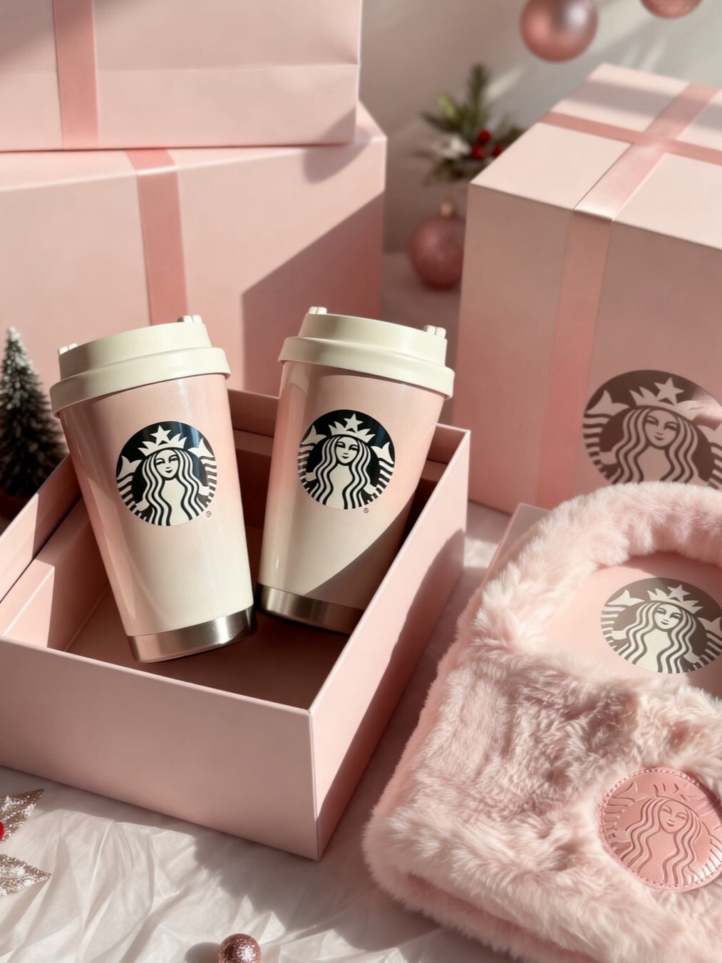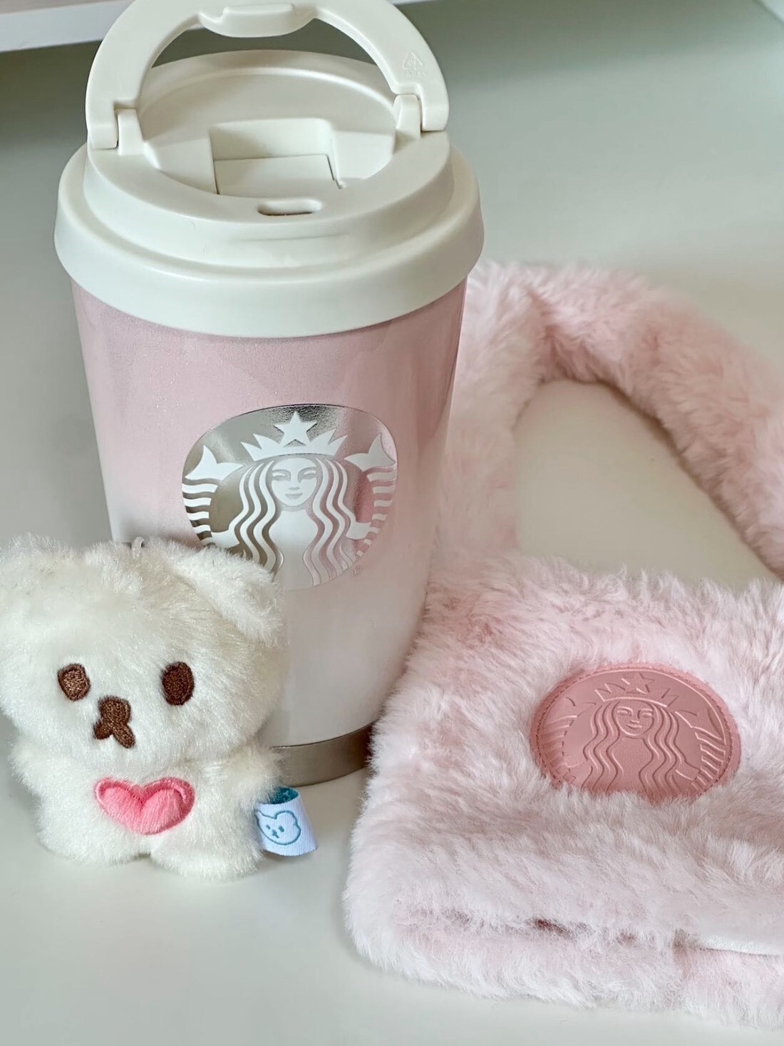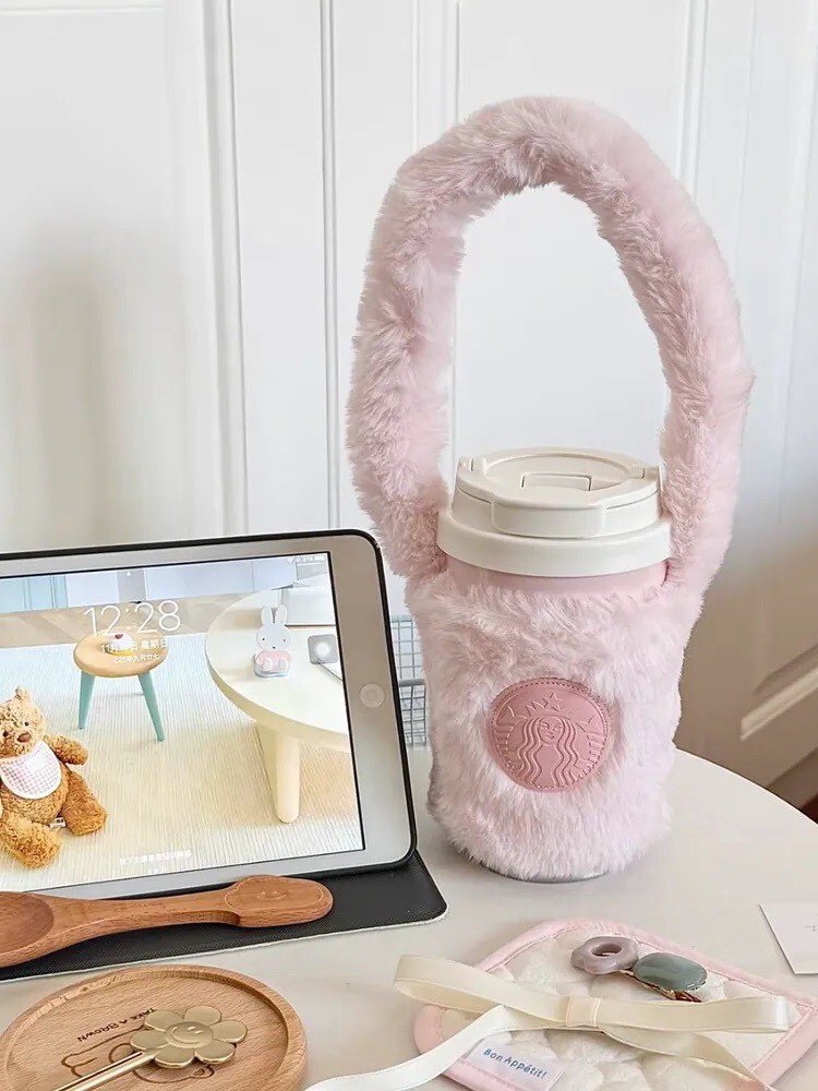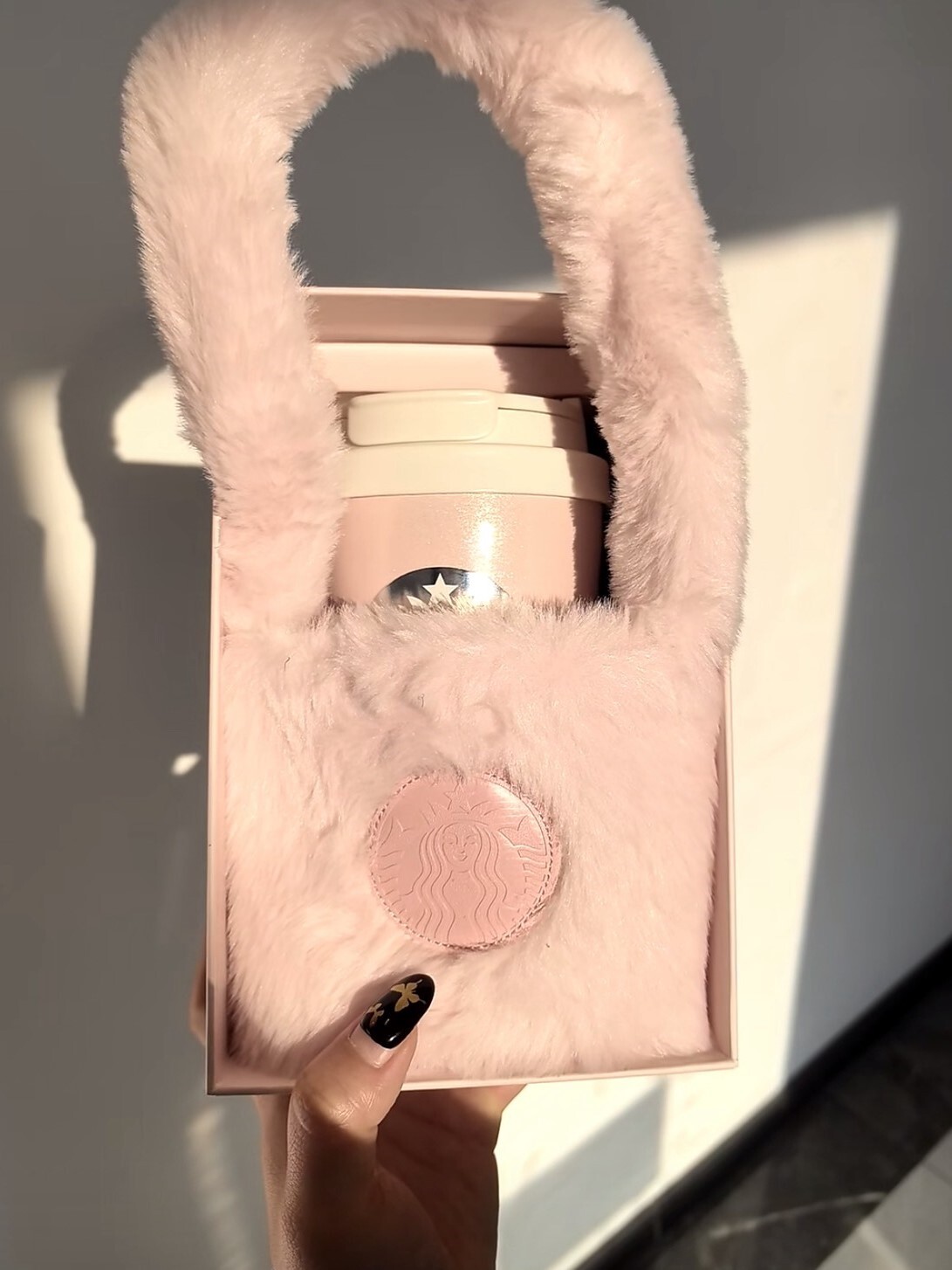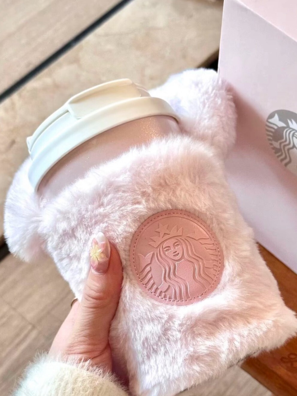 Starbucks 星巴克 漸層粉白 隨行杯+毛毛杯套 禮盒組