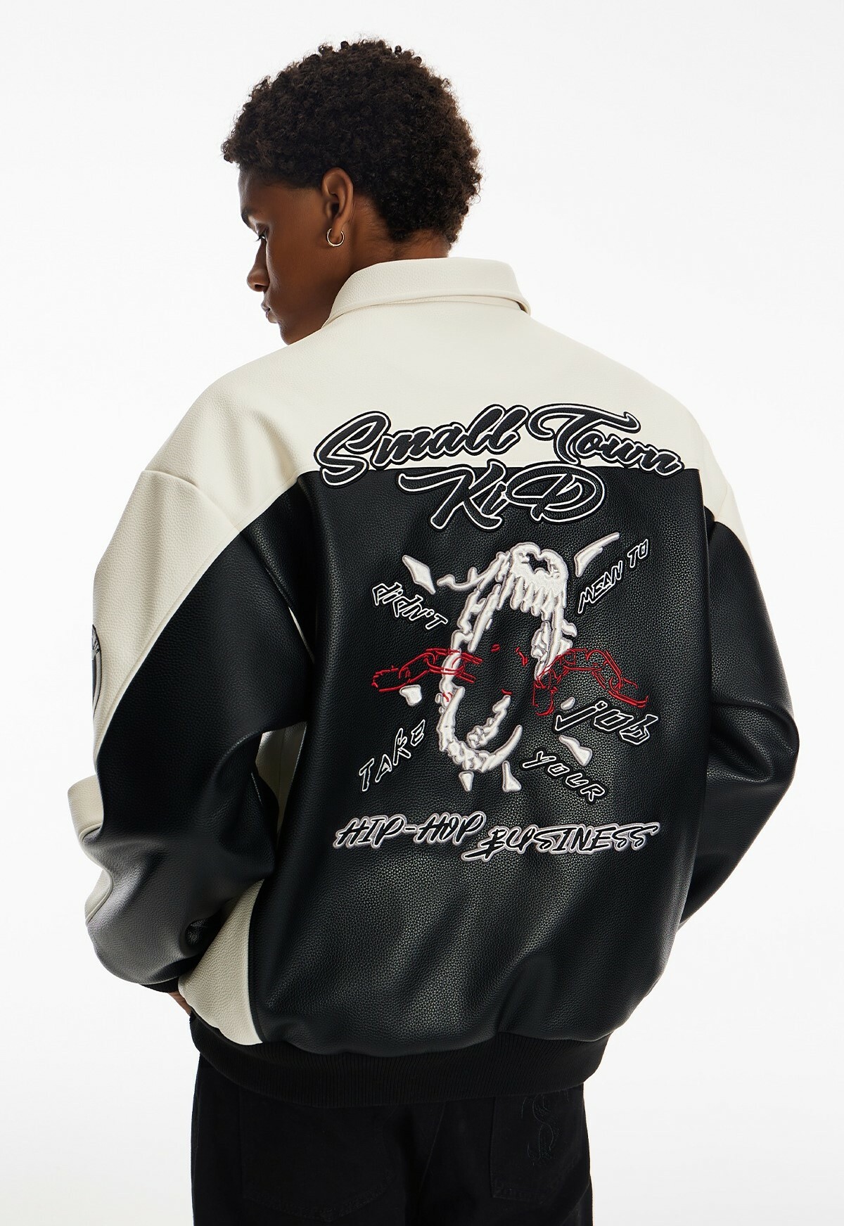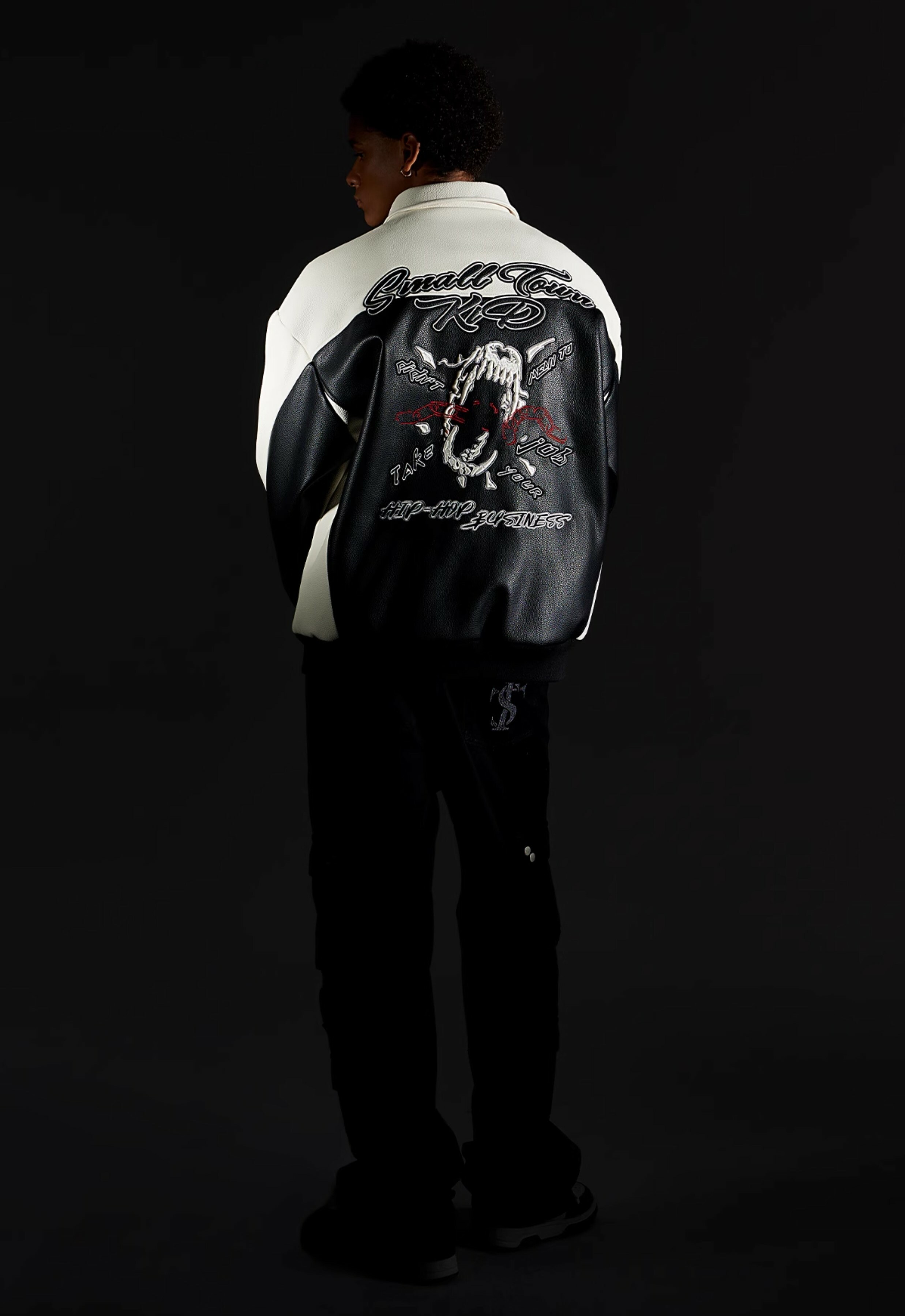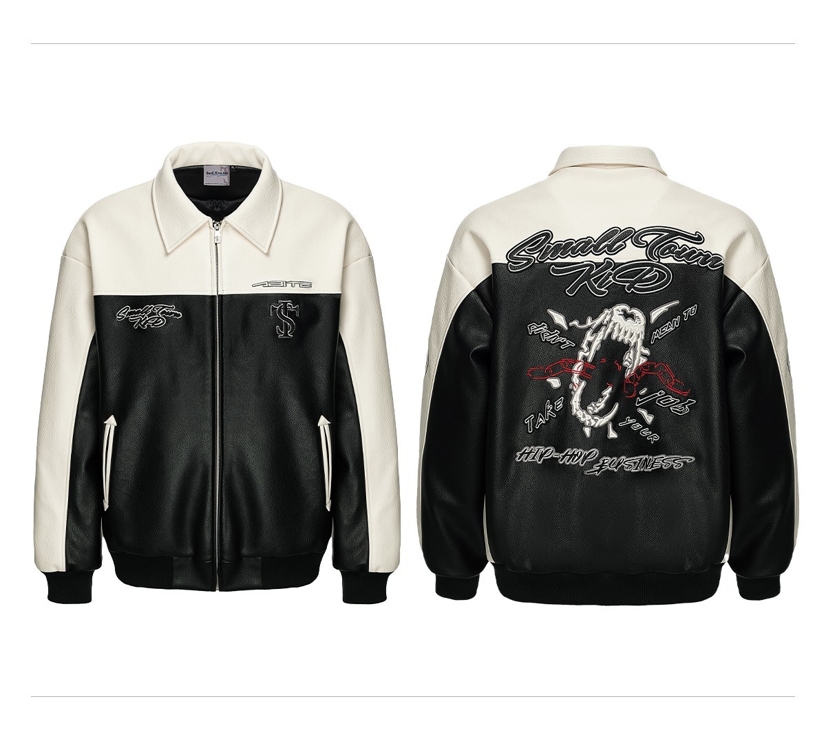 STK SmallTownKid black and white stitching skull chain leather jacket