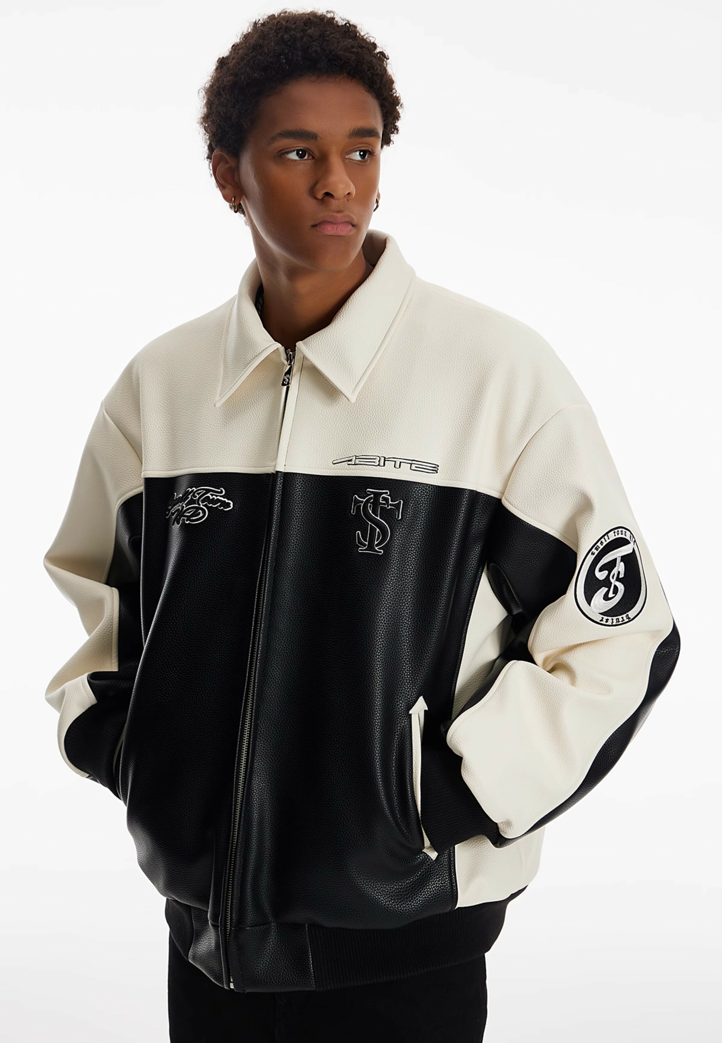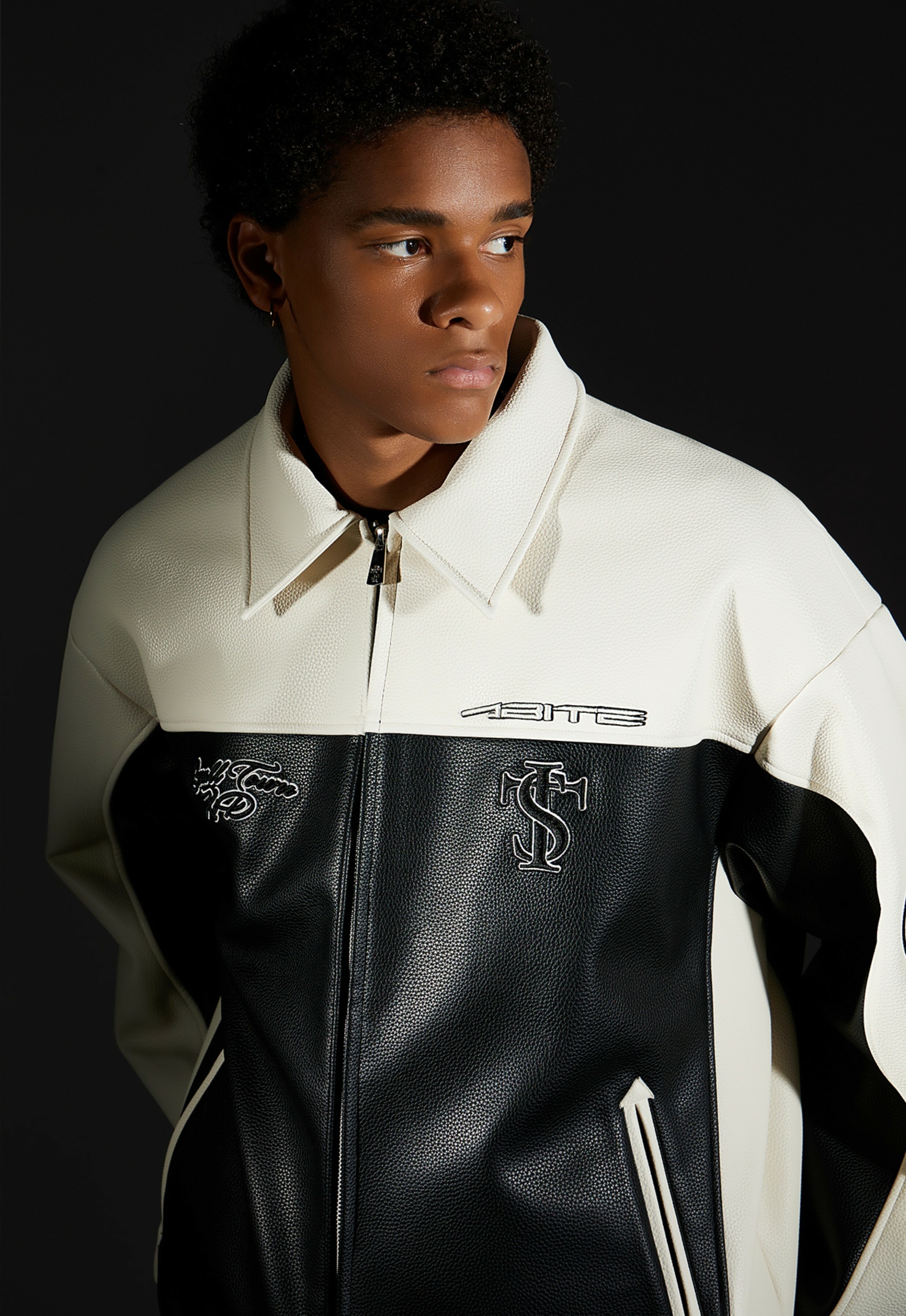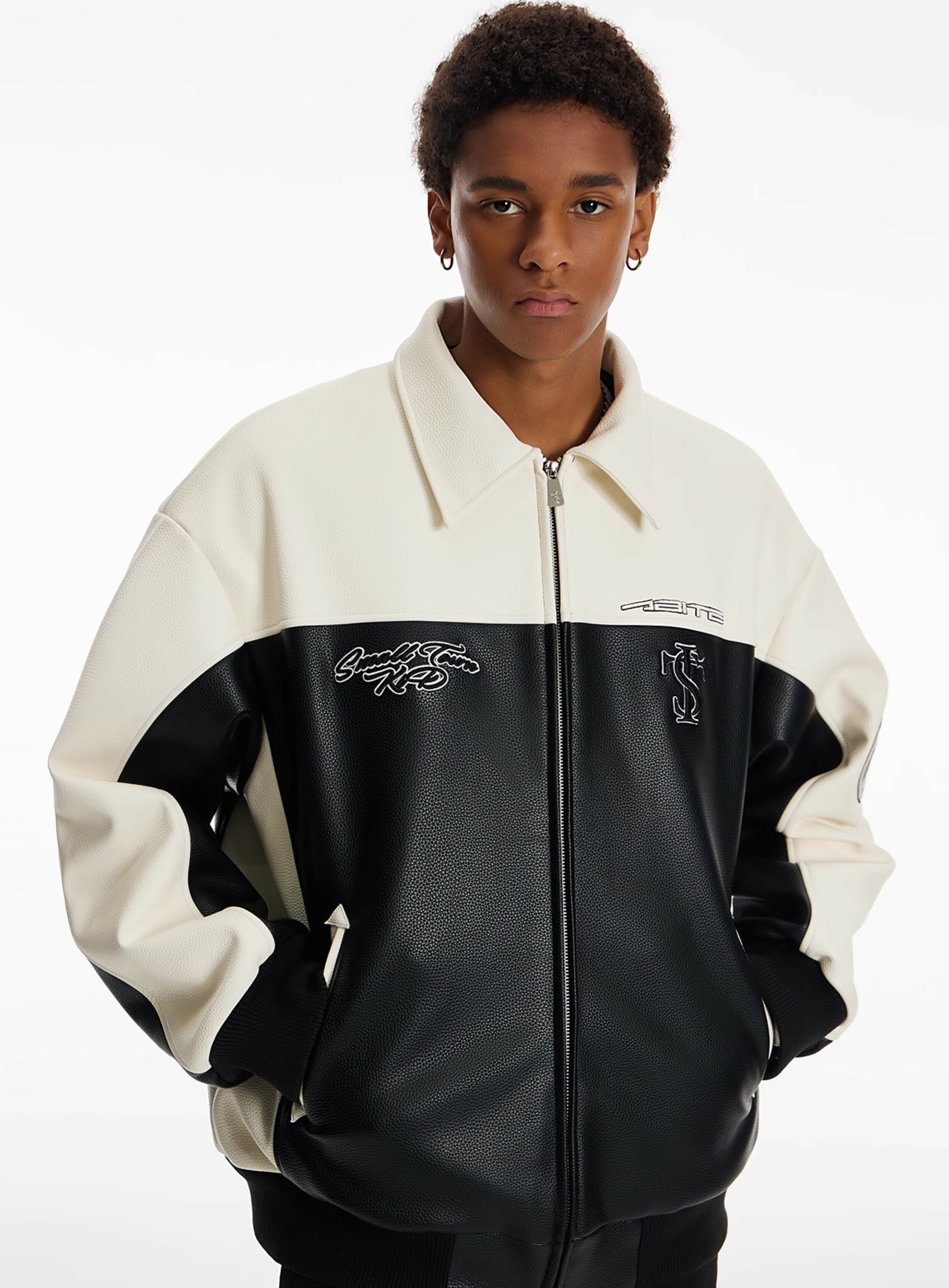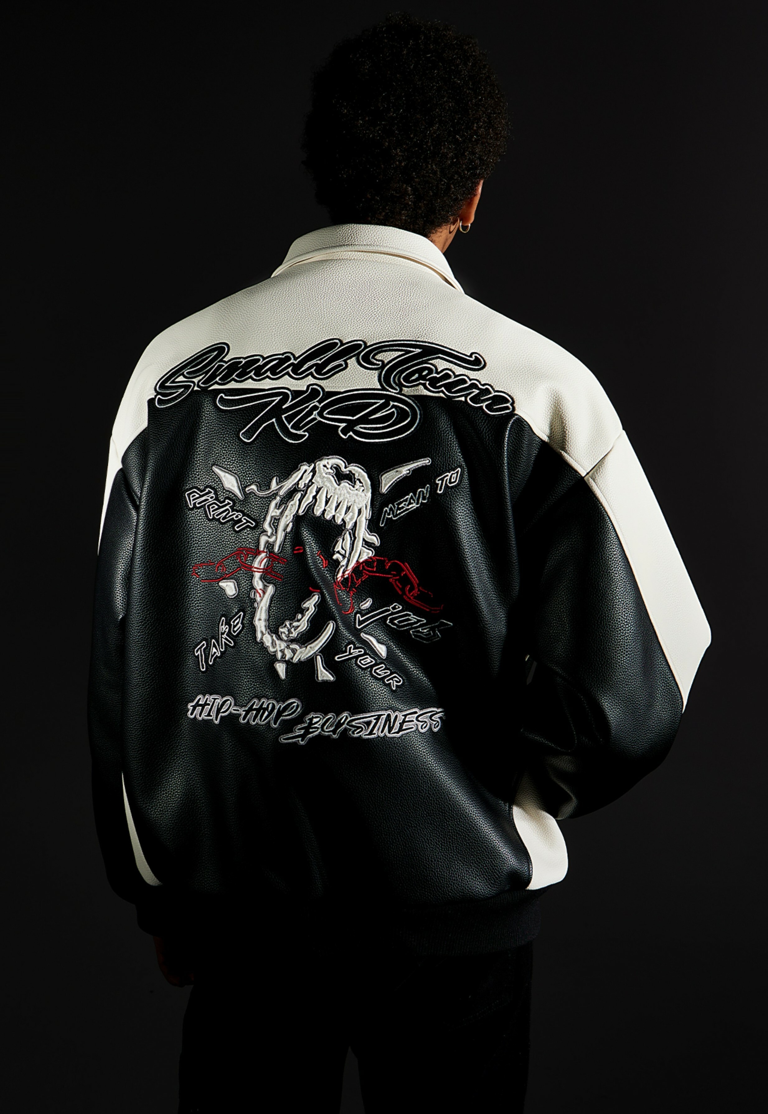 STK SmallTownKid black and white stitching skull chain leather jacket