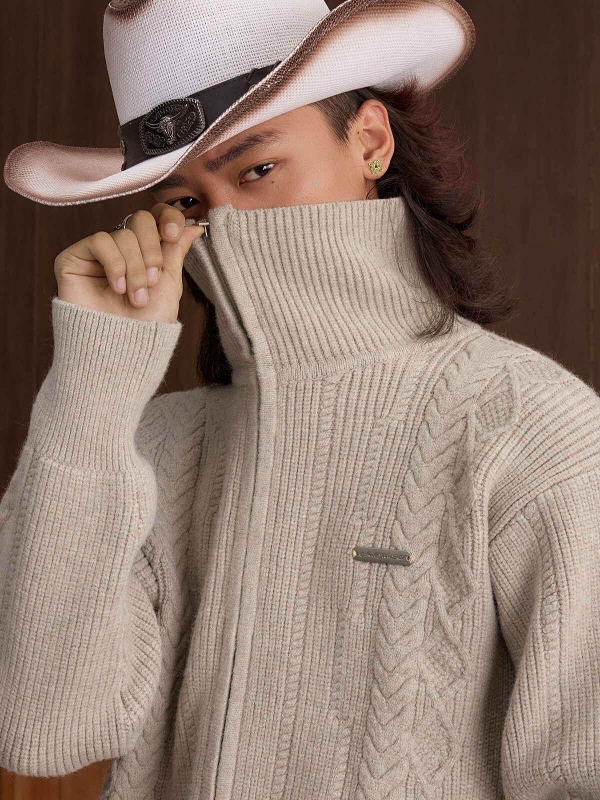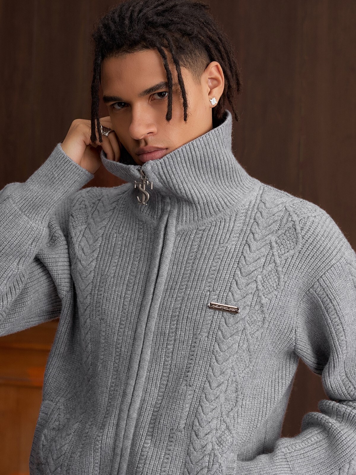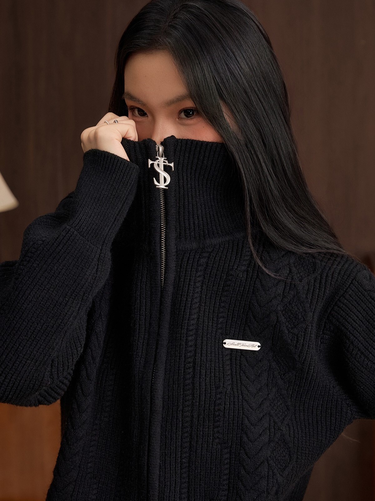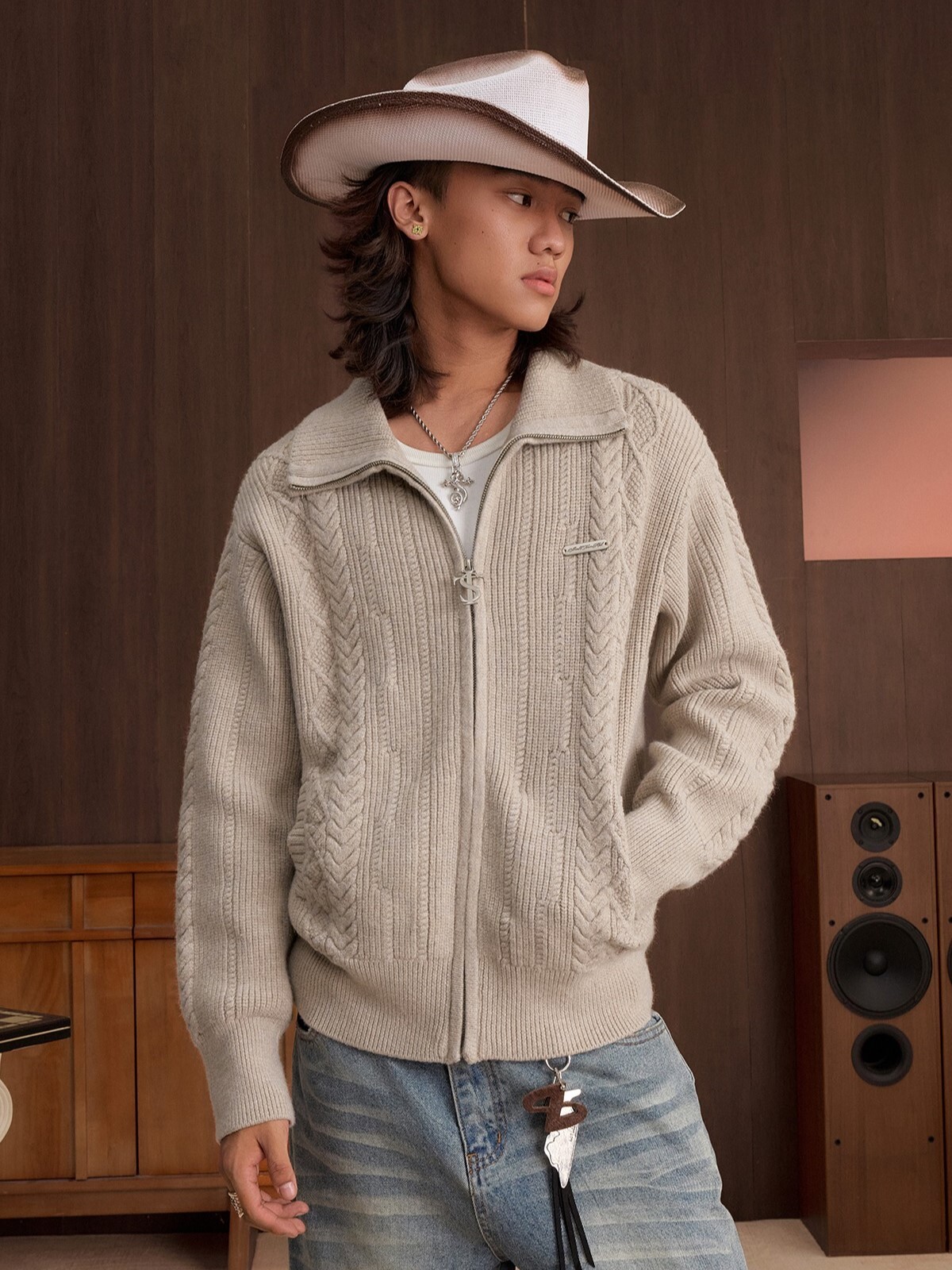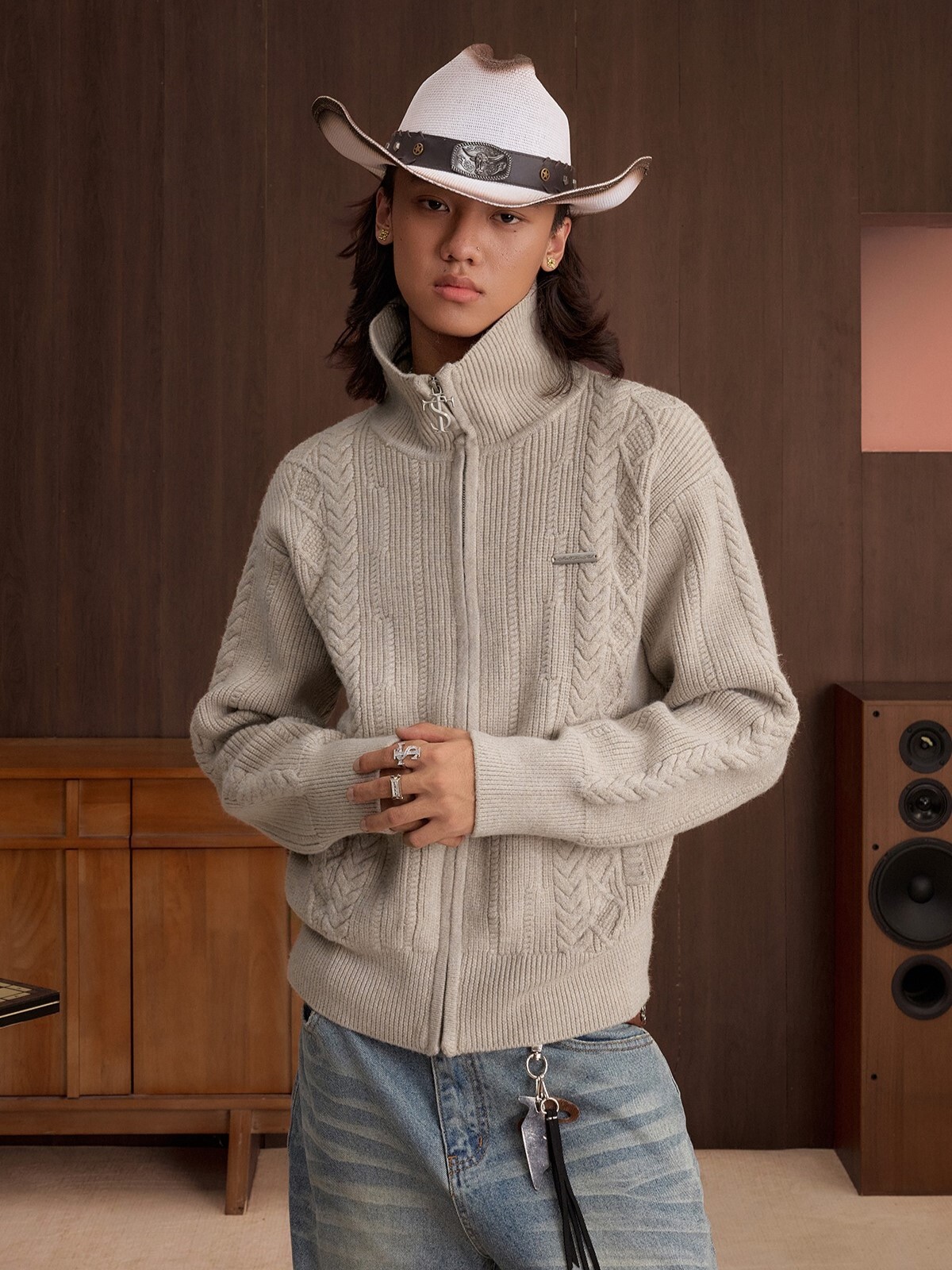 STK SmallTownKid 十字Logo拉鍊 雙絞花麥穗 針織立領外套