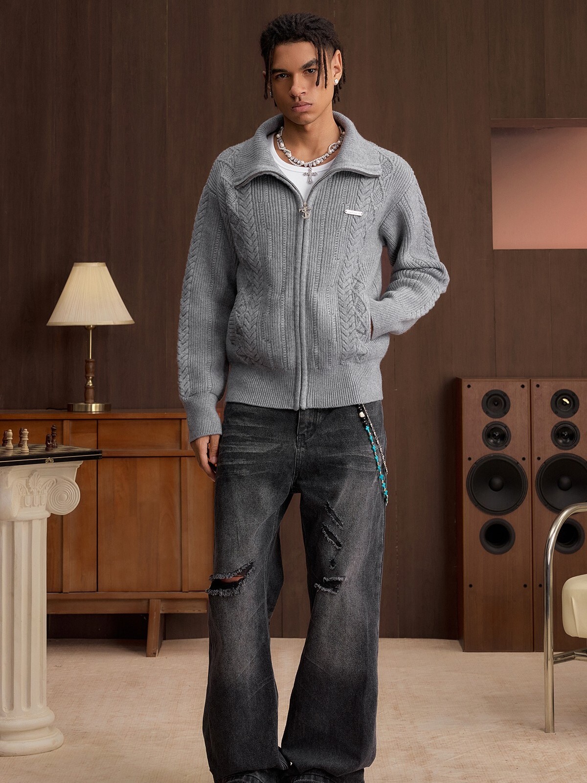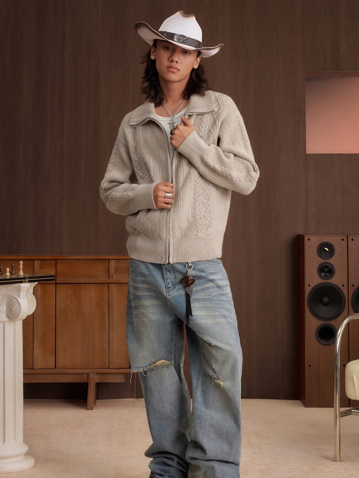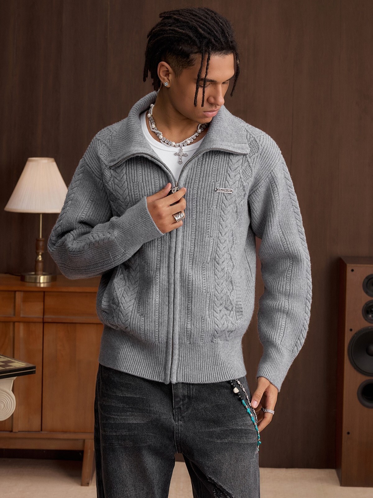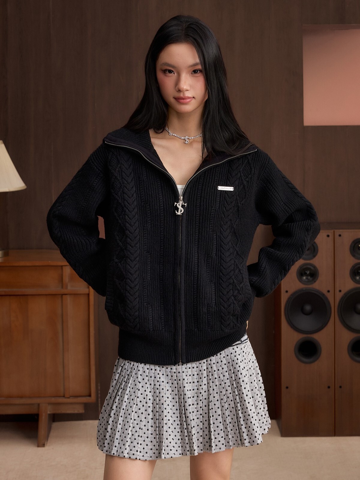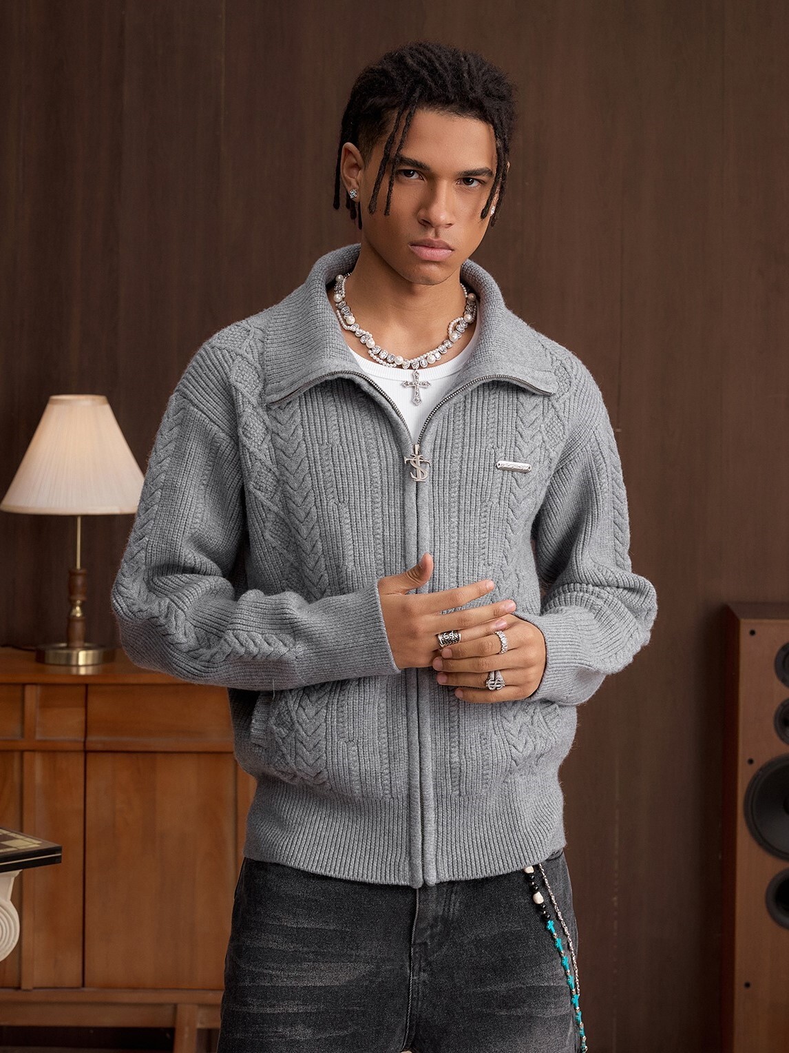 STK SmallTownKid 十字Logo拉鍊 雙絞花麥穗 針織立領外套