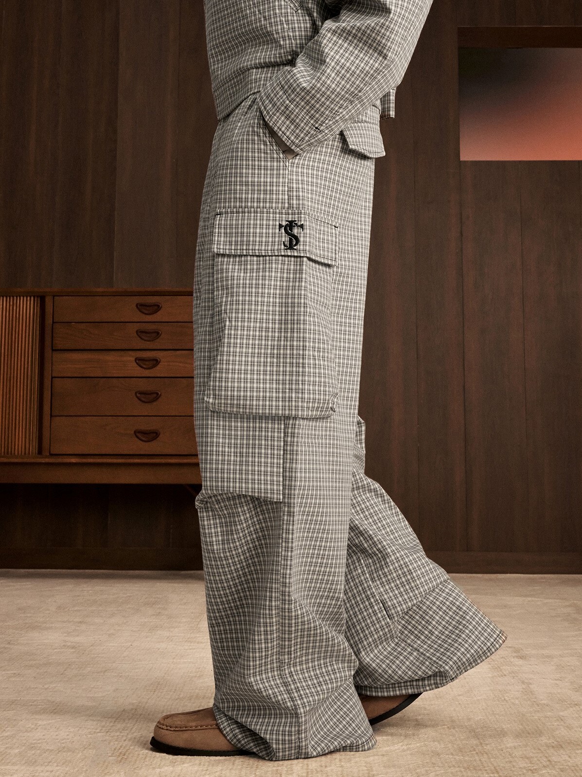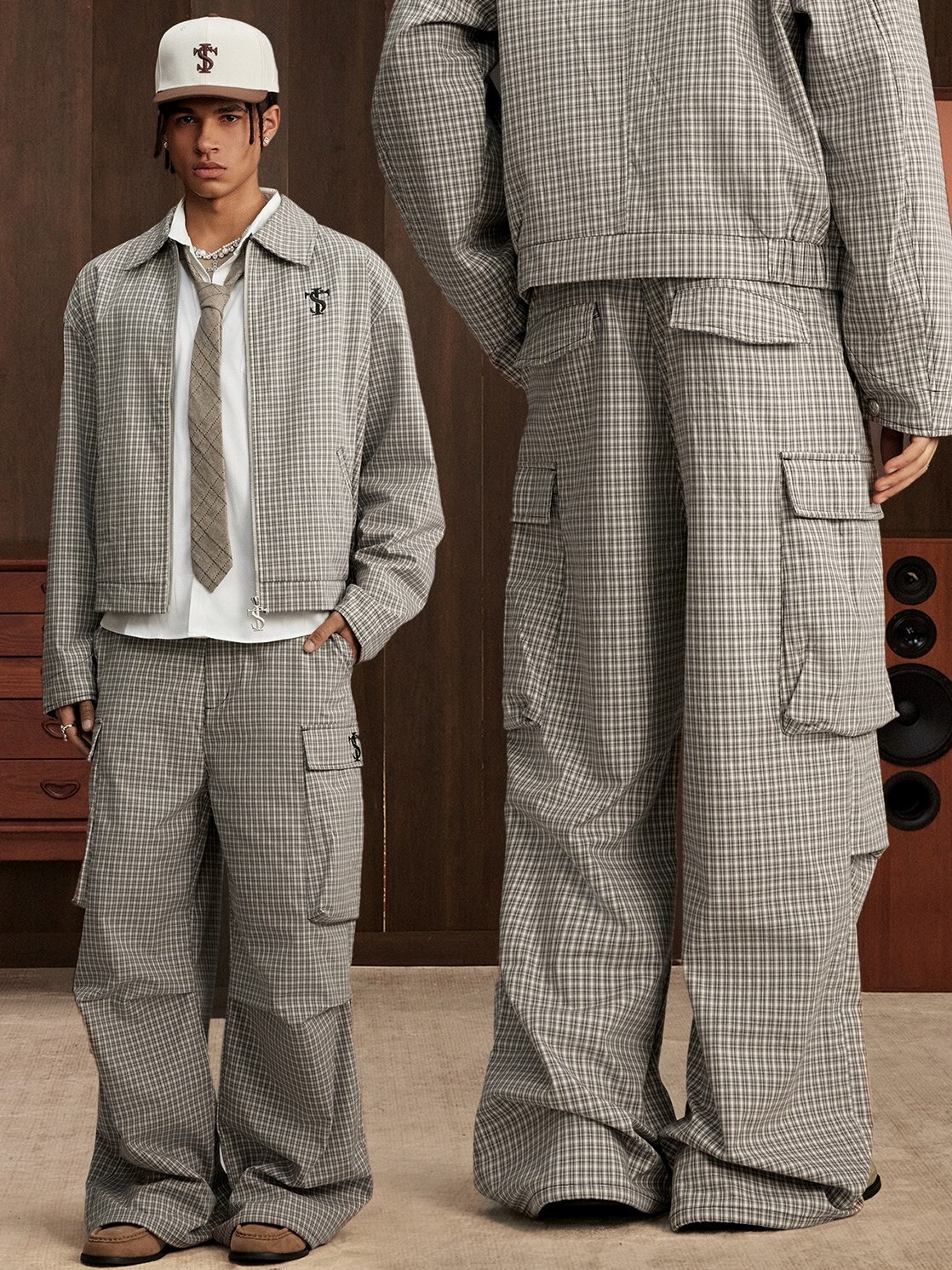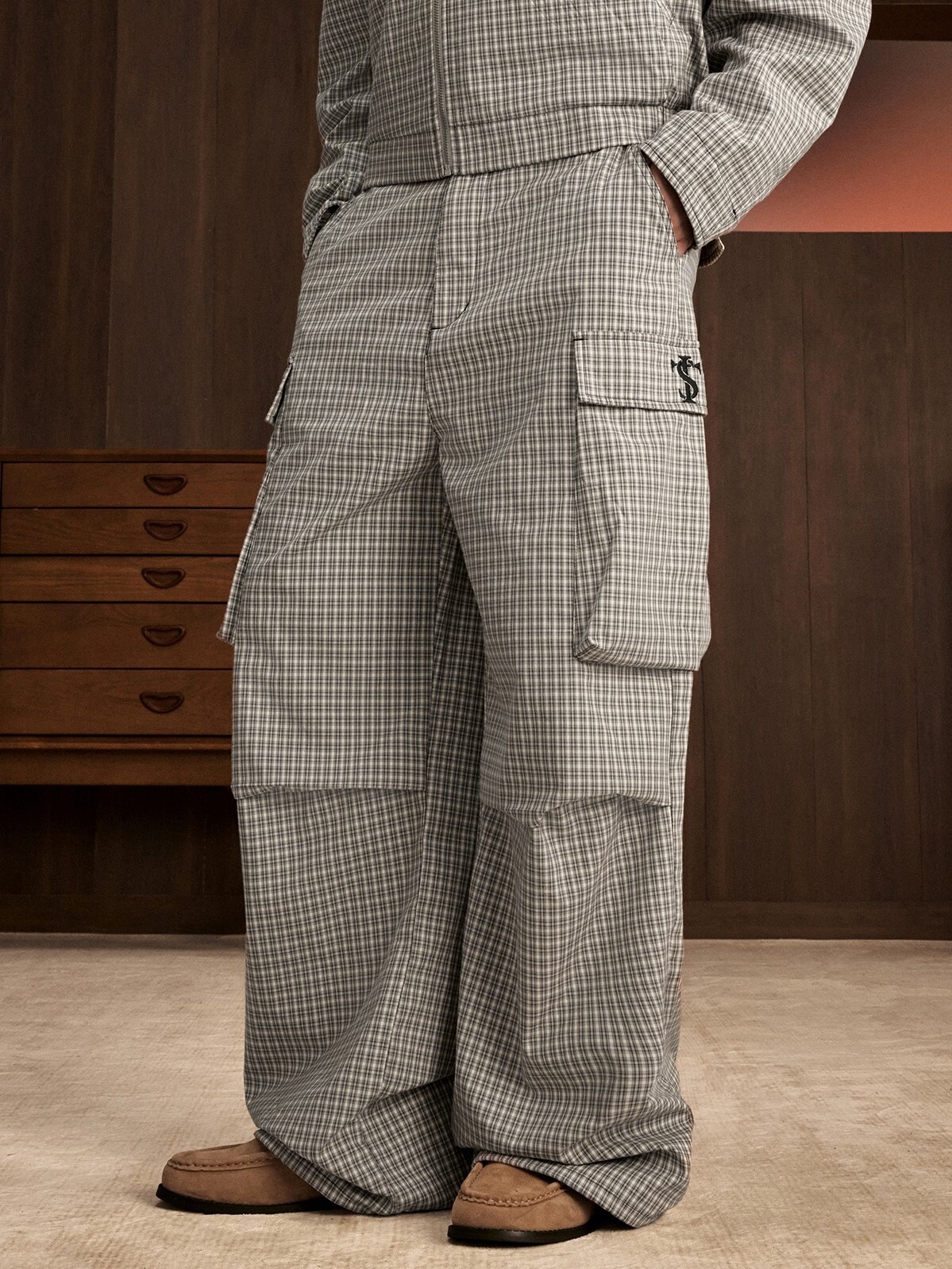 STK SmallTownKid 刺繡Logo 大口袋 格紋工裝長褲
