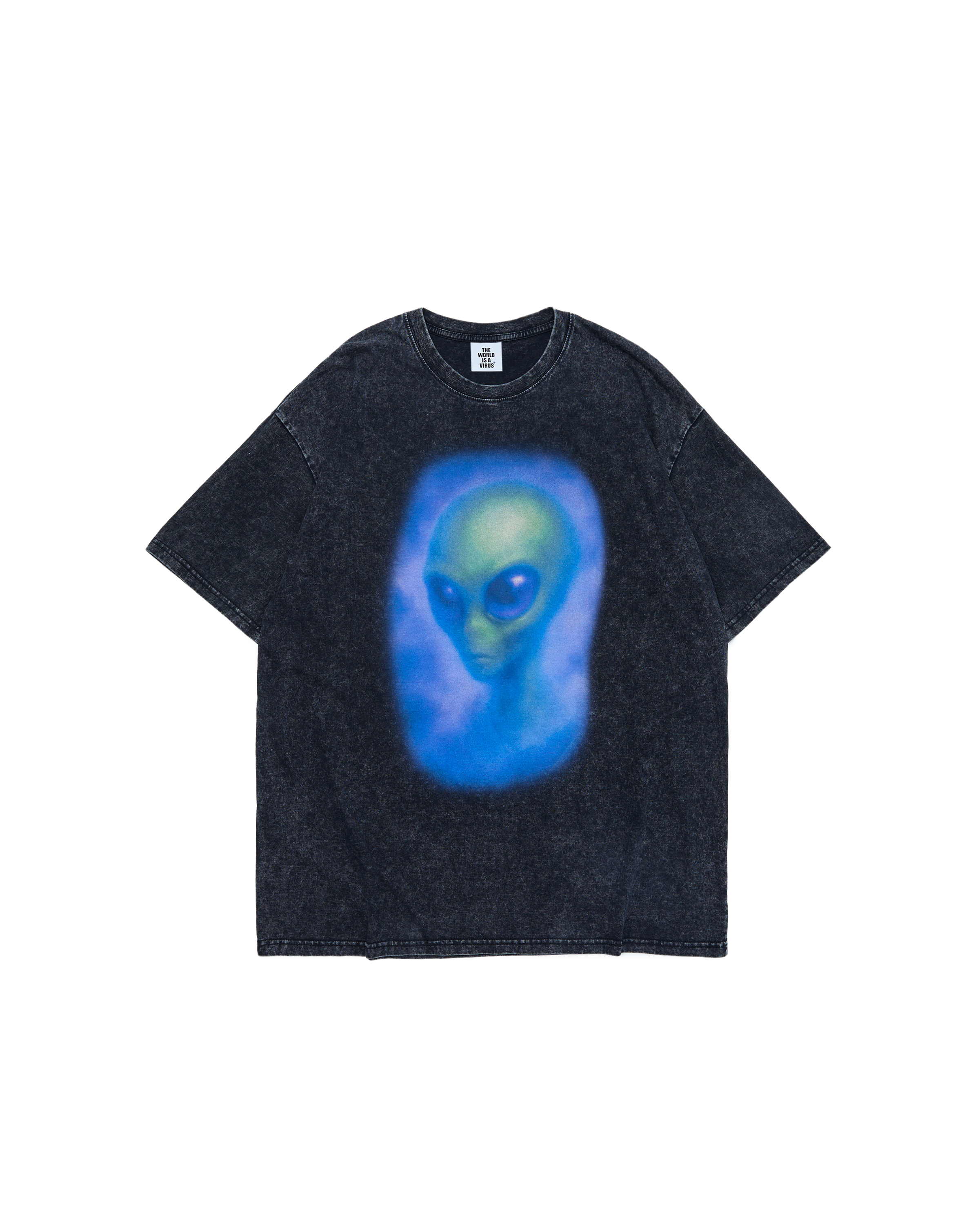 一張來自未知星域的臉孔,靜靜注視著你。VIRUSWORLD 將藍綠霧化筆觸印製在仿舊水洗棉上,構成一幅既超現實又詭譎的接觸圖像。像是失焦的錄像記錄,又像一場記憶中斷的瞬間。