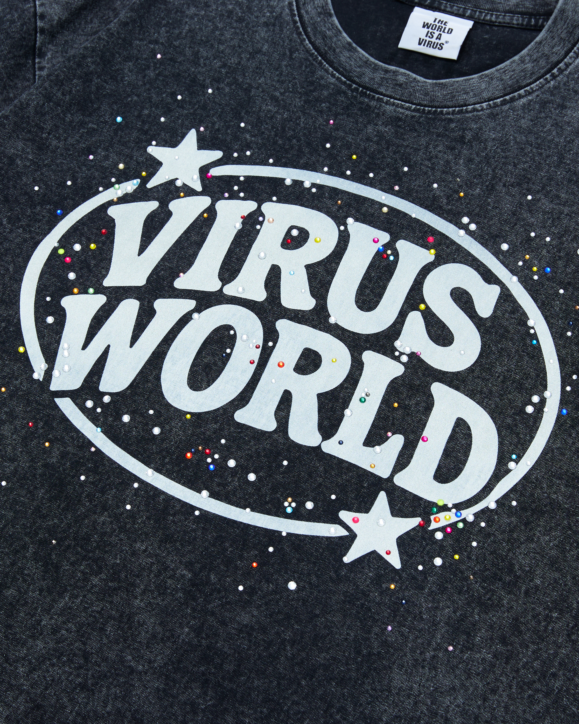 VIRUSWORLD 經典標語以星形邊框包圍,搭配多色亮鑽點綴,宛如病毒在宇宙中擴散的軌跡。特殊水洗黑棉營造出仿舊質感,完美呼應品牌的末日科幻氛圍。每一顆亮片如流星墜落,反映出迷幻與混亂交錯的世界觀。穿上它,即是進入病毒宇宙的起點。