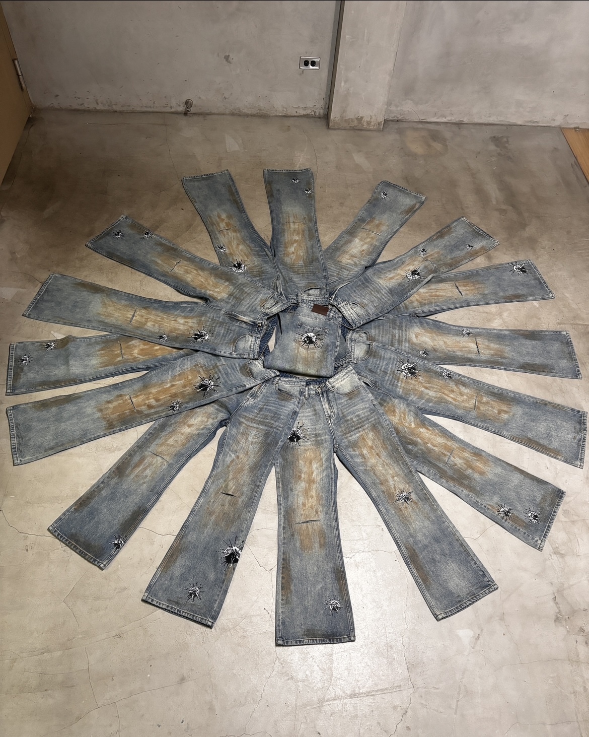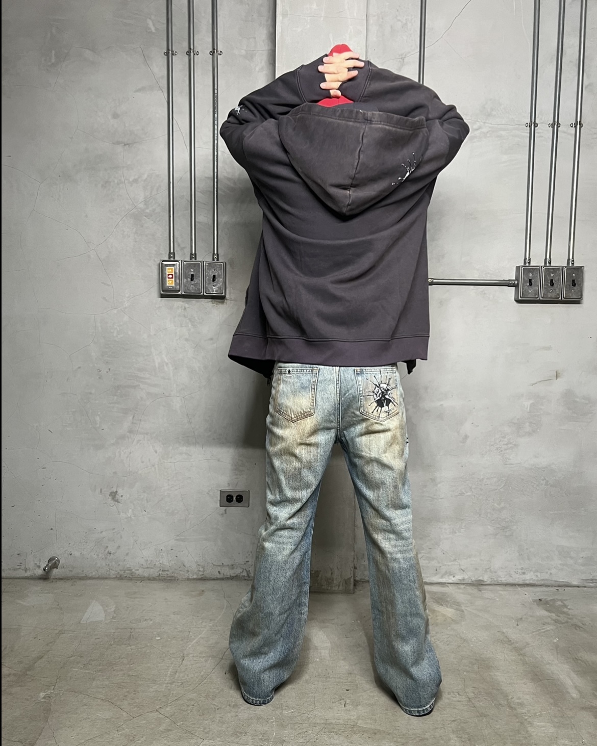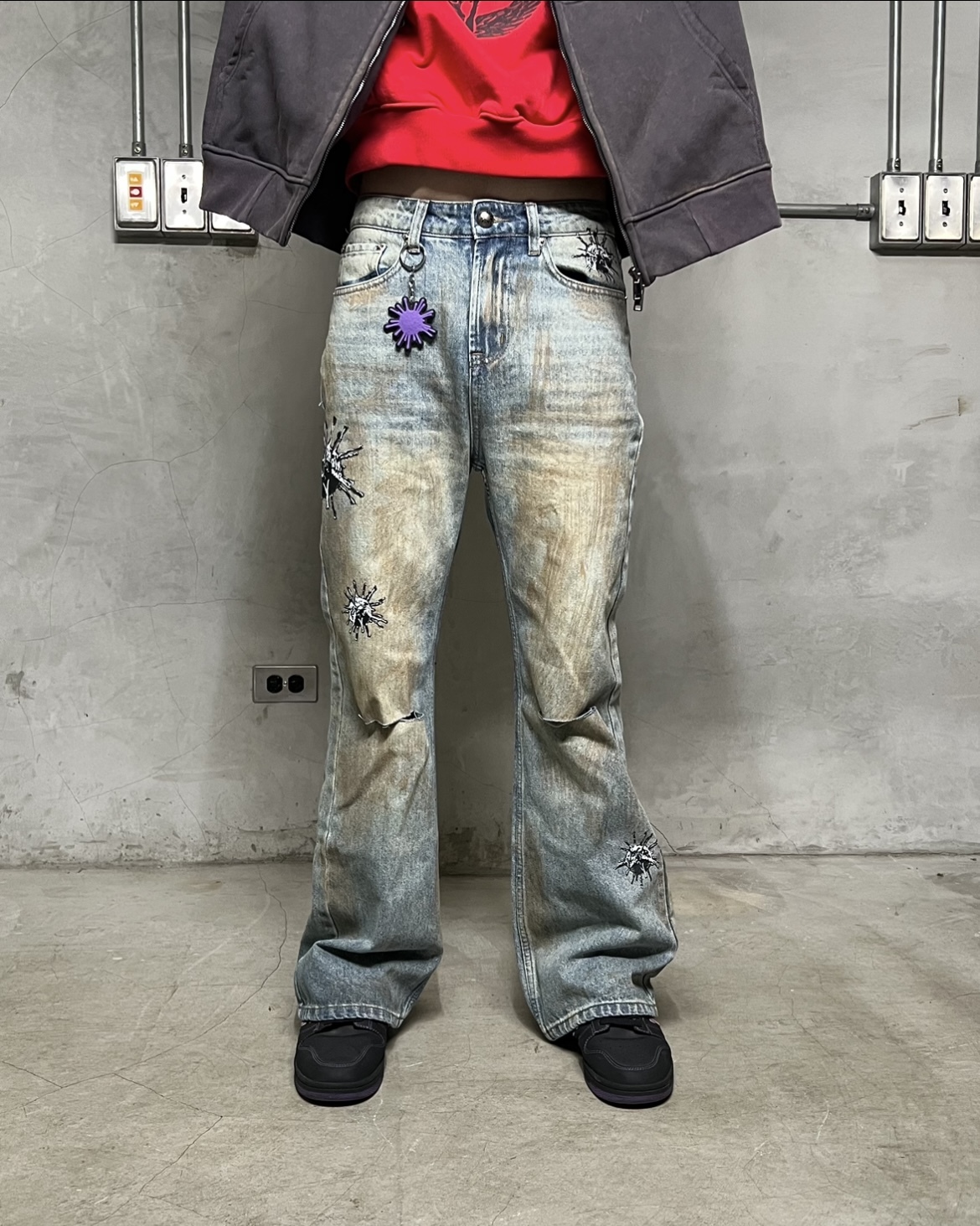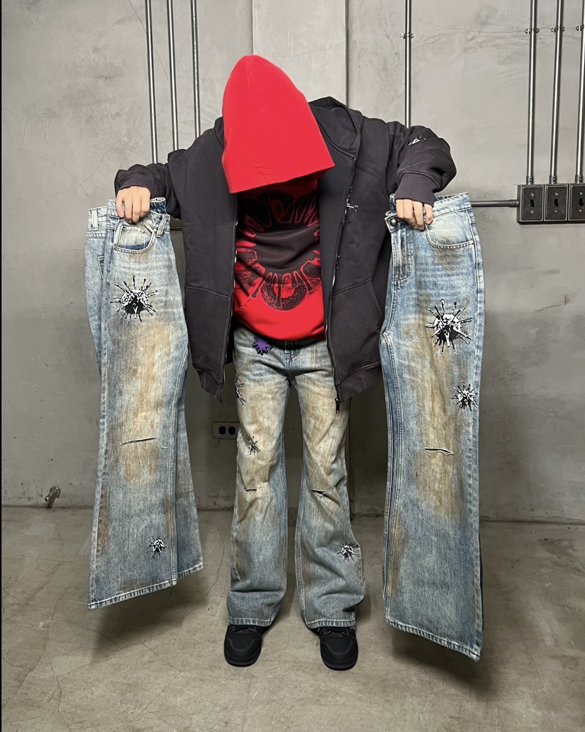 VIRUSWORLD 手繪泥染牛仔褲,融合手工泥染與街頭藝術元素,呈現獨特仿舊質感。後袋手繪病毒圖案增添個性細節,且每件因手工繪製,圖案位置會略有不同,打造獨特風格。