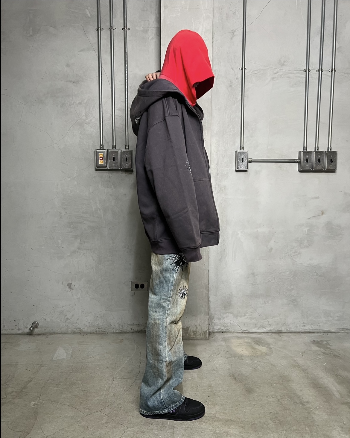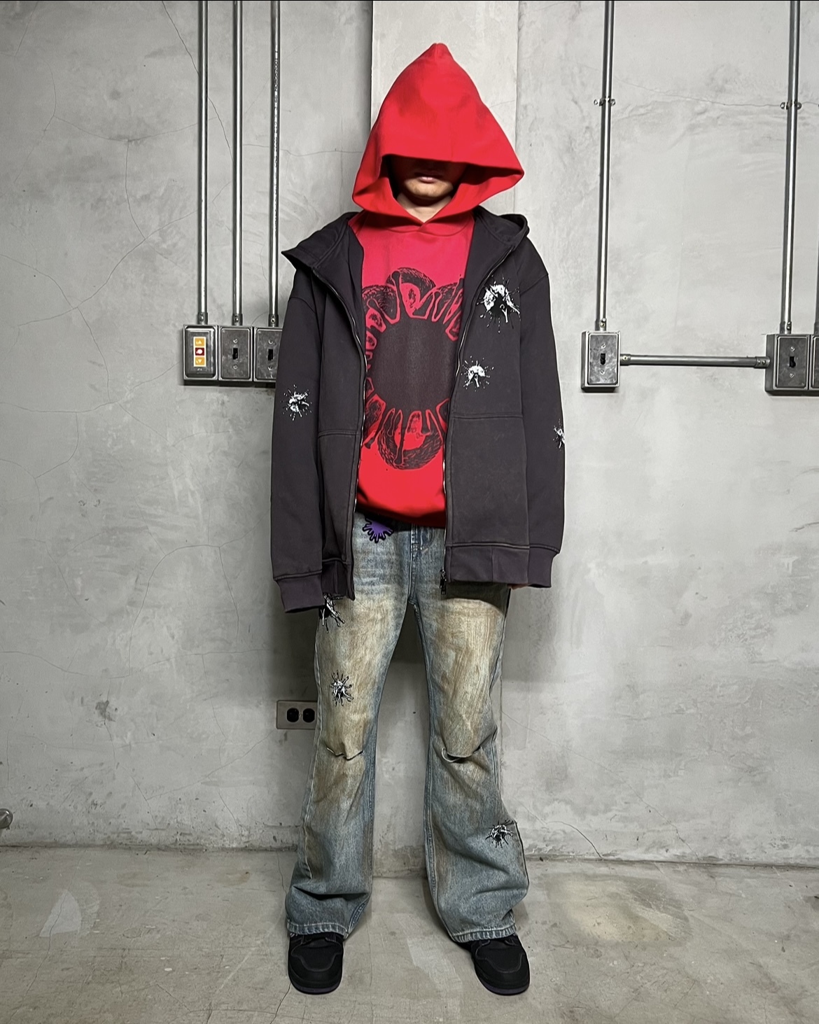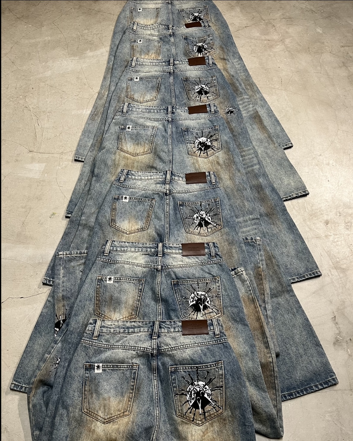 VIRUSWORLD 手繪泥染牛仔褲,融合手工泥染與街頭藝術元素,呈現獨特仿舊質感。後袋手繪病毒圖案增添個性細節,且每件因手工繪製,圖案位置會略有不同,打造獨特風格。
