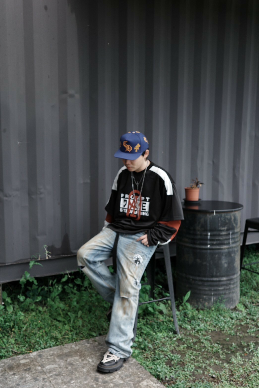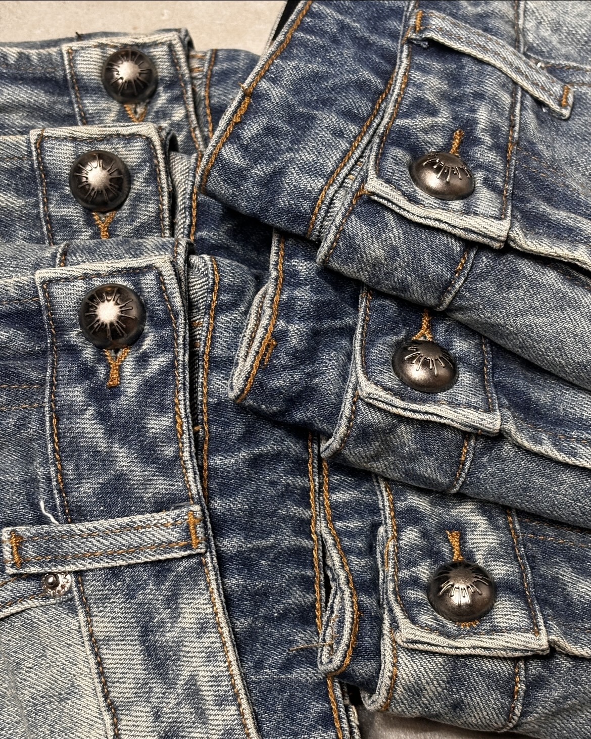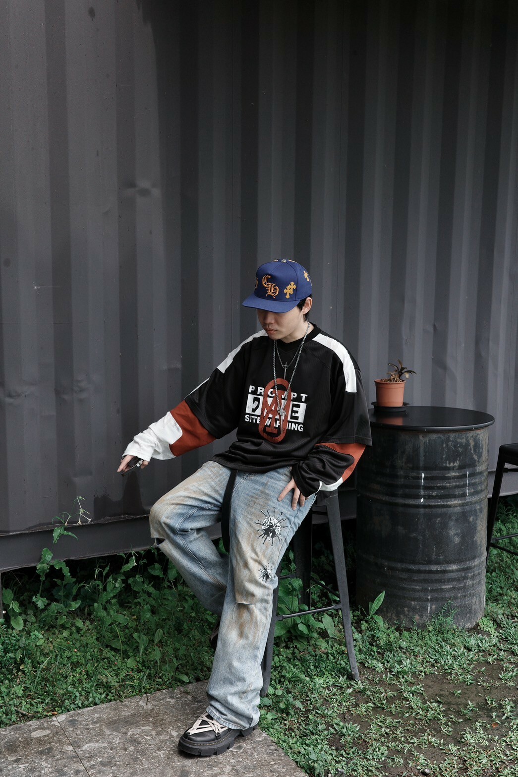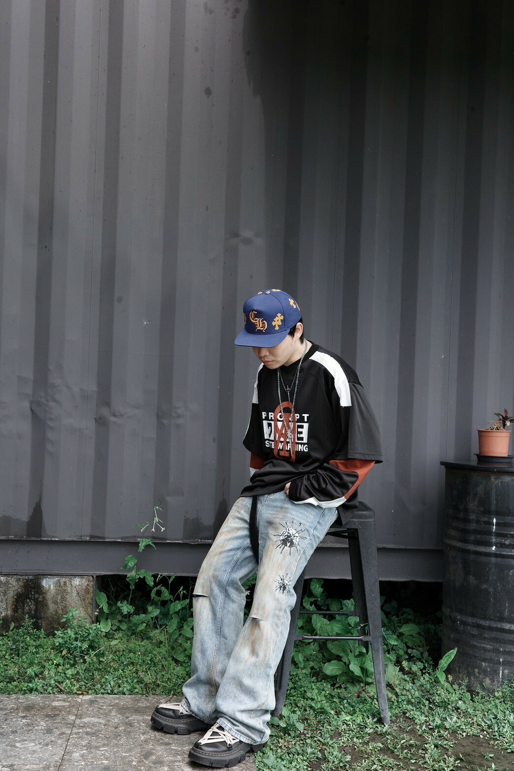 VIRUSWORLD 手繪泥染牛仔褲,融合手工泥染與街頭藝術元素,呈現獨特仿舊質感。後袋手繪病毒圖案增添個性細節,且每件因手工繪製,圖案位置會略有不同,打造獨特風格。