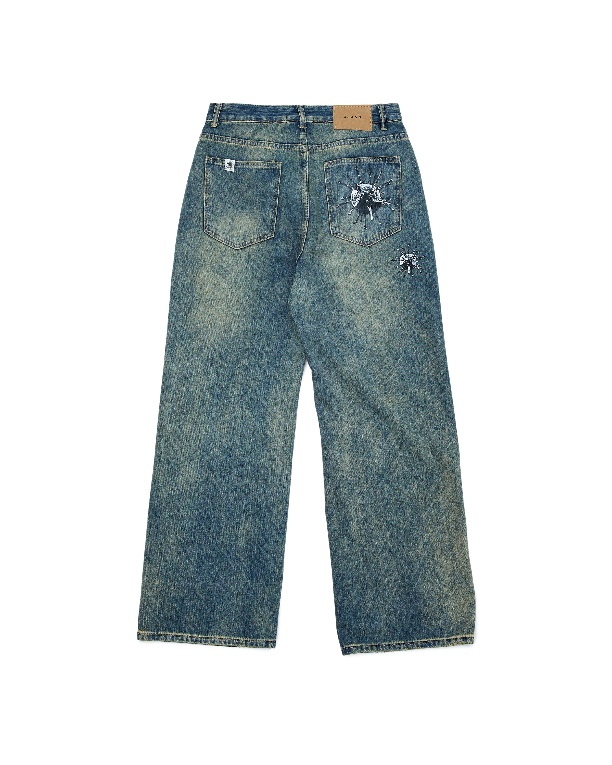 以復古水洗丹寧為基底,搭配手繪風格的病毒圖騰,展現街頭獨有的反叛態度。褲身多處細節經過精緻仿舊處理,搭配寬直筒剪裁,打造舒適俐落的輪廓感。