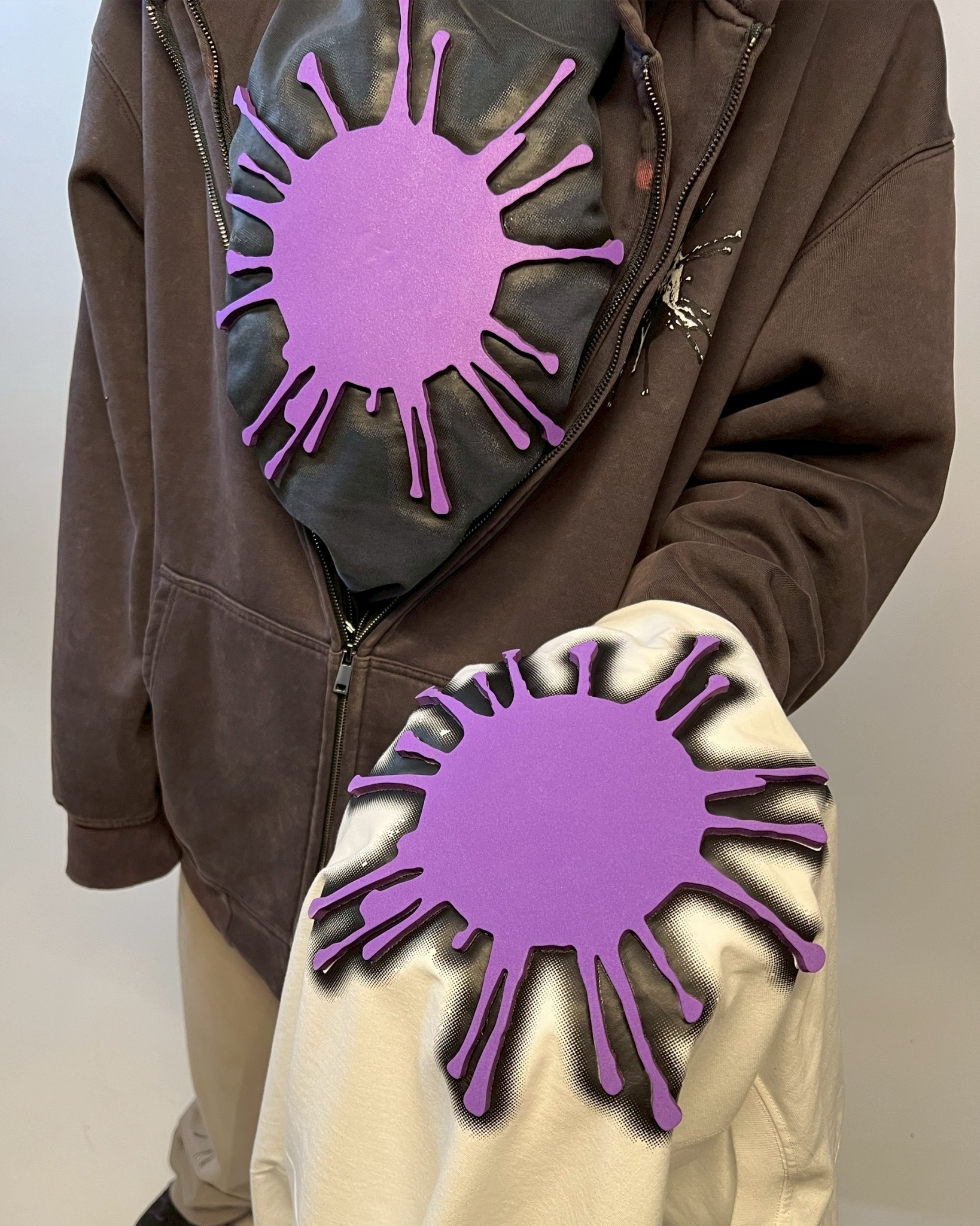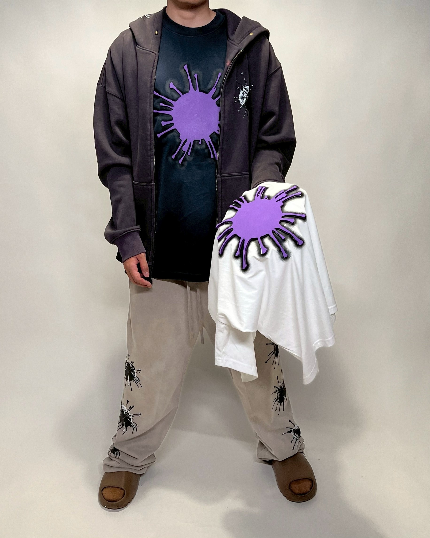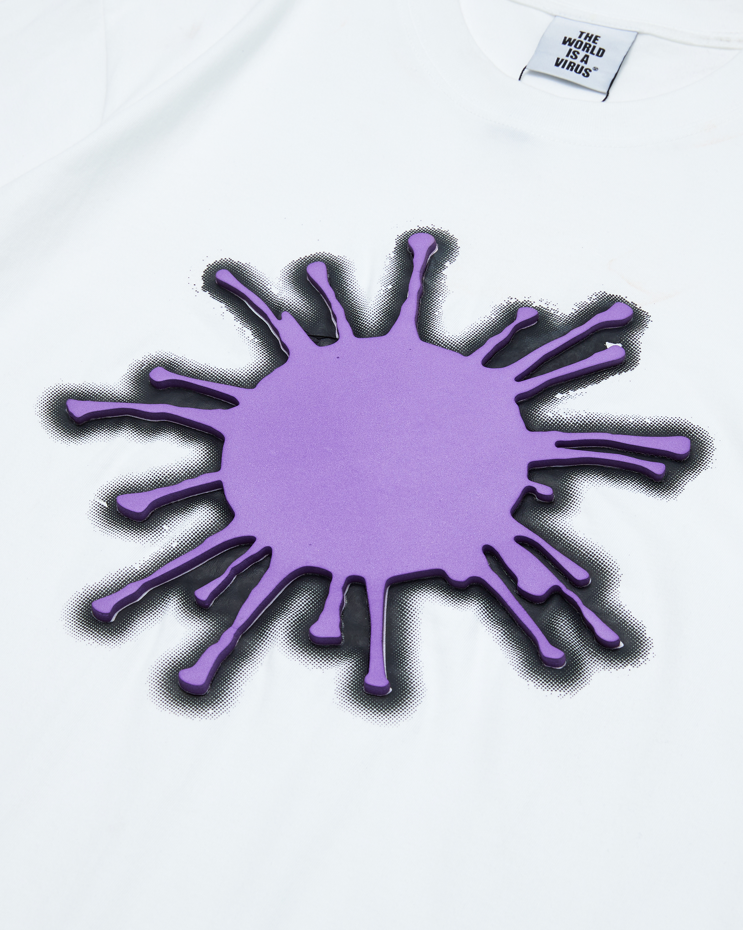 以病毒初始爆發的「源點」為靈感,打造出具有強烈象徵性的中心放射圖騰。特殊發泡工藝讓圖案不僅視覺立體,更帶來強烈的觸感存在感,彷彿正在擴散的能量體,為你的穿搭注入破格風格。