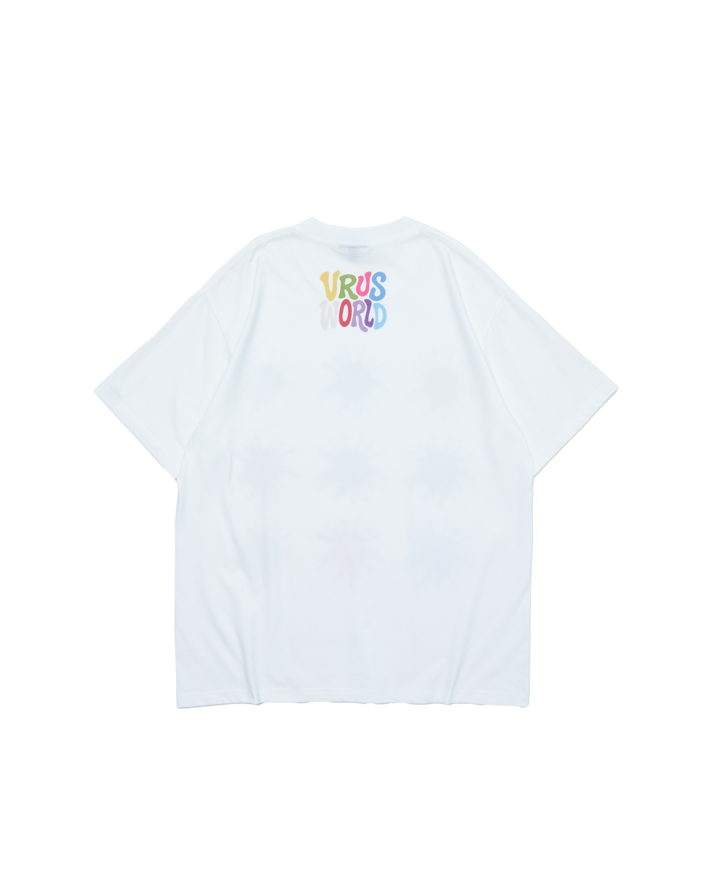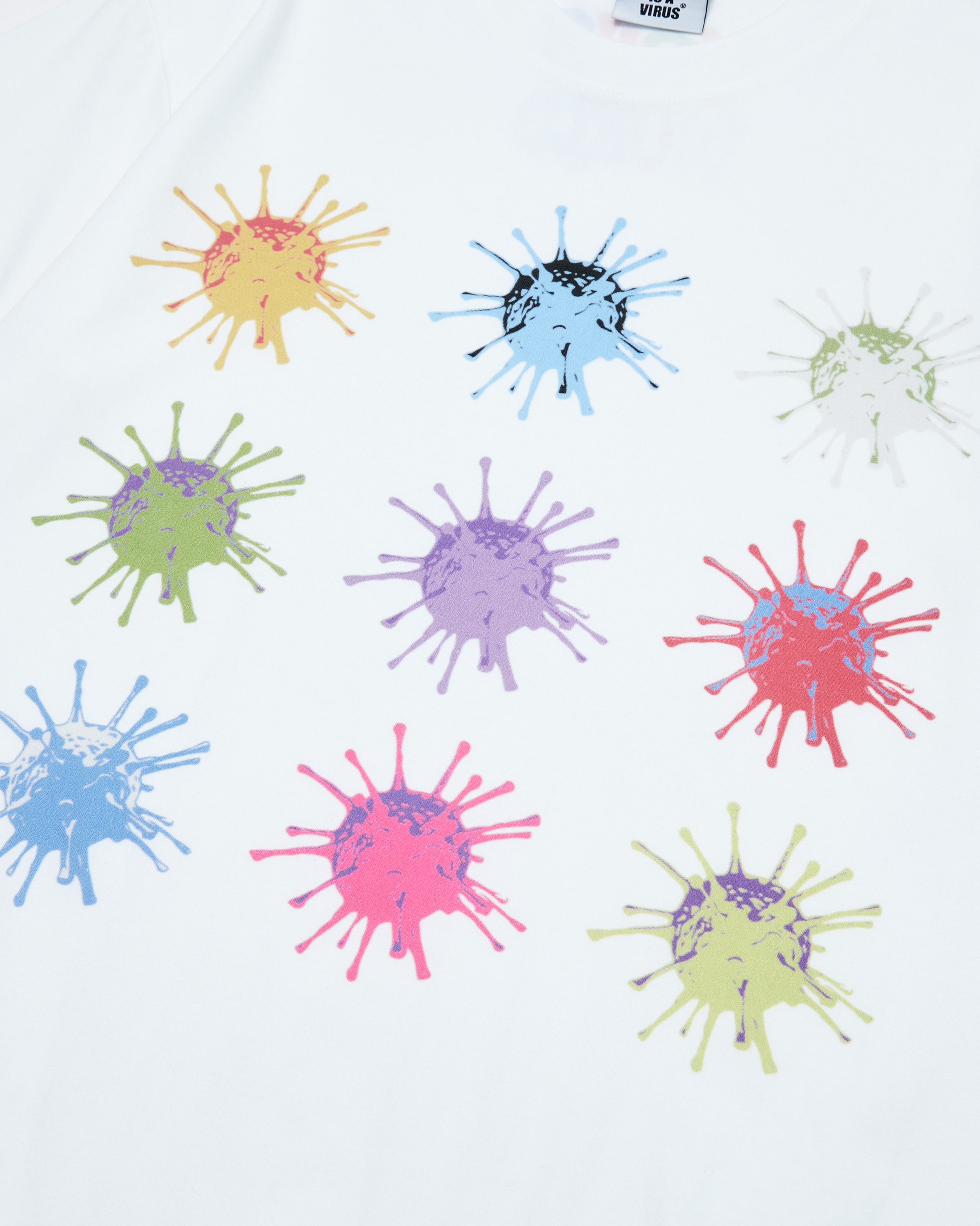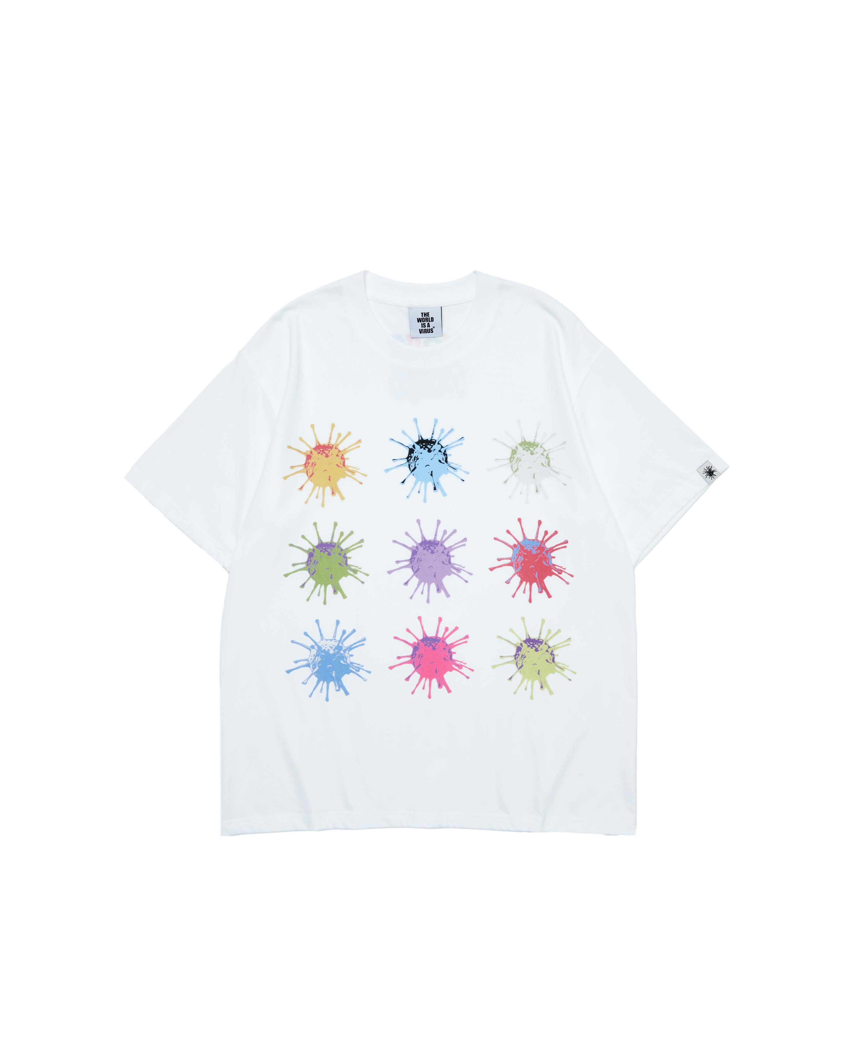 九種色彩、九種形狀,模擬病毒擴散時的瞬間噴濺,以繽紛童趣的方式重新定義恐懼與混亂。設計靈感源自街頭文化與病毒意象的結合,傳遞出「世界正在病變」的品牌核心。背後則以彩色「VIRUSWORLD」字樣收尾,細節與理念並存。