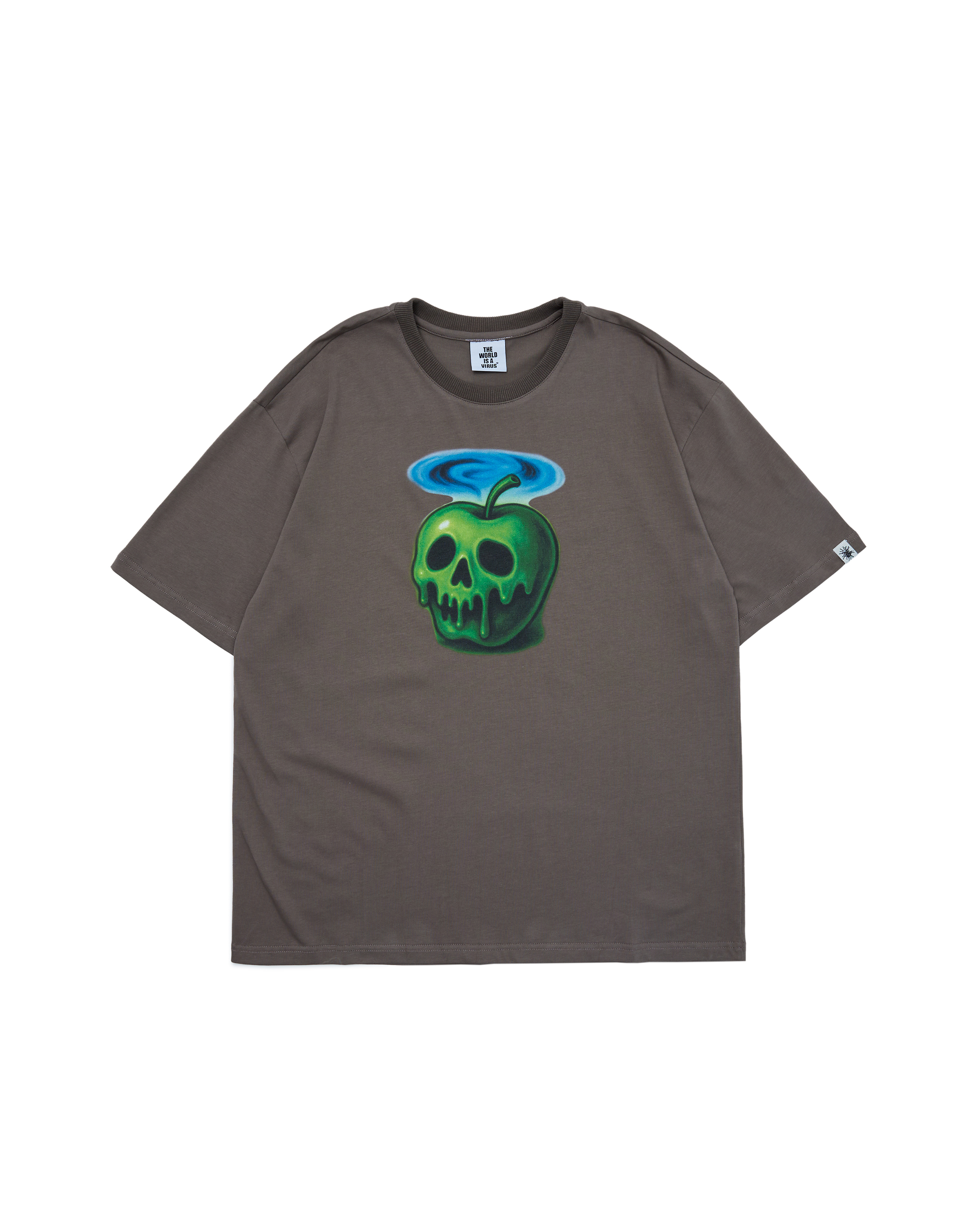 以毒蘋果為靈感,結合骷髏融化的視覺語言與藍色能量漩渦,呈現一種中毒、墮落與科技干預下的超現實感。印花採用高飽和數位直噴,搭配厚磅純棉,實穿又具有藝術收藏價值。品牌標語「THE WORLD IS A VIRUS」呼應現代社會的焦慮與反思。