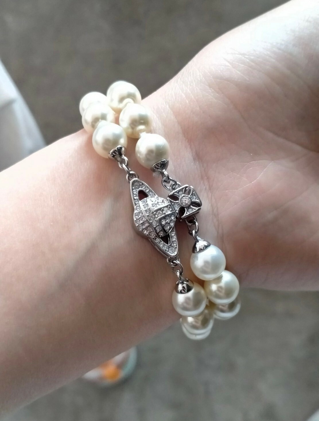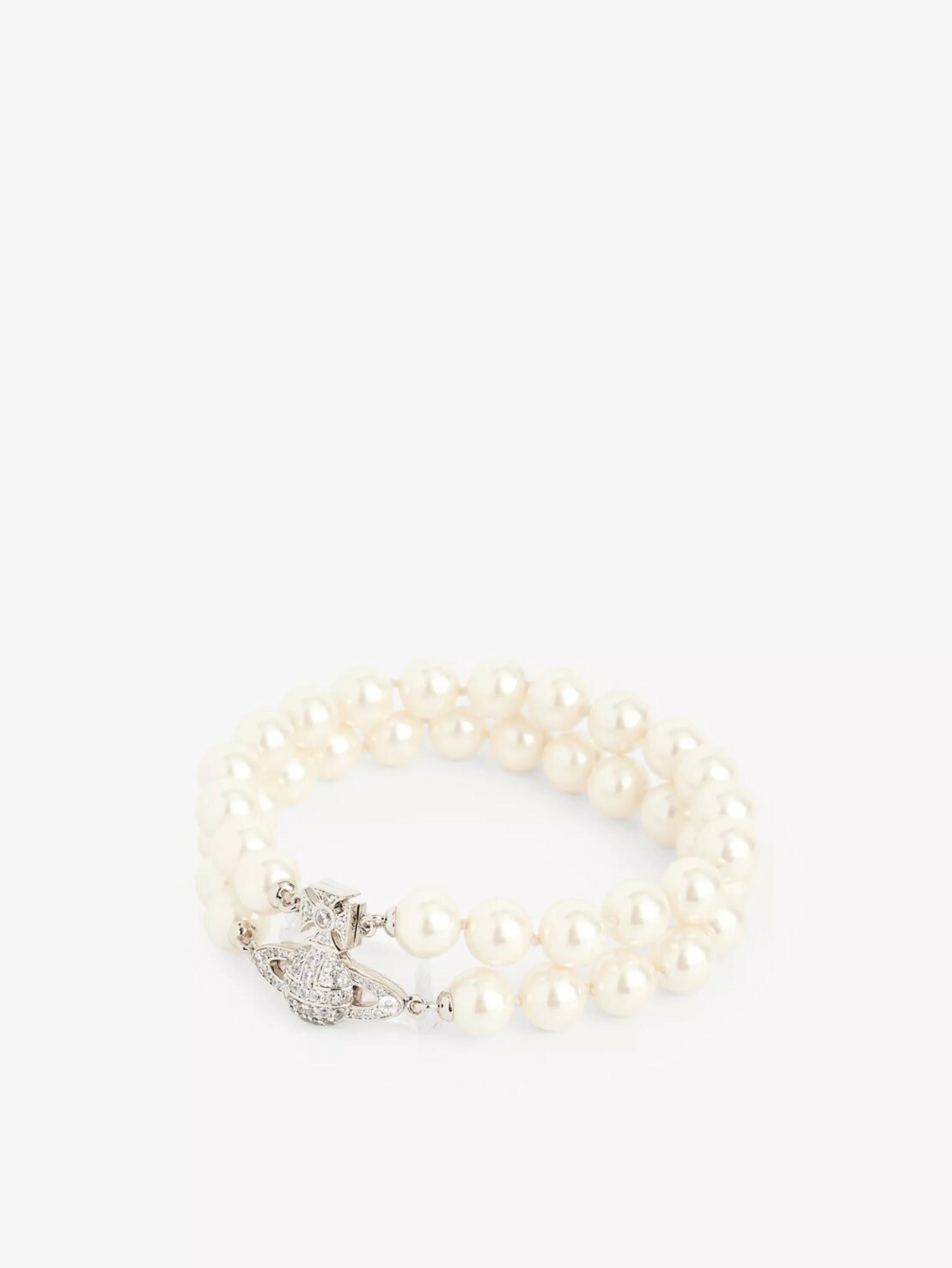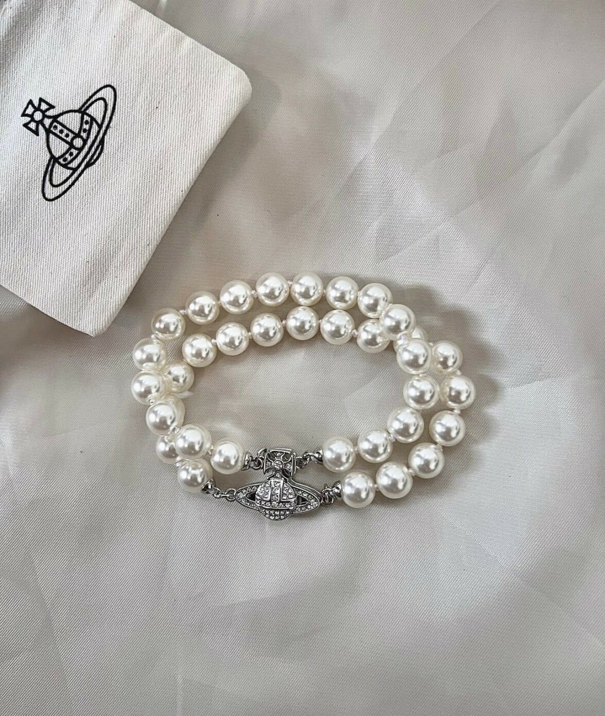 Vivienne Westwood Double Pearl Classic Saturn Logo Diamond Bracelet Queen Mother West