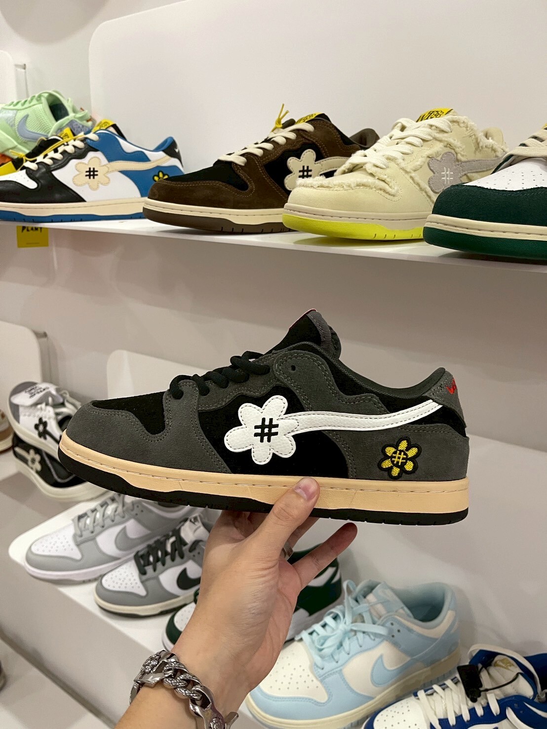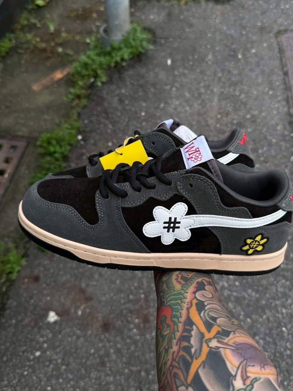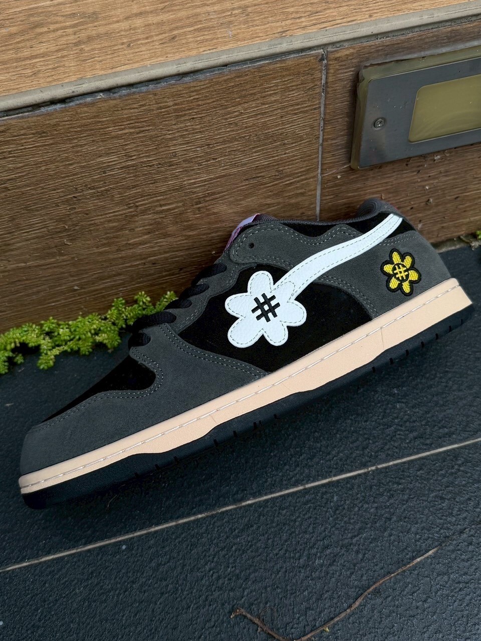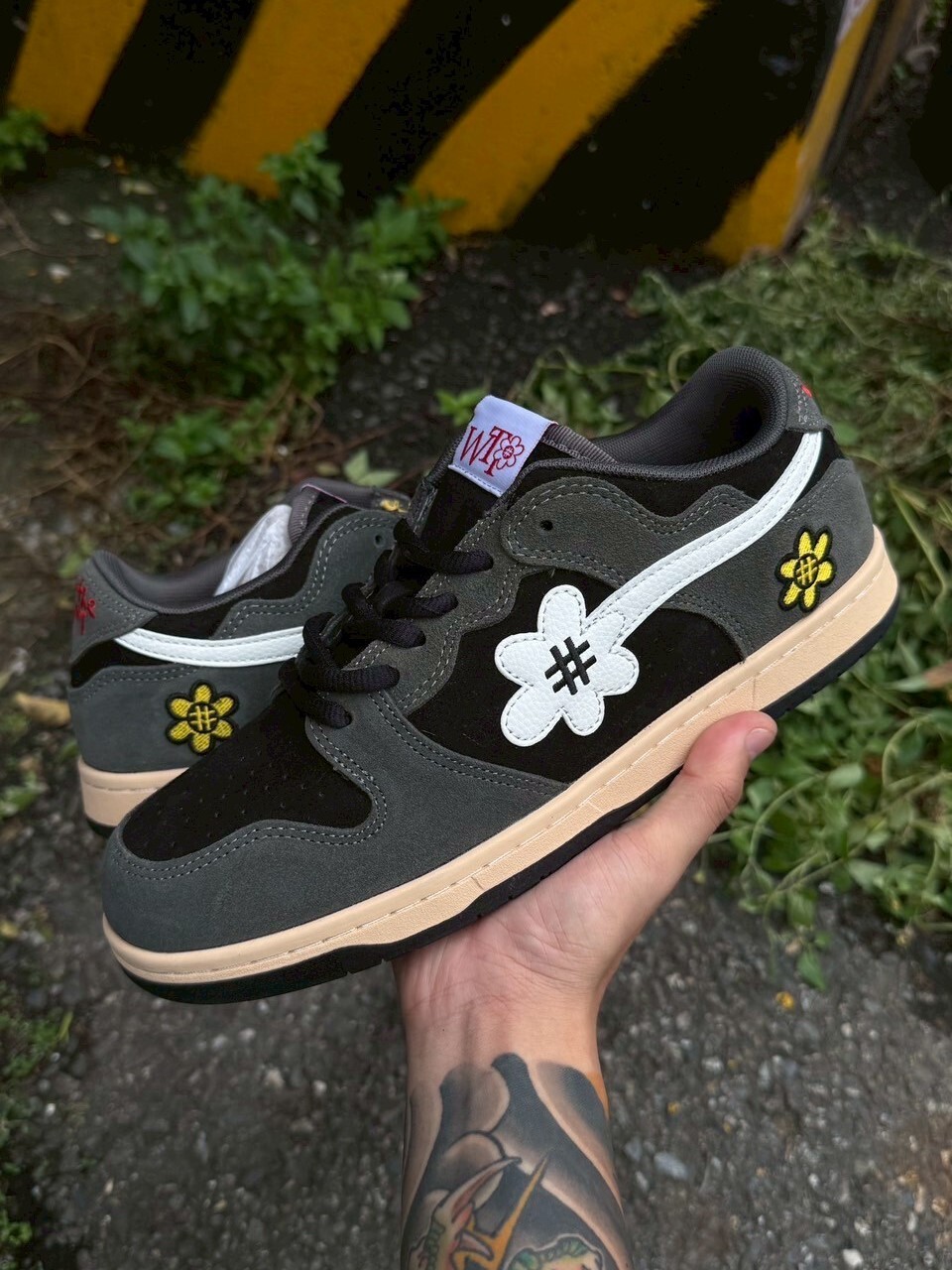 WATER THE PLANT textured black and gray suede embroidered small flower shoes WTP Catus