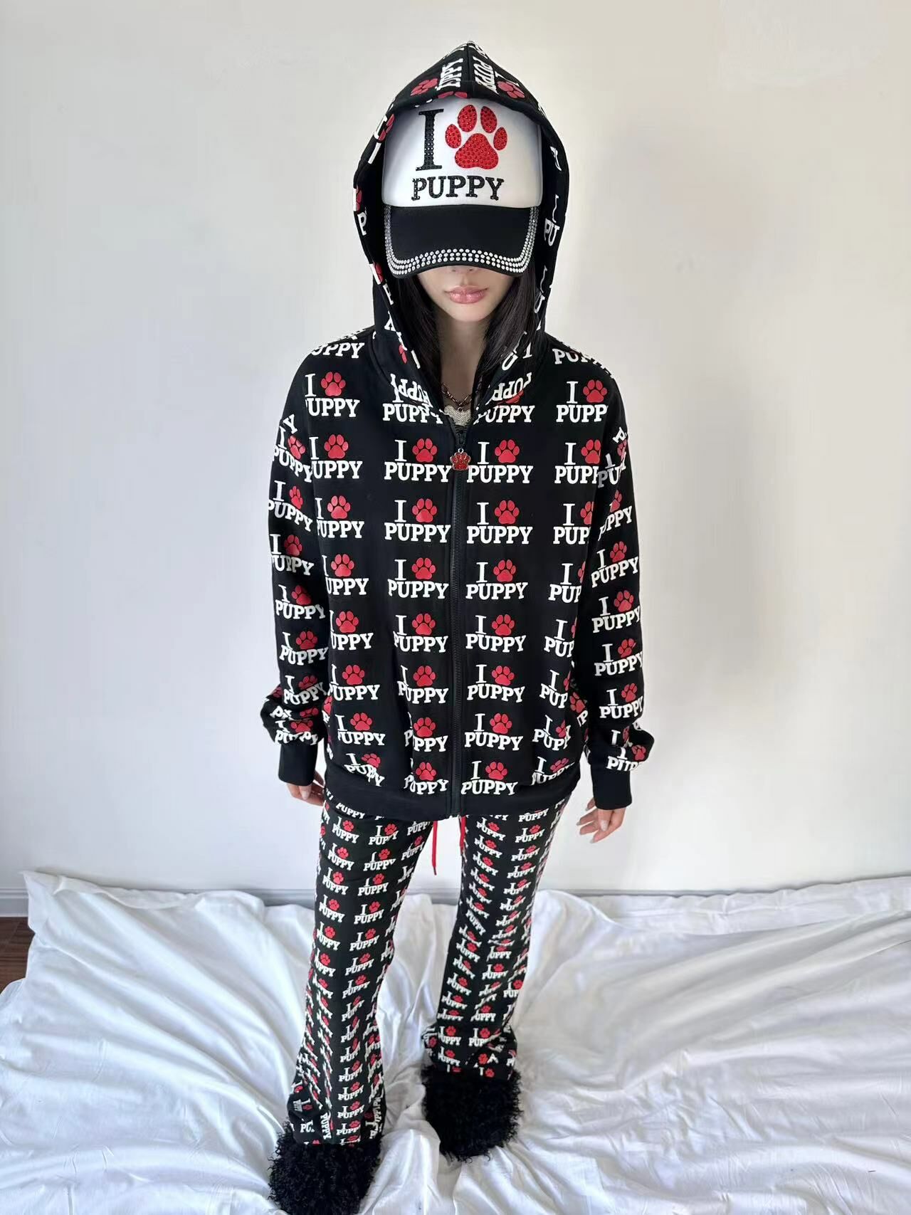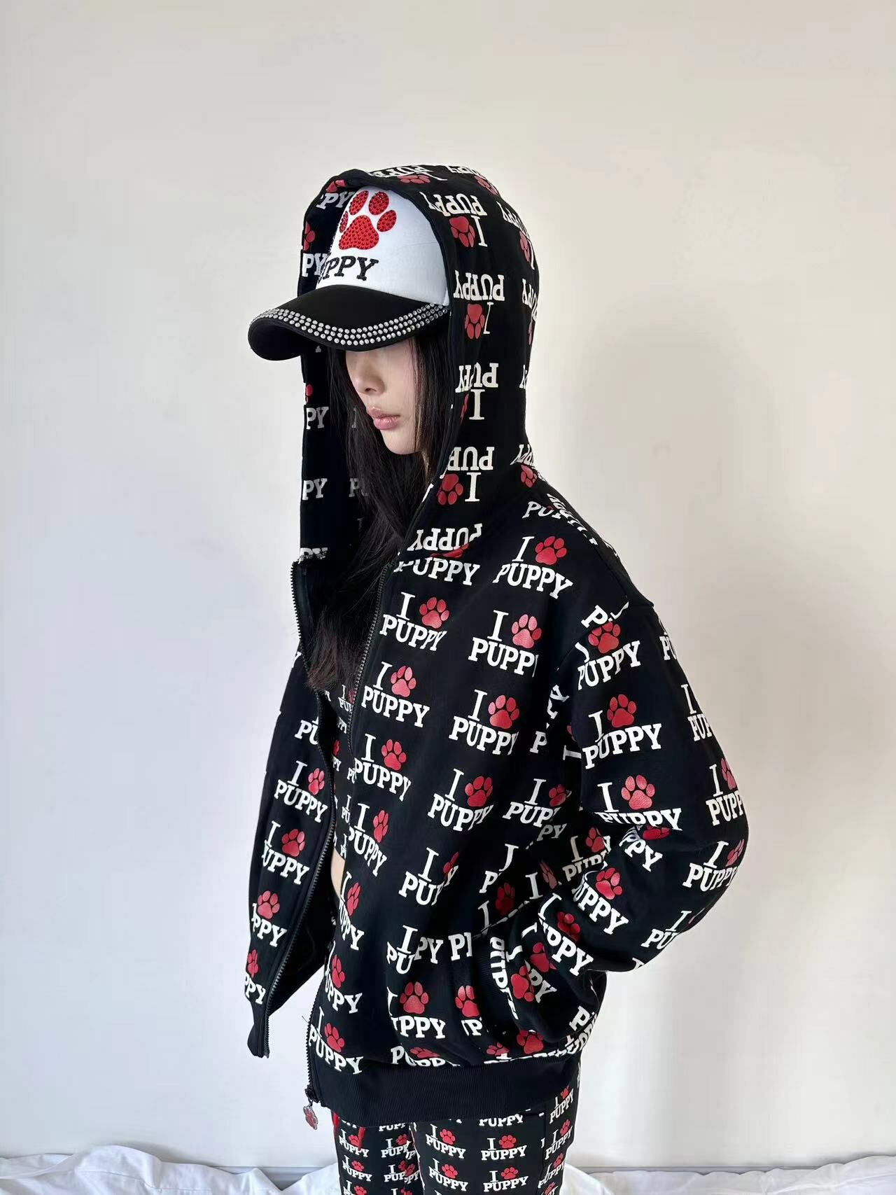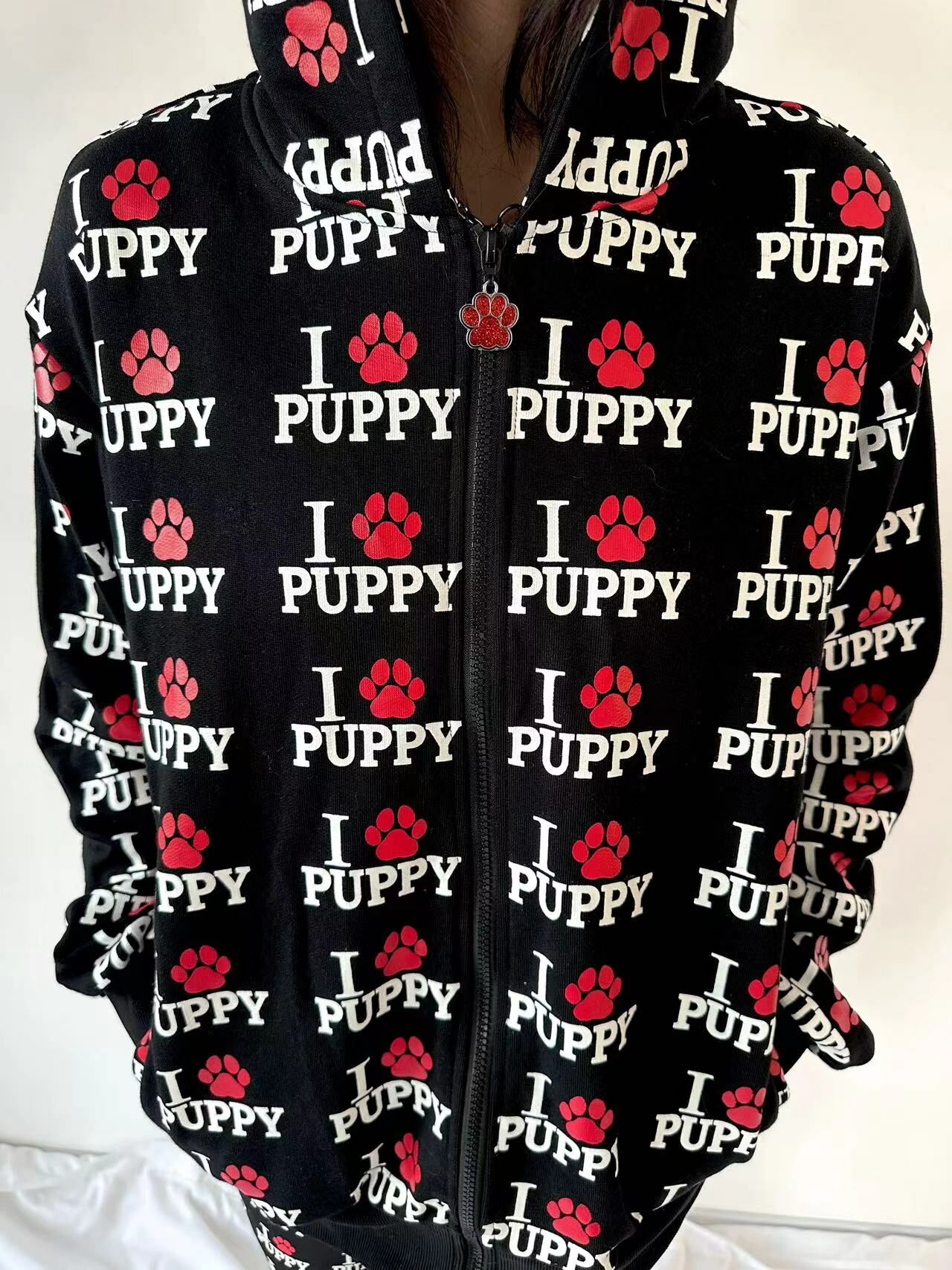 ArtByTastybabe 滿版我愛小狗 重磅 寬鬆連帽外套 黑色