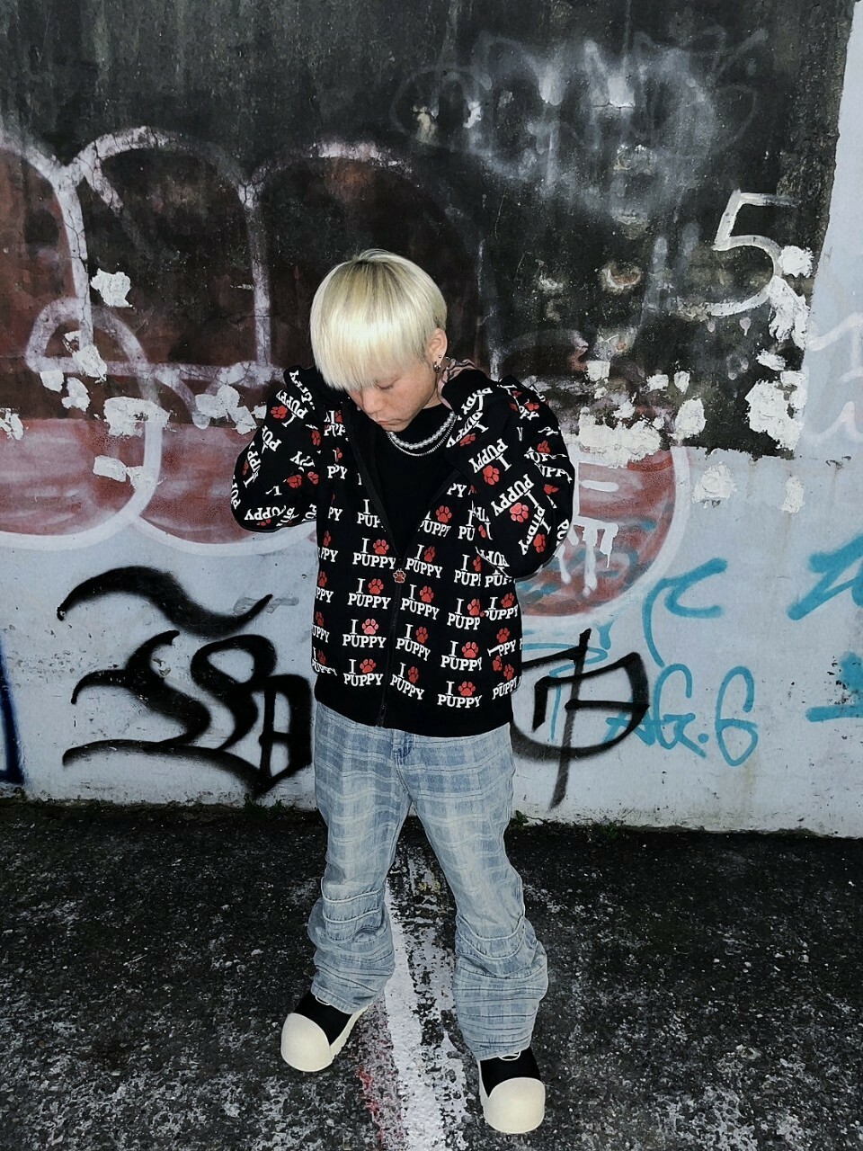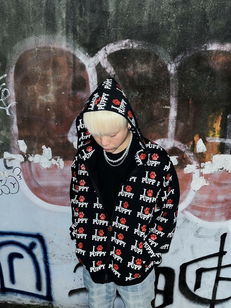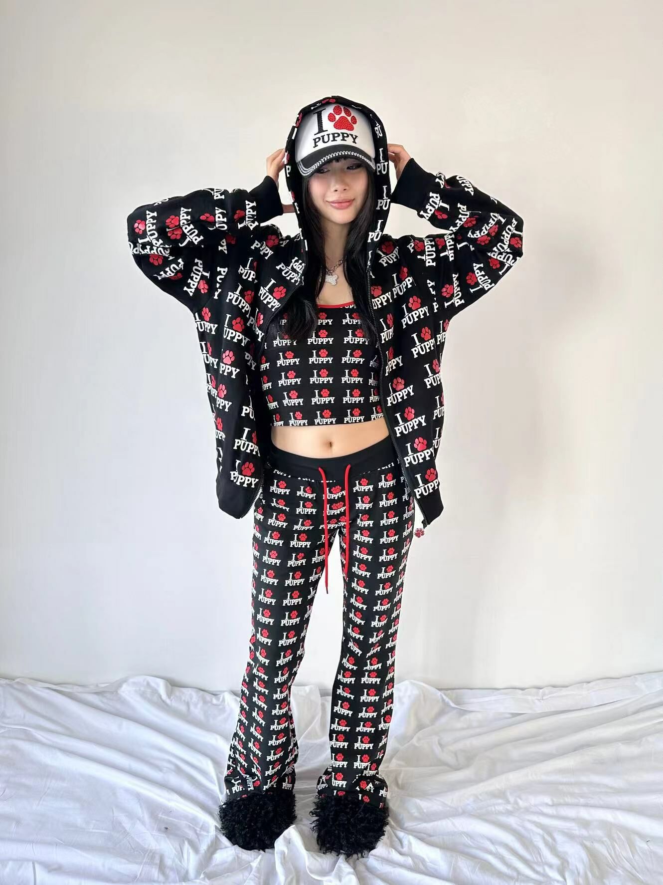 ArtByTastybabe 滿版我愛小狗 重磅 寬鬆連帽外套 黑色
