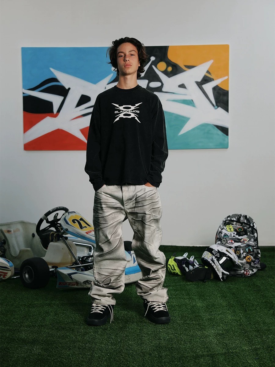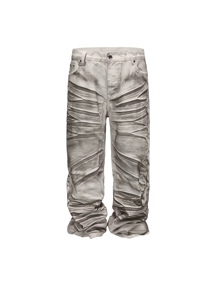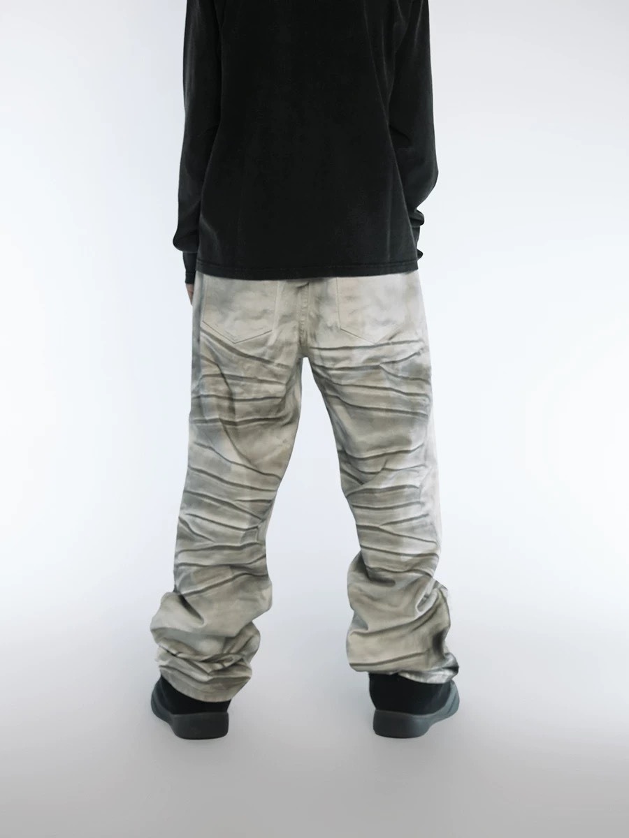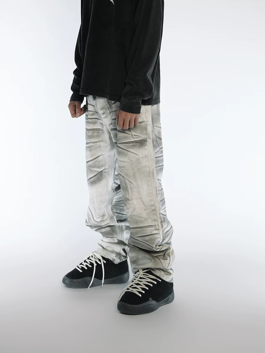 BLACK8MOB 水洗髒染 做舊捏褶 直筒長褲