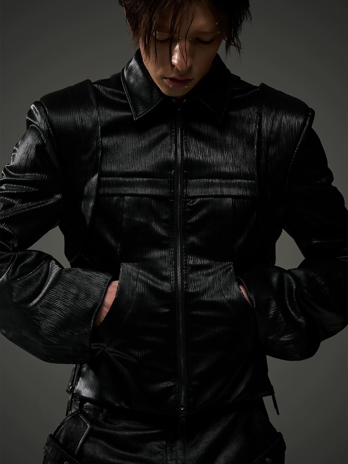 BLINDNOPLAN 短寬廓形 波紋拼接 立領皮衣外套