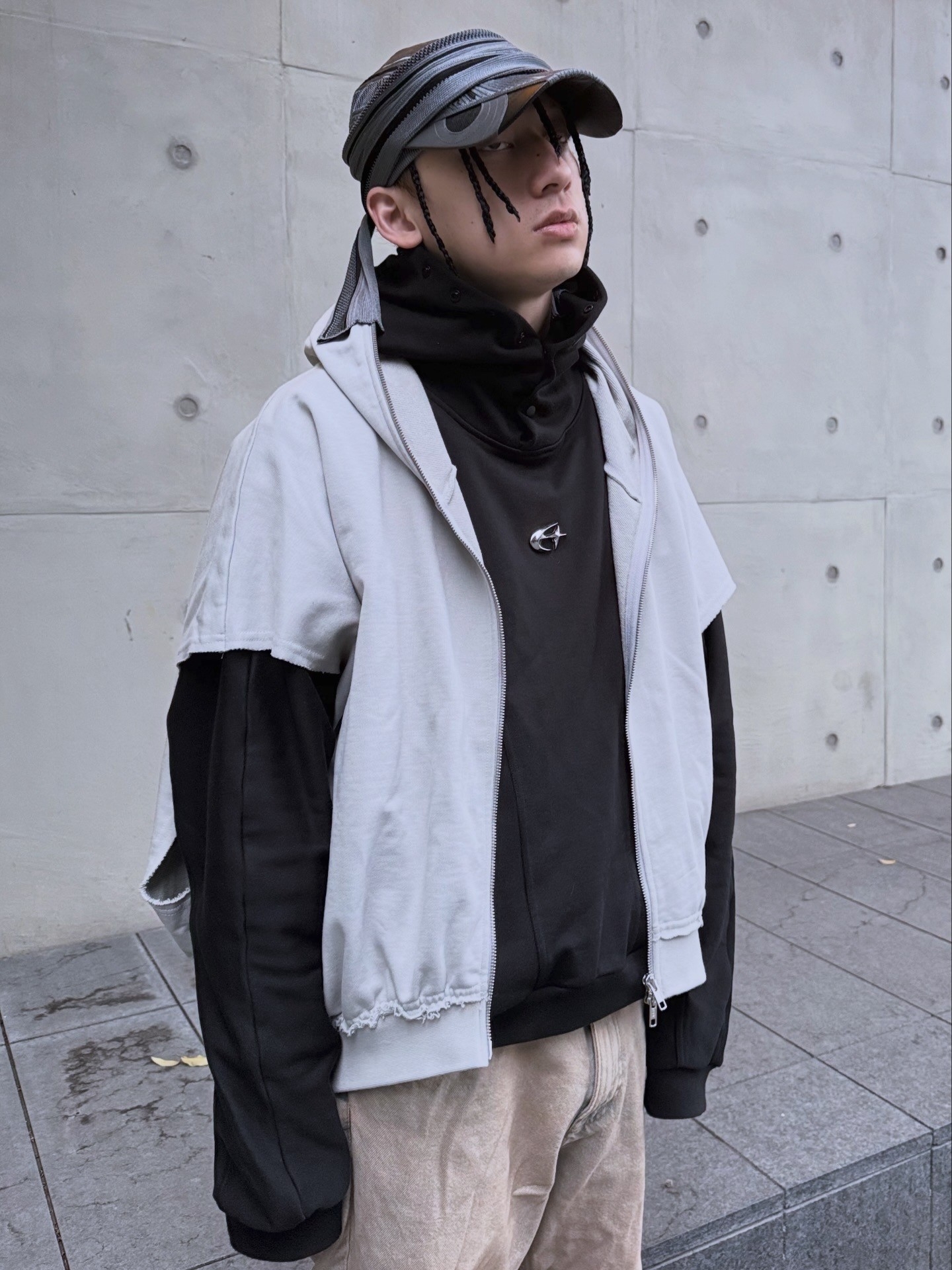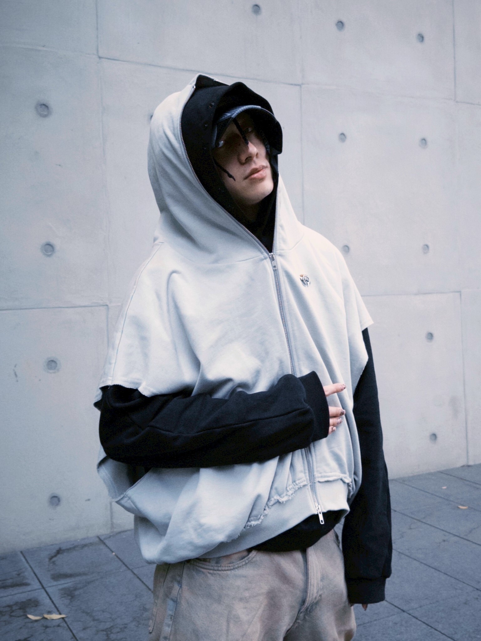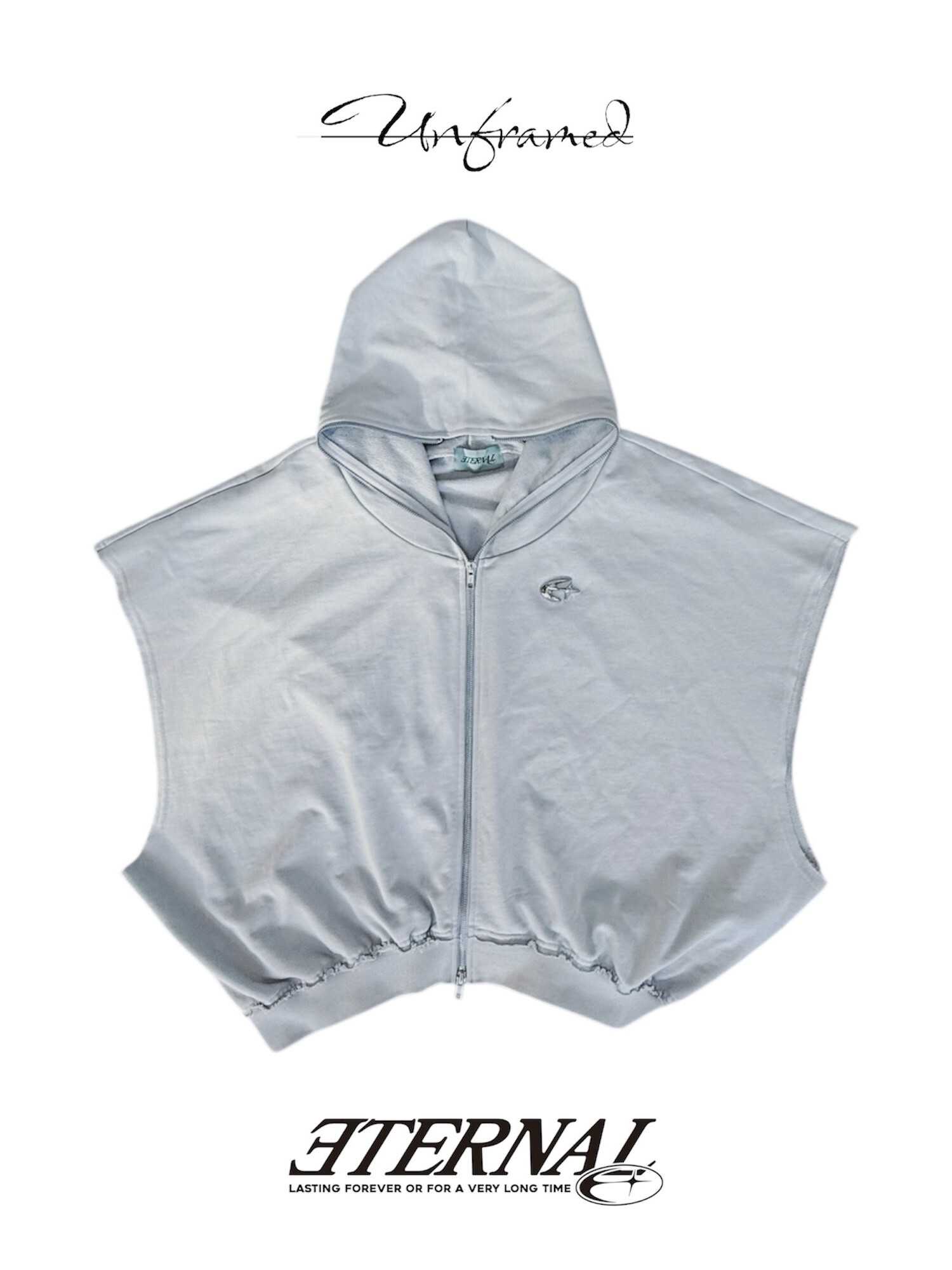 ETERNAL 解構蝙蝠袖 金屬Logo水泥灰 連帽雙拉鏈背心外套