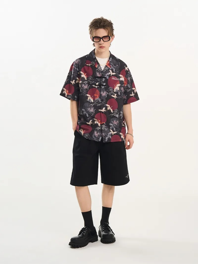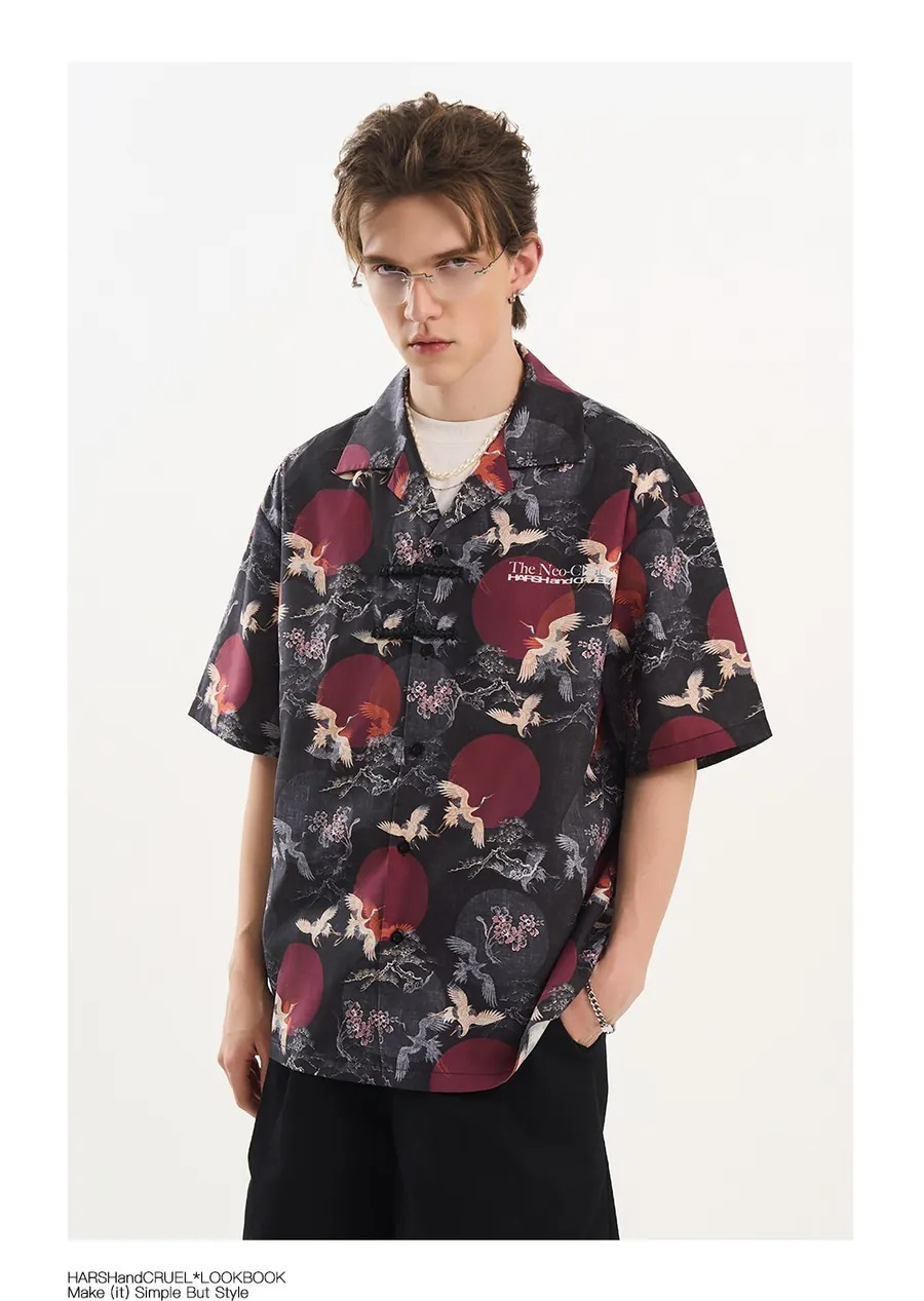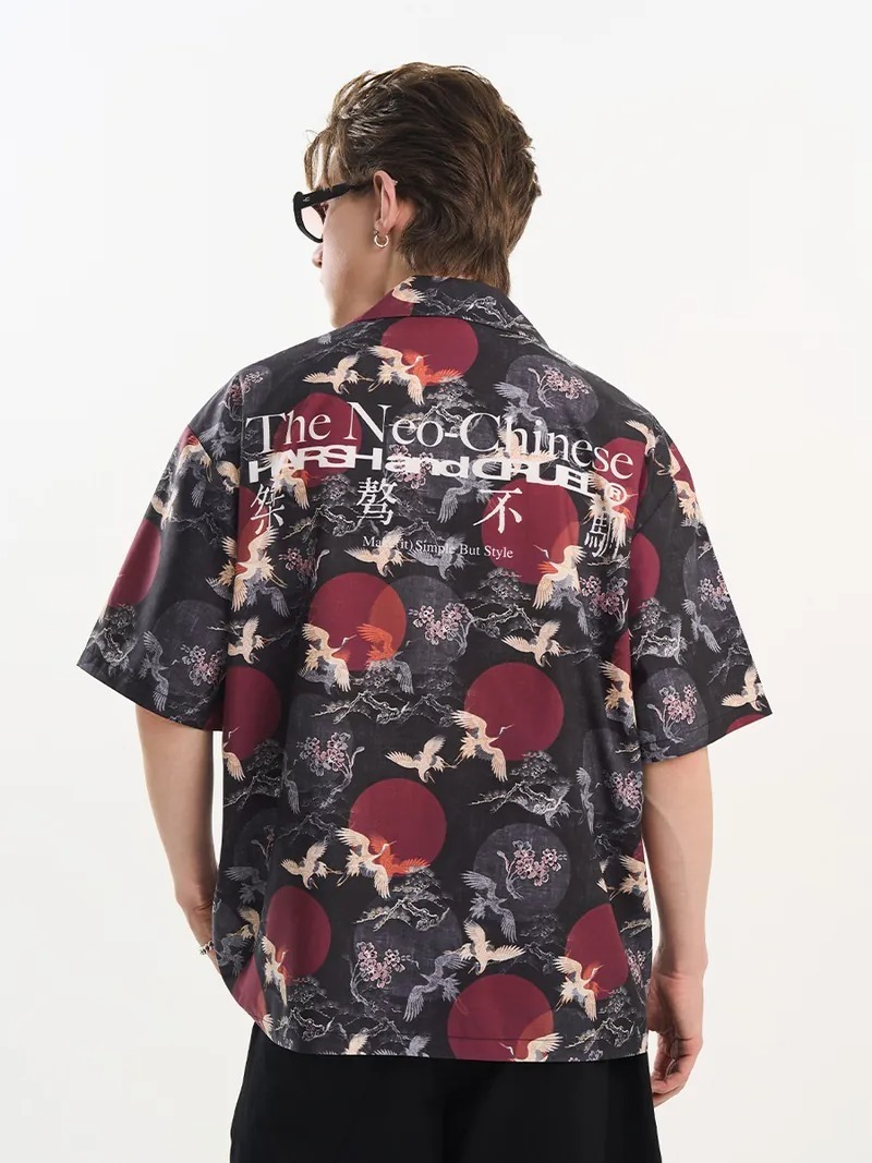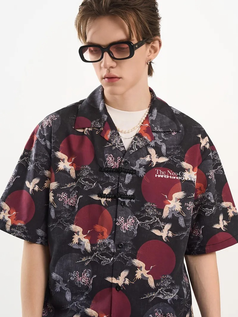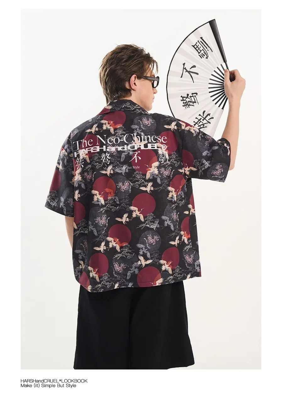 Harsh and Cruel 24SS 中國風滿版紅日仙鶴古巴領短袖襯衫 HL242070188