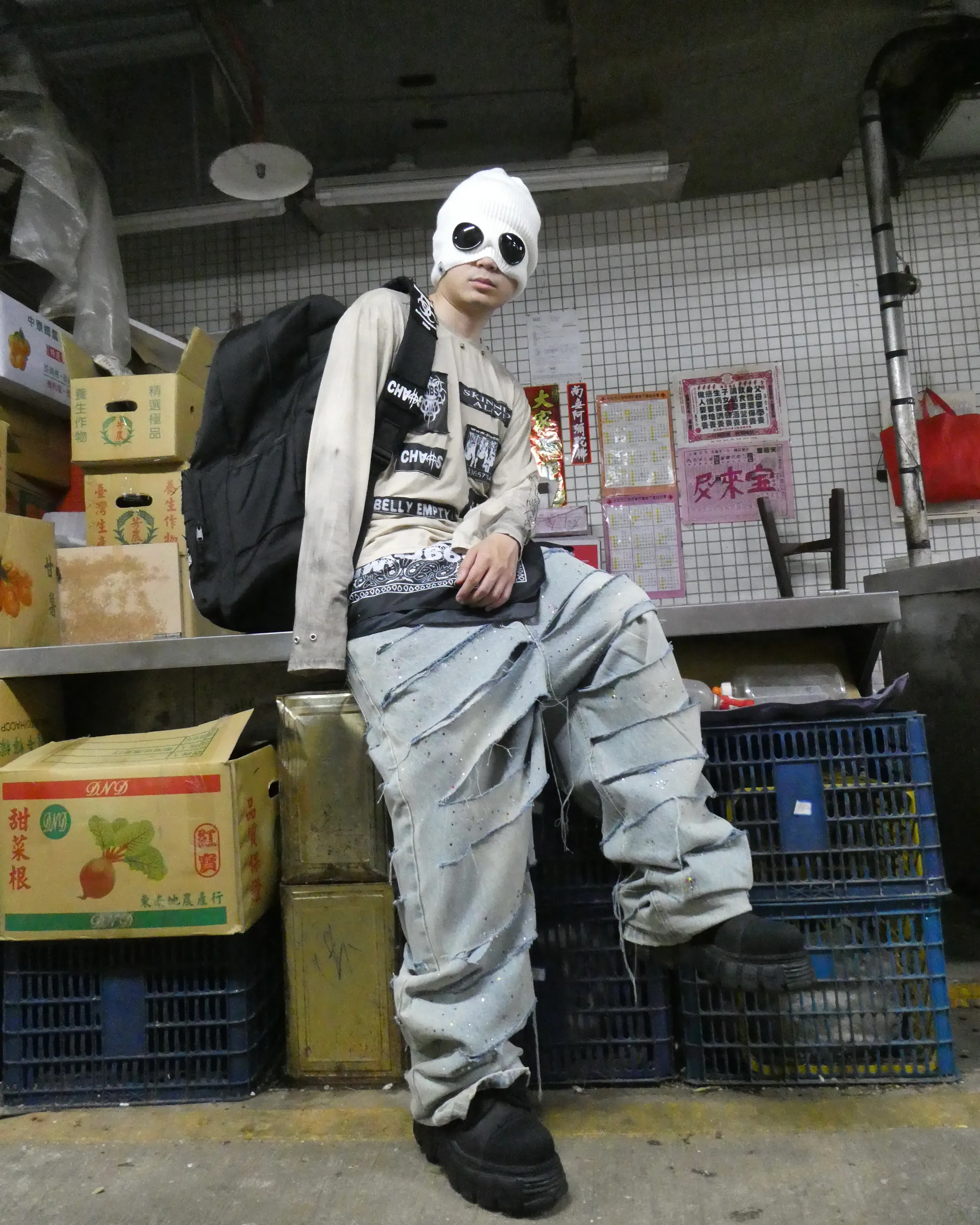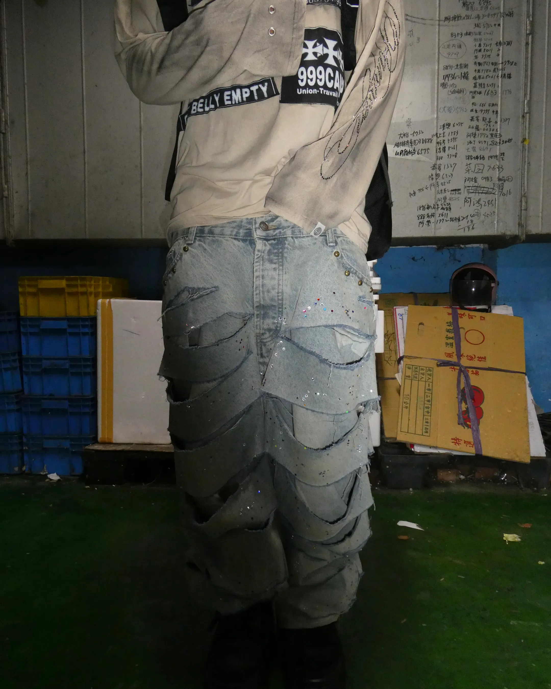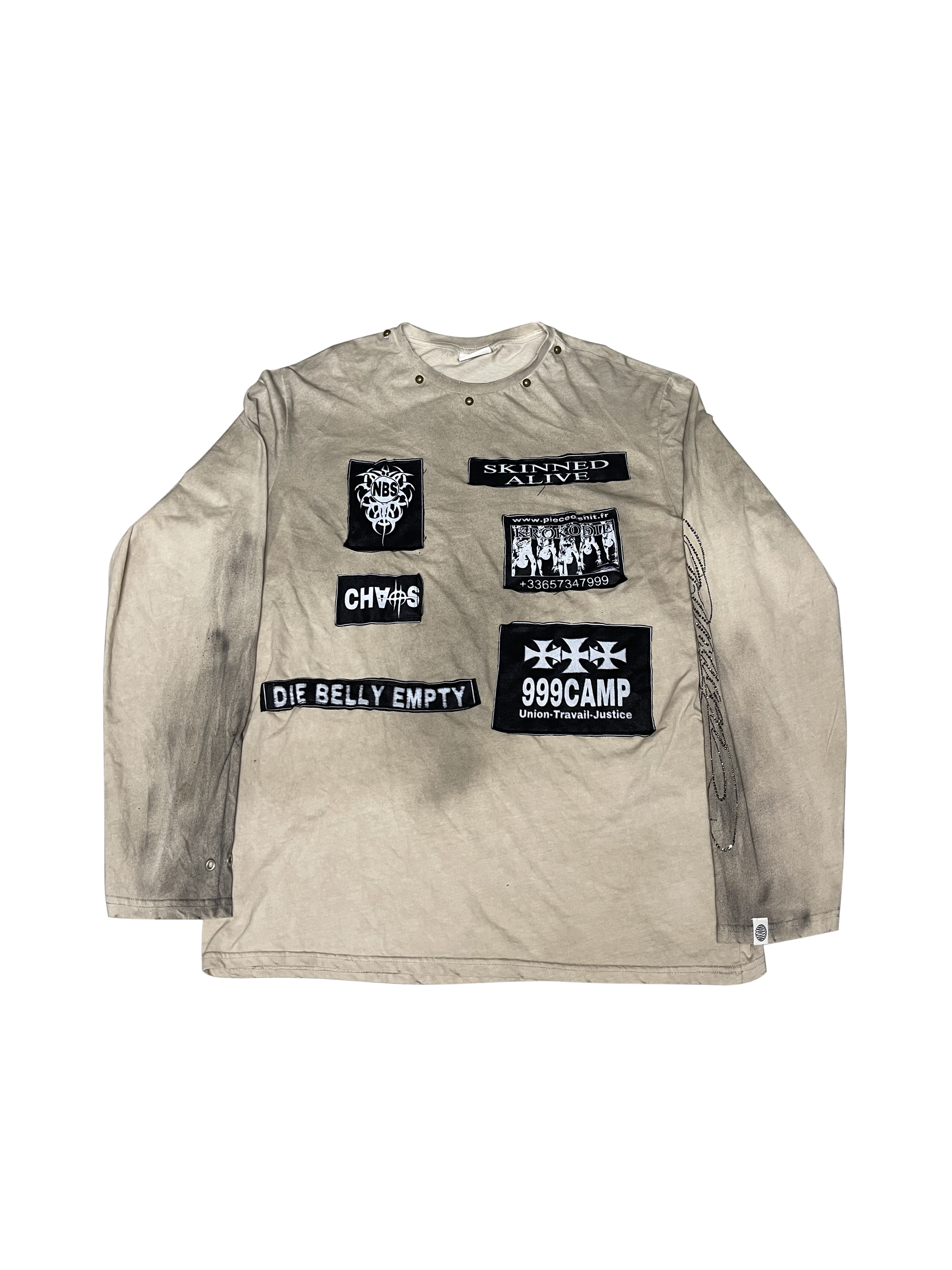 這件長袖Tee 以低飽和仿舊色為基底,胸前與手臂佈滿「CH∄S」、「999CAMP」、「BELLY EMPTY」等地下語彙貼布,宛如一場靜默的街頭抗議。
